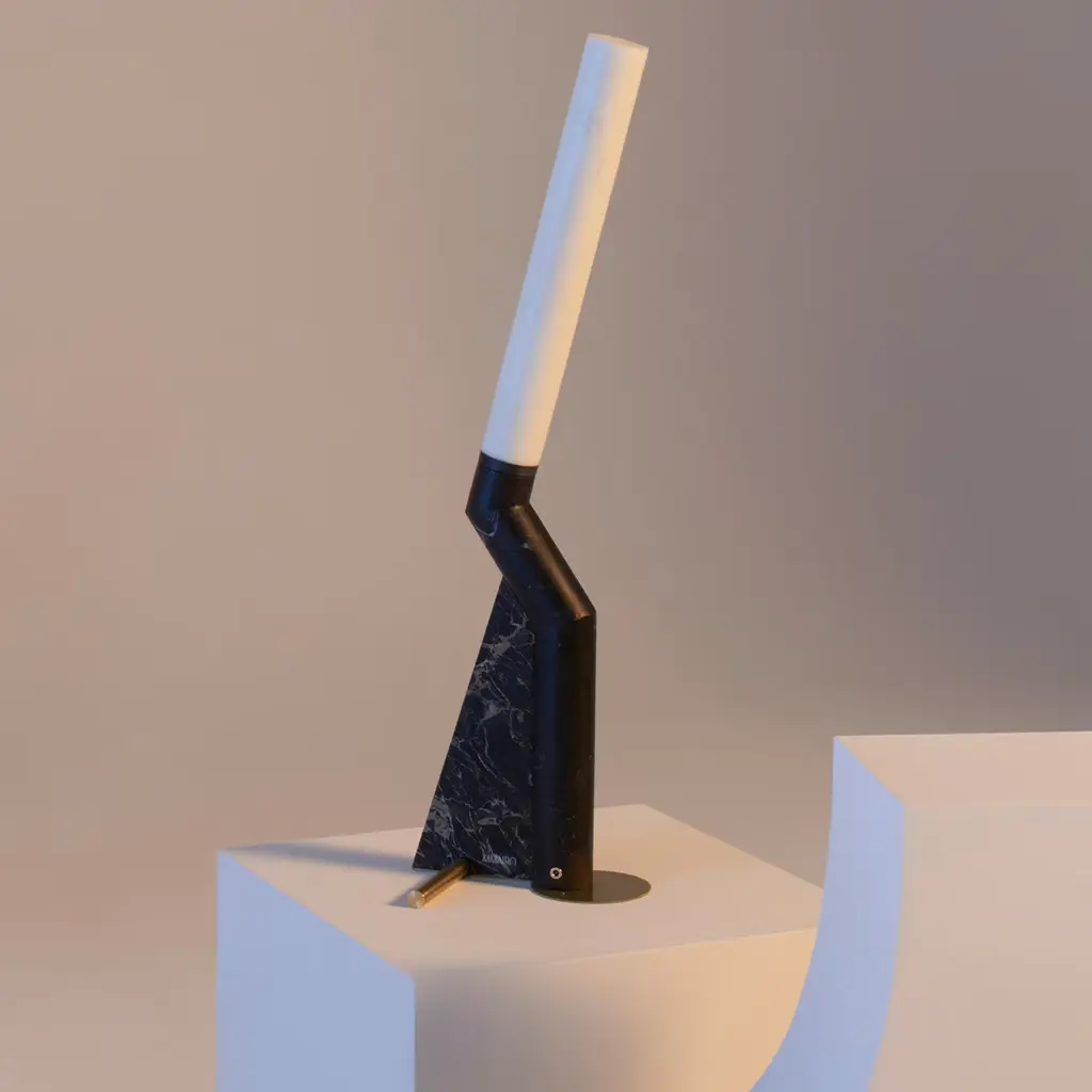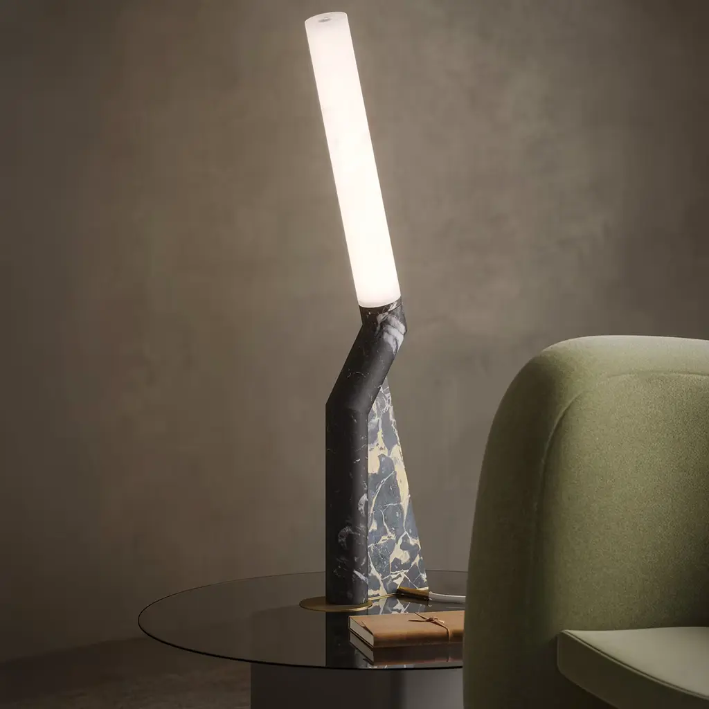Inspired in its shape and tones by graceful herons, this one-off table lamp exudes pure sculptural flair. A thin brass base sustains its elongated silhouette, which comprises a side slab in elegant black Portoro marble and a tubular frame with a sculpted profile alternating black Marquina and white Michelangelo marbles. The light source encased within radiates through the precious stone creating an evocative effect. UL and CE certifed, it comes without a power supply and dimmer switch. Please note that marbles and stones are natural materials and they can differ also if coming from the same quarry or the same block. The product shown may differ from purchased items. Every piece is unique.