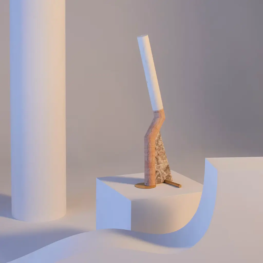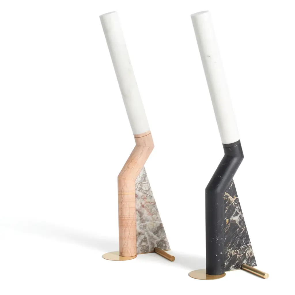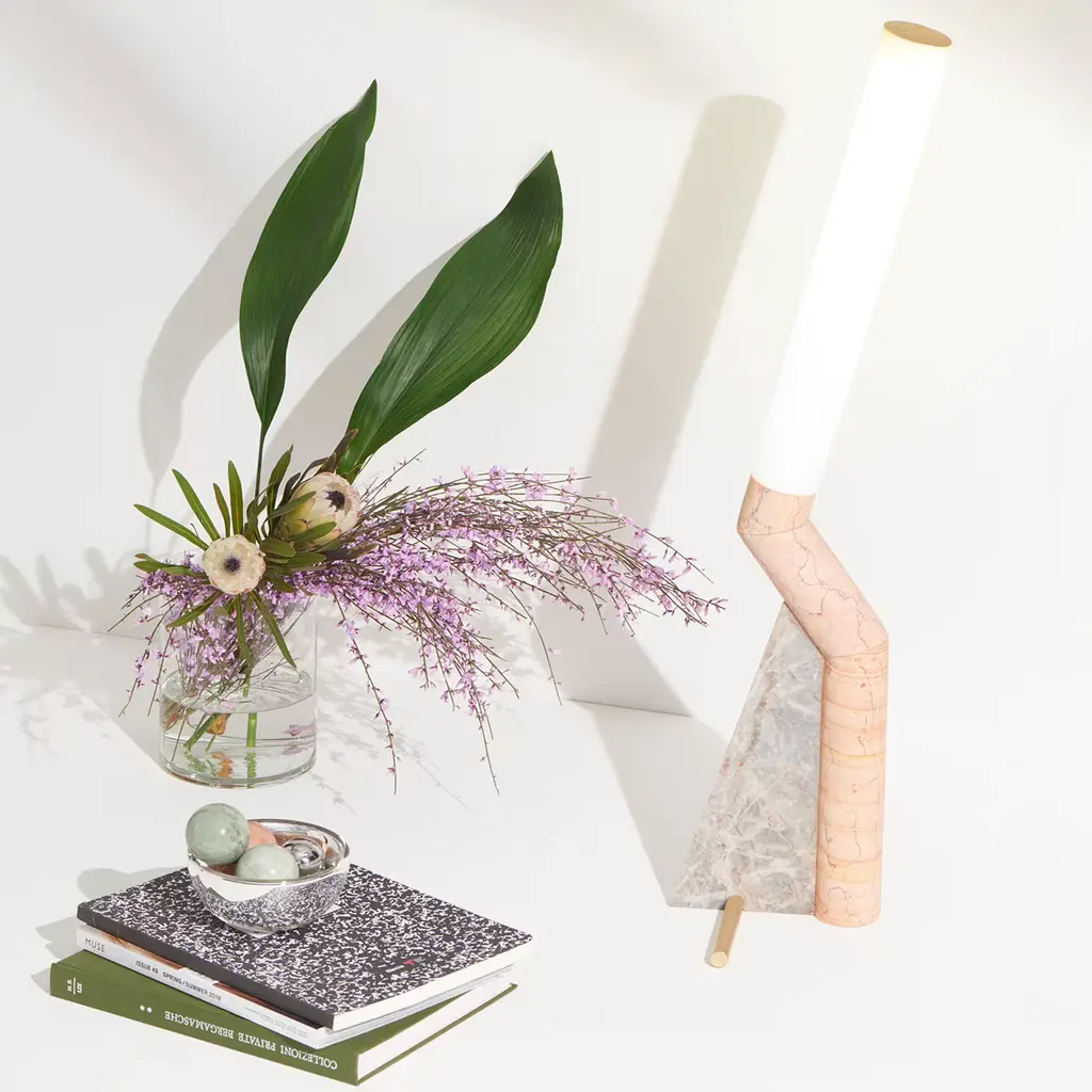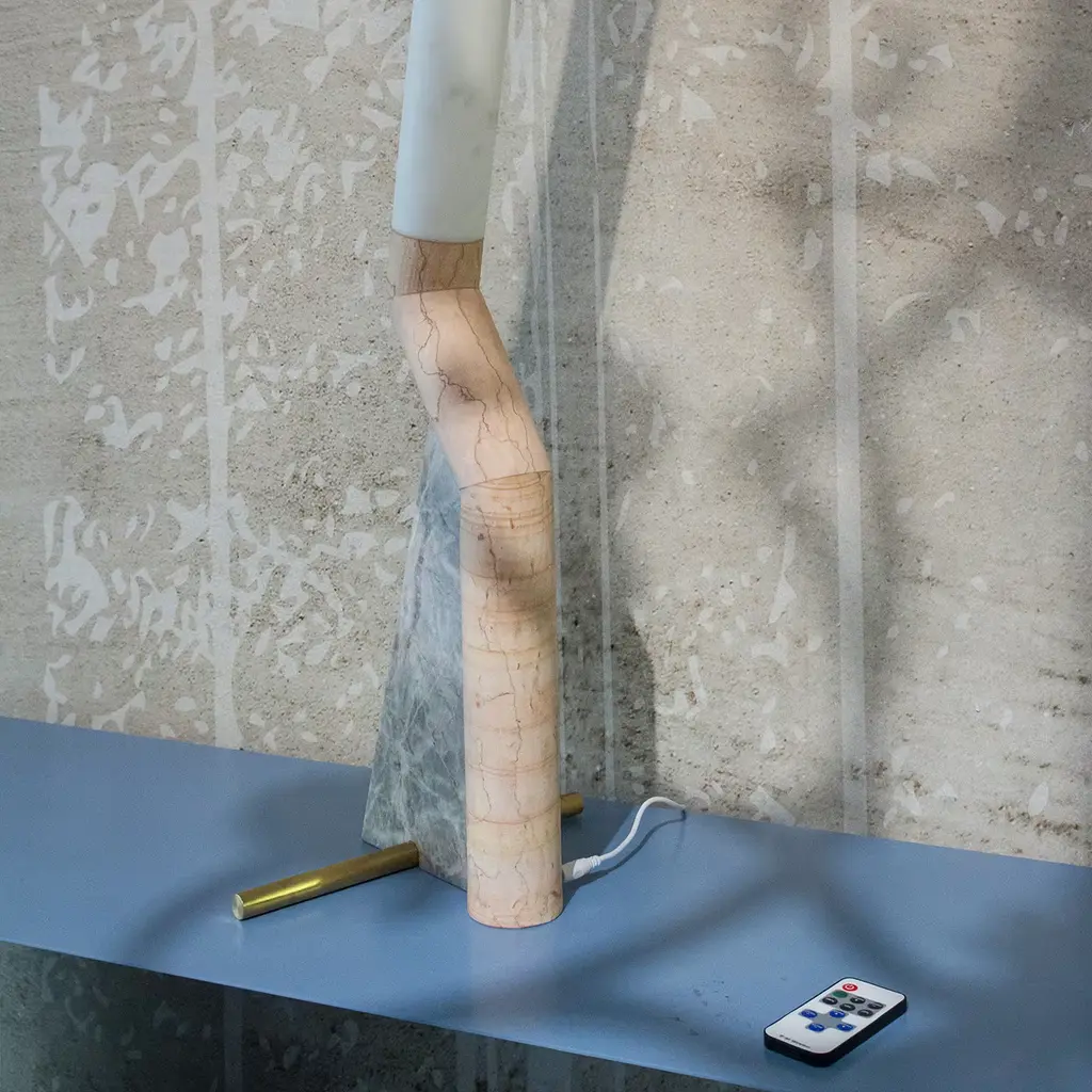Herons and their delicate color palette inspired the sculptural design of this table lamp. Sitting on a luminous brass base, its elongated body consists of a tubular, sculpted frame combining white Michelangelo and pink Egyptian marbles for a feminine shell diffusing the light radiating from within. A side, flat element in Fior di Pesco Carnico marble - distinguished by gray and green veining - seals the look. Delivered without a power supply and dimmer switch, the lamp is UL and CE certified. Please note that marbles and stones are natural materials and they can differ also if coming from the same quarry or the same block. The product shown may differ from purchased items. Every piece is unique.