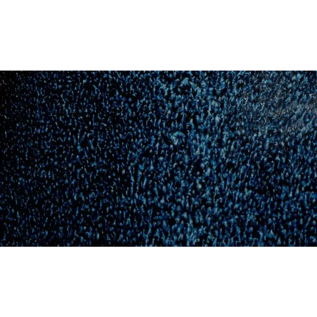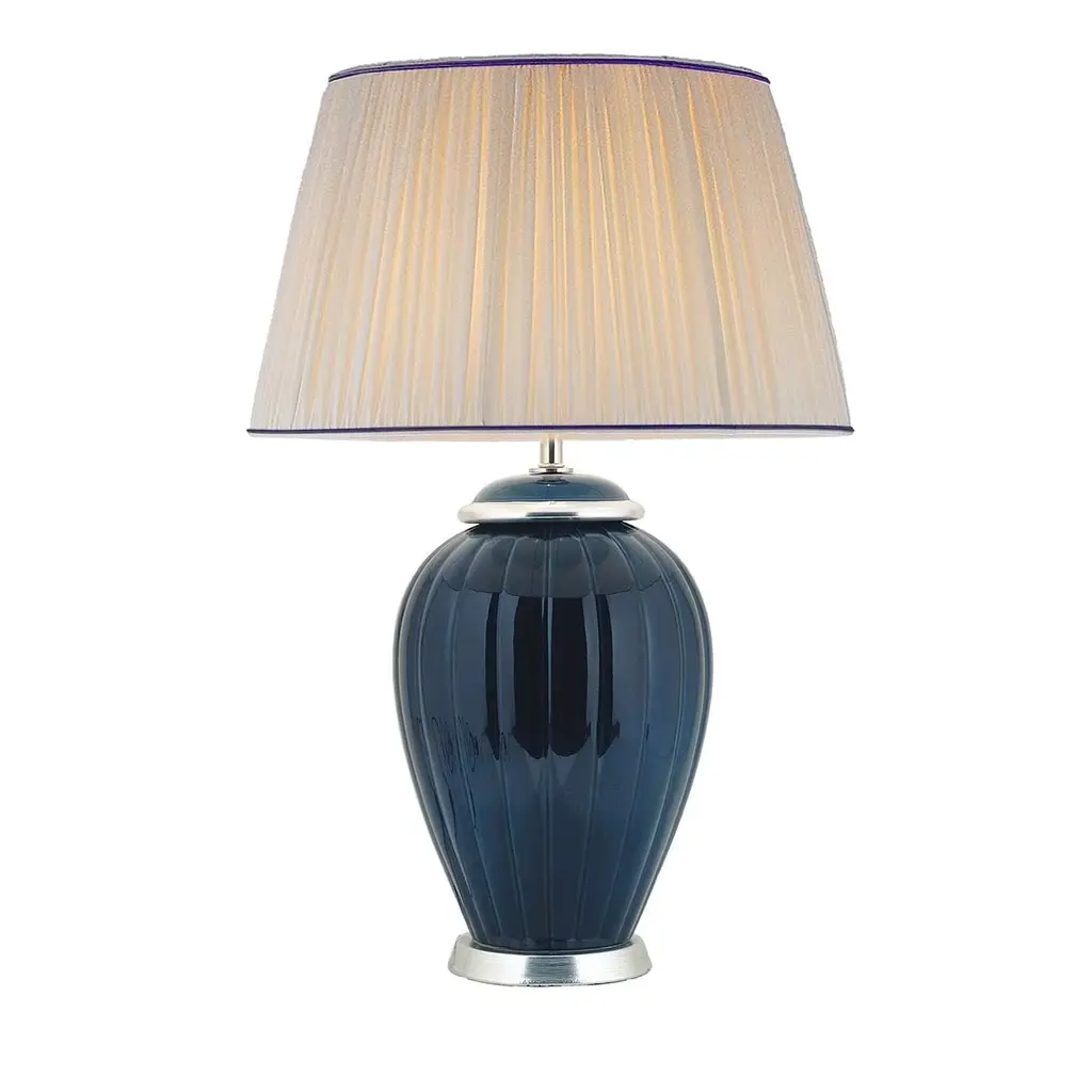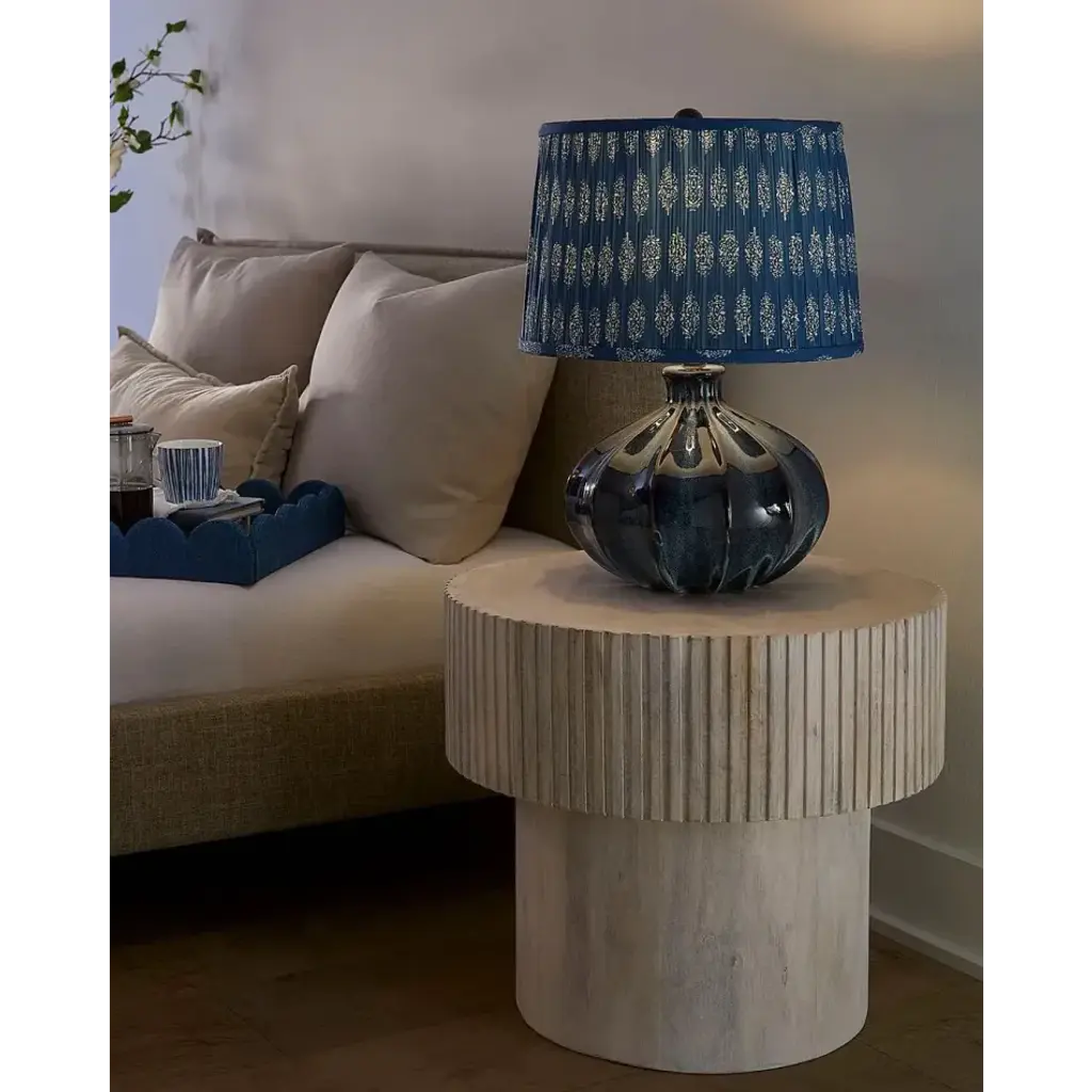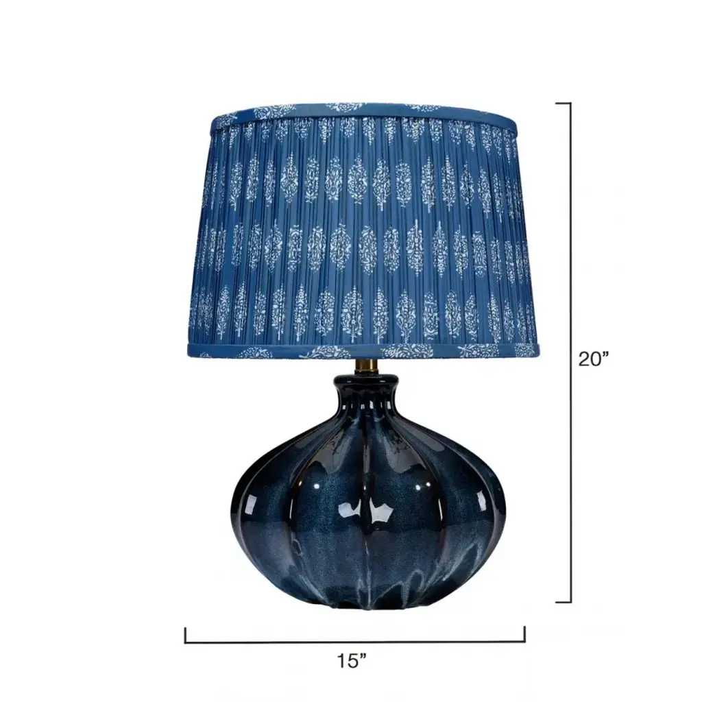 A deep blue reactive glaze creates a striking look when hand-applied to the softly curved, gourd-shaped base of this charming table lamp. The technique requires an expert hand to achieve this depth of tone and color. An open-cone cotton shade with a jaunty pattern and trimmed edges keeps the look casual, while a ceramic ball finial and gold-toned hardware preserve its elegance. We love it in the kitchen or family room.
