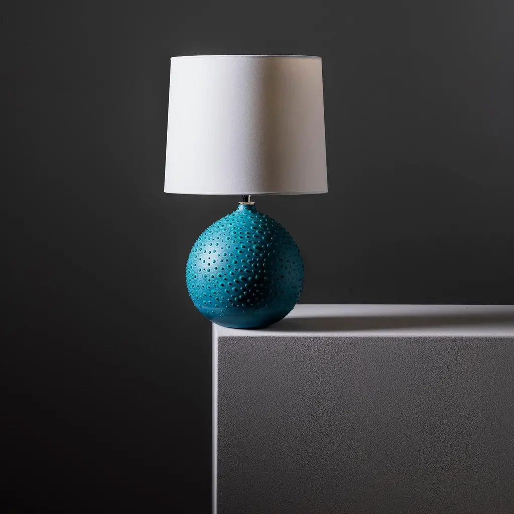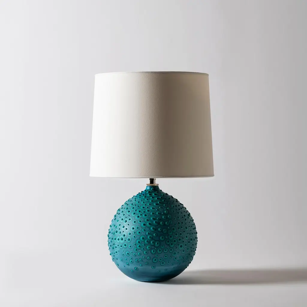Hesse lamp in Algae by Elyse GrahamDimensions: W 31 x H49 cmMaterials: Plaster, Resin, Cotton rag Paper, brass, Nickel. HARDWARE: POLISHED NICKEL-PLATED BRASS UNO THREADED SOCKETwith TURN KEY SWITCH, IN-LINE DIMMER.MOLDED, DYED, AND FINISHED BY HAND IN LA. CUSTOMIZATIONAVAILABLE.ALL PIECES ARE MADE TO ORDER. Please contact us.All our lamps can be wired according to each country. If sold to the USA it will be wired for the USA for instance.This collection is inspired by the unique galaxy of microorganisms living within each of us. We created a technique for dying and stippling each base that evokes the nature of microbes as they grow and colonize. The base of each lamp is hand-cast with hydrocal plaster inside of a unique balloon shape. The interior of each piece is poured with layers of resin, impregnating the plaster with added strength and hardness. Finally, each base is hand-dyed with custom mixed pigments and finished with a unique pattern of dyed plaster protuberances. The exterior is sealed with a UV resistant acrylic coating. Our shades are made by hand using a heavyweight cotton rag paper and attached to a nickel-plated swivel fixture with a turn switch. An in-line dimmer switch on the cord provides adjustable light settings. Due to the nature of the UV sensitive materials in our lamp bases we recommend using LED lightbulbs exclusively.MEET OUR TEAMElyse Graham is the founder and creative director of the studio. Driven by Elyse’s unique vision of building a studio that fosters and emphasizes connection, play, and experimentation (of people, processes, and in turn the objects created and shared) our small team works closely and collaboratively on each project. Elyse received a BA in sculpture and semiotics at Brown University. After years of making sculpture and running a business in jewelry design, Elyse decided to merge her separate practices and redirect her attention toward collectible design in 2013. The creative trajectory of the studio is heavily influenced by Graham’s background in fine art, specifically her interest in process-driven and material-based artwork. The studio’s vocabulary of shapes, patterns, and forms comes from a lineage of unconventional processes Graham has developed and built for working with plaster and resin. Graham shares her studio as well as her home with her husband, Lewis Mauk and their daughter, Eero. Miller Robinson is head of our production department. From pigmenting and casting materials for all of our products in plaster and resin to graphic and production design, they wear many hats in our studio. Miller joined our team in 2014 and has been an integral part of designing many of our experimental processes that have lead to the creation of our unique MetaMATERIAL. Like Elyse, Miller has a background in material and process-oriented making, which led to an instant connection and collaborative understanding between the two. Miller received their BFA from Otis College of Art and Design with a focus on painting, installation, performance, and writing. Their individual art practice focuses on the preservation and potentialities of underrepresented histories and encompasses objects, garments, actions, tattooing, and books. Their personal work has been exhibited in Los Angeles at the Southwest Museum, Los Angeles Municipal Art Gallery, Heritage Square Museum, and with Los Angeles Contemporary Exhibitions (LACE), as well as HORESEANDPONY Fine Arts in Berlin.Lewis Mauk is our studio and operations engineer. Working on facilities and production design as well as engineering and leading all of our large-scale constructions and installations, Lewis’ unique set of technical skills gives form and structure to our studio’s unconventional ideas and processes. Lewis has been working behind-the-scenes since the creation of the studio but joined our team full-time in 2020. Consistent with the rest of our team, Lewis has a background in process-driven fine art and has extensive training in woodworking, printmaking, and photography. He received a MFA from CalArts and has worked across the fields of education and fabrication. Lewis’ combined interest in the creation of personal archives mixed with his commitment to sustainable life practices, has brought a focus and important emphasis on designing studio projects and processes that imagine ways to reduce and reuse studio material fragments.