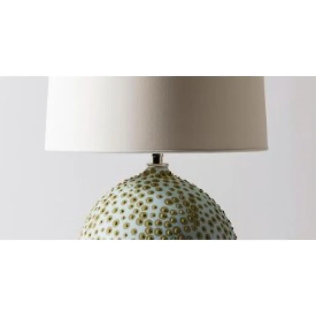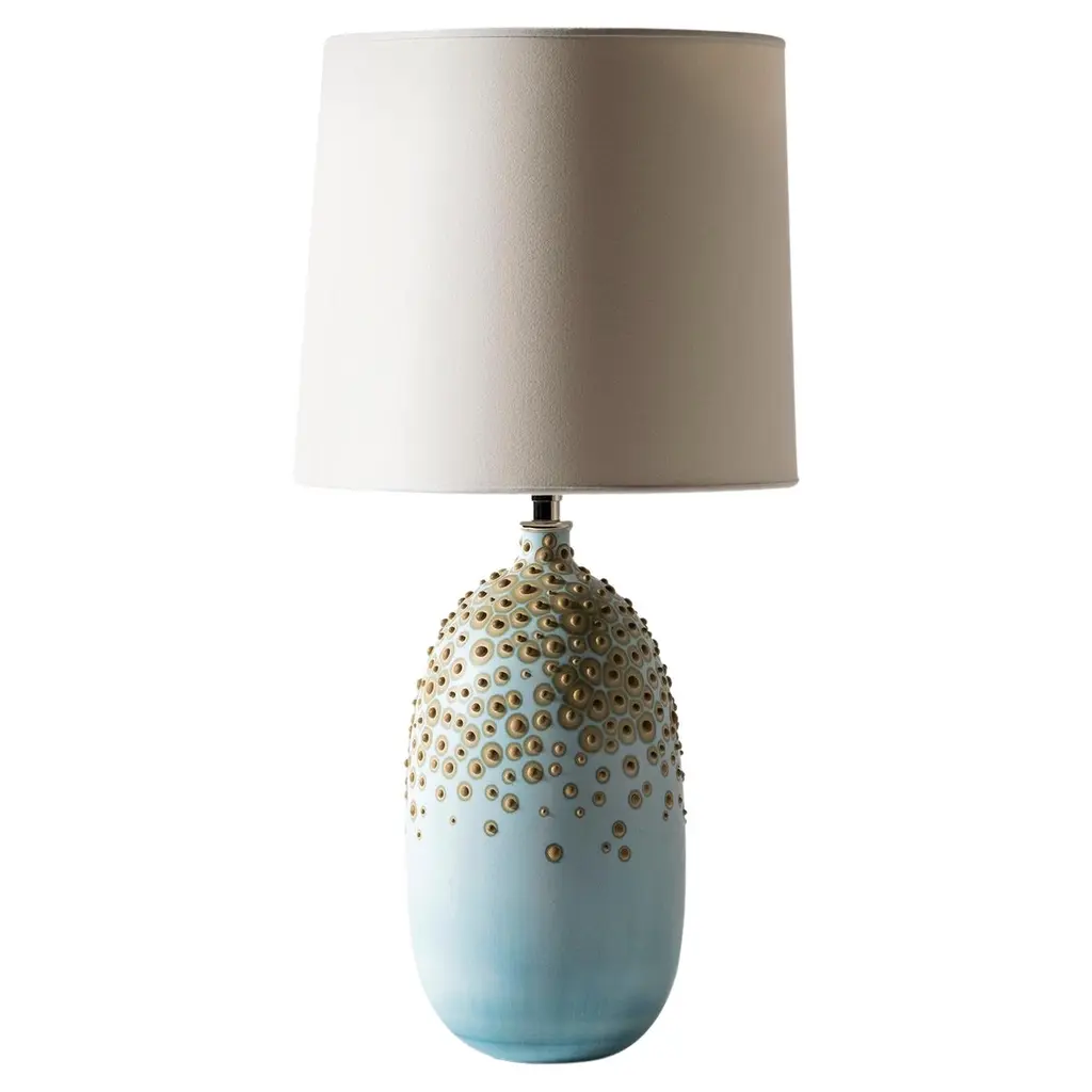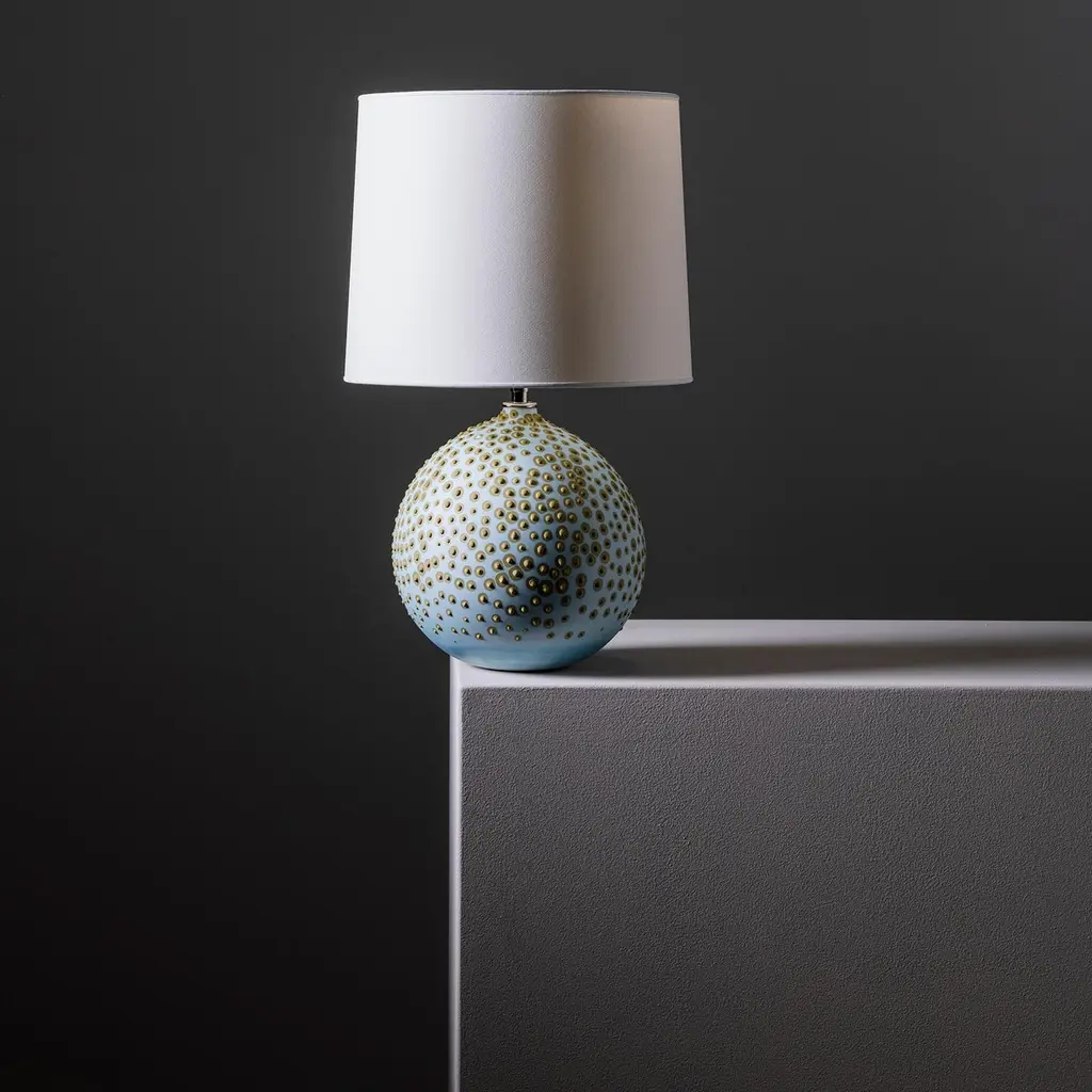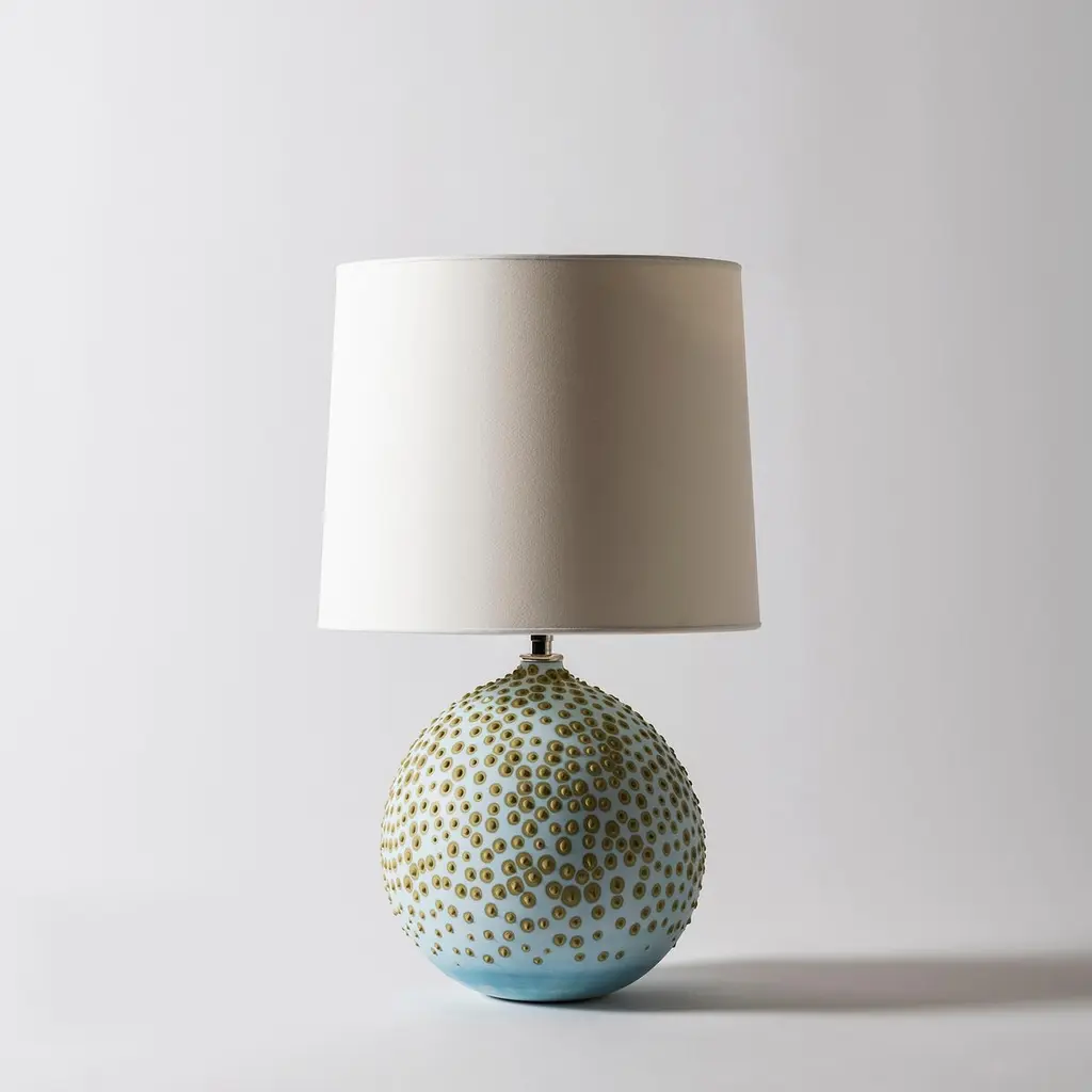 Hesse Lamp in Glacier by Elyse GrahamDimensions: W 31 x H 49 cmMaterials: Plaster, Resin, Cotton rag Paper, brass, Nickel. Hardware: polished nickel-plated brass uno threaded socketwith turn key switch, in-line dimmer.Molded, dyed, and finished by hand in LA. Customizationavailable.All pieces are made to order.All our lamps can be wired according to each country. If sold to the USA it will be wired for the USA for instance.This collection is inspired by the unique galaxy of microorganisms living within each of us. We created a technique for dying and stippling each base that evokes the nature of microbes as they grow and colonize. The base of each lamp is hand-cast with hydrocal plaster inside of a unique balloon shape. The interior of each piece is poured with layers of resin, impregnating the plaster with added strength and hardness. Finally, each base is hand-dyed with custom mixed pigments and finished with a unique pattern of dyed plaster protuberances. The exterior is sealed with a UV resistant acrylic coating. Our shades are made by hand using a heavyweight cotton rag paper and attached to a nickel-plated swivel fixture with a turn switch. An in-line dimmer switch on the cord provides adjustable light settings. Due to the nature of the UV sensitive materials in our lamp bases we recommend using LED lightbulbs exclusively.Meet our teamElyse Graham is the founder and creative director of the studio. Driven by Elyse’s unique vision of building a studio that fosters and emphasizes connection, play, and experimentation (of people, processes, and in turn the objects created and shared) our small team works closely and collaboratively on each project. Elyse received a BA in sculpture and semiotics at Brown University. After years of making sculpture and running a business in jewelry design, Elyse decided to merge her separate practices and redirect her attention toward collectible design in 2013. The creative trajectory of the studio is heavily influenced by Graham’s background in fine art, specifically her interest in process-driven and material-based artwork. The studio’s vocabulary of shapes, patterns, and forms comes from a lineage of unconventional processes Graham has developed and built for working with plaster and resin. Graham shares her studio as well as her home with her husband, Lewis Mauk and their daughter, Eero. Miller Robinson is head of our production department. From pigmenting and casting materials for all of our products in plaster and resin to graphic and production design, they wear many hats in our studio. Miller joined our team in 2014 and has been an integral part of designing many of our experimental processes that have lead to the creation of our unique MetaMATERIAL. Like Elyse, Miller has a background in material and process-oriented making, which led to an instant connection and collaborative understanding between the two. Miller received their BFA from Otis College of Art and Design with a focus on painting, installation, performance, and writing. Their individual art practice focuses on the preservation and potentialities of underrepresented histories and encompasses objects, garments, actions, tattooing, and books. Their personal work has been exhibited in Los Angeles at the Southwest Museum, Los Angeles Municipal Art Gallery, Heritage Square Museum, and with Los Angeles Contemporary Exhibitions (LACE), as well as HORESEANDPONY Fine Arts in Berlin.Lewis Mauk is our studio and operations engineer. Working on facilities and production design as well as engineering and leading all of our large-scale constructions and installations, Lewis’ unique set of technical skills gives form and structure to our studio’s unconventional ideas and processes. Lewis has been working behind-the-scenes since the creation of the studio but joined our team full-time in 2020. Consistent with the rest of our team, Lewis has a background in process-driven fine art and has extensive training in woodworking, printmaking, and photography. He received a MFA from CalArts and has worked across the fields of education and fabrication. Lewis’ combined interest in the creation of personal archives mixed with his commitment to sustainable life practices, has brought a focus and important emphasis on designing studio projects and processes that imagine ways to reduce and reuse studio material fragments.
