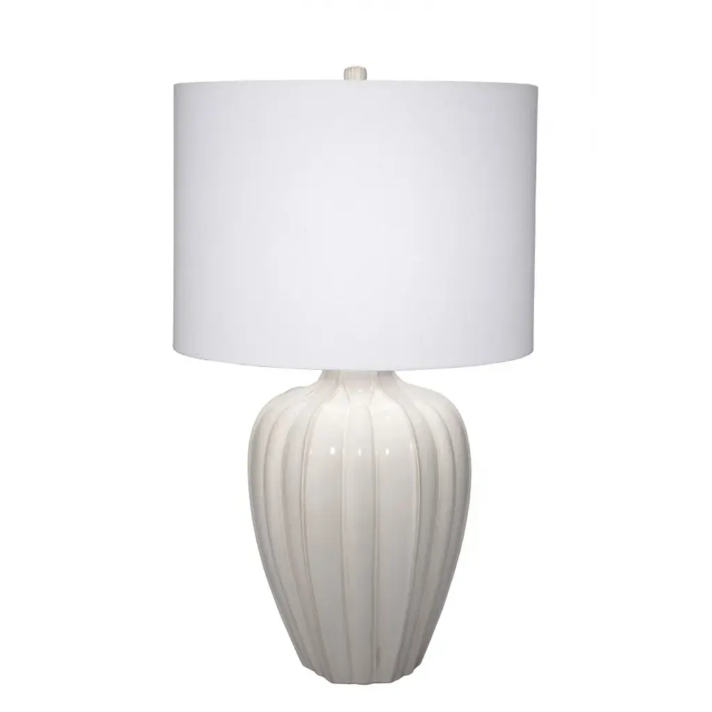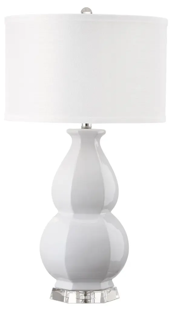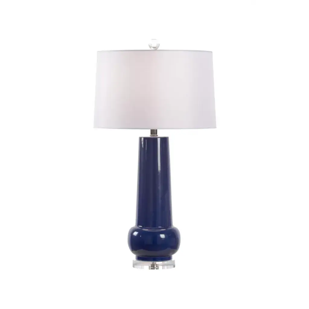 This cloud blue porcelain lamp is adorned with a crystal base and top. This bold and versatile piece adds a luxurious, chic touch in any room. Comes topped with a white shade.