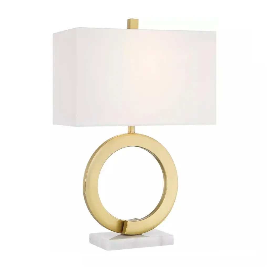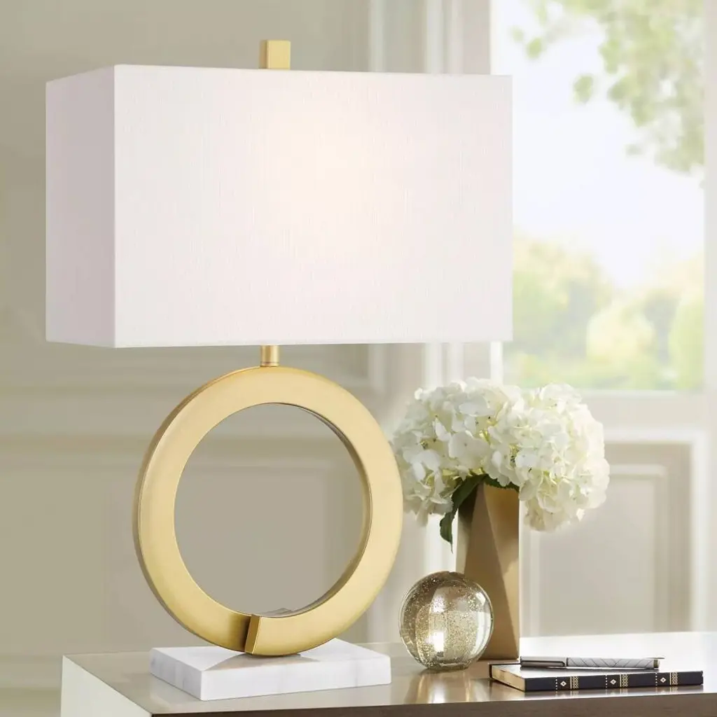 PRODUCT DETAILS: 24 3/4" high overall. Base is 8" wide x 5 1/4" deep. Rectangular shade is 16" across the top and bottom x 9" deep x 10" high. Weighs 8.25 lbs. Uses one maximum 100 watt standard-medium base 3-way light bulb (not included). 3-way socket switch for easy lighting control. Bryce modern ring table lamp from the 360 Lighting brand. Open ring base in a gold finish. White marble at the very bottom. Metal and marble construction. Rectangular lamp shade in a white fabric. 8-foot long cord.