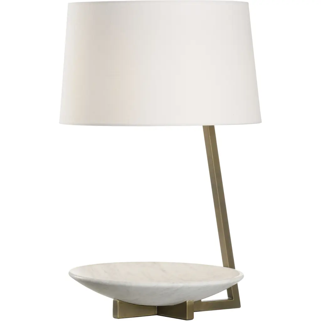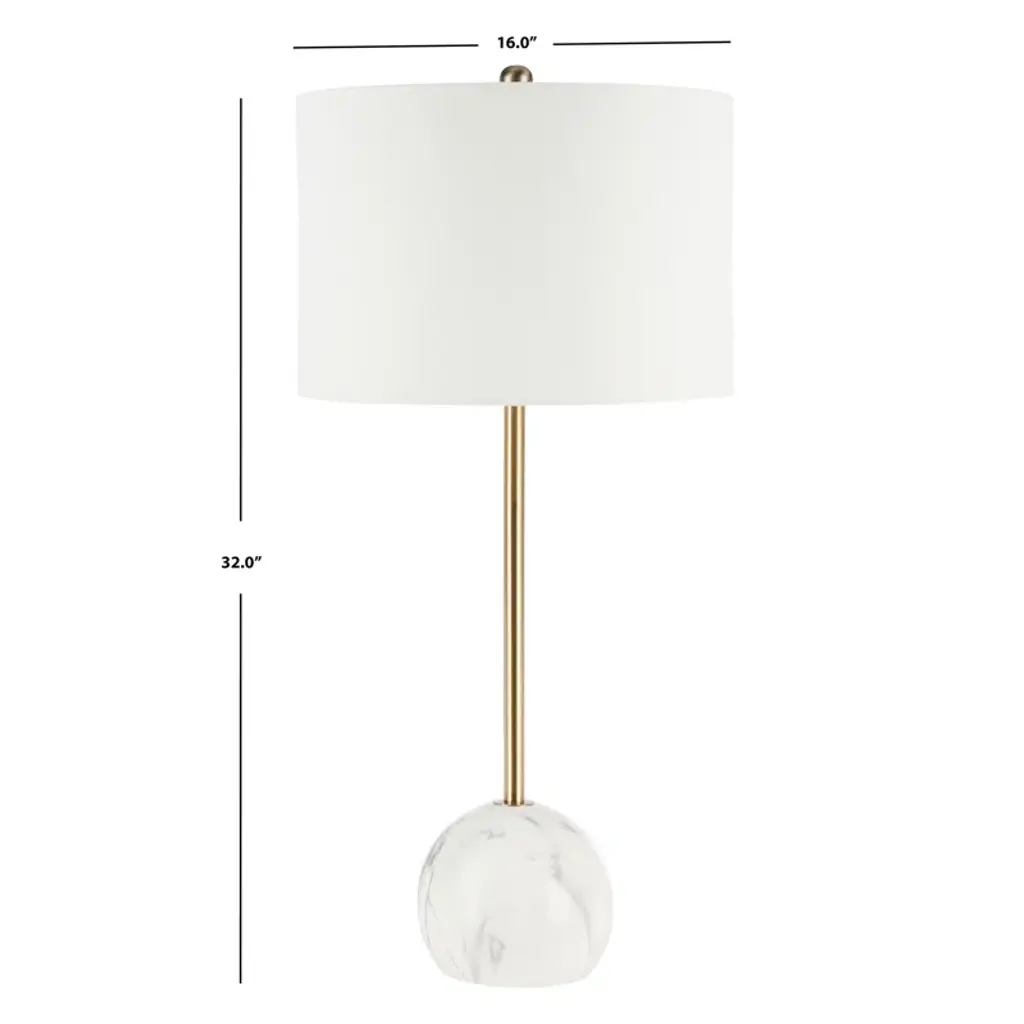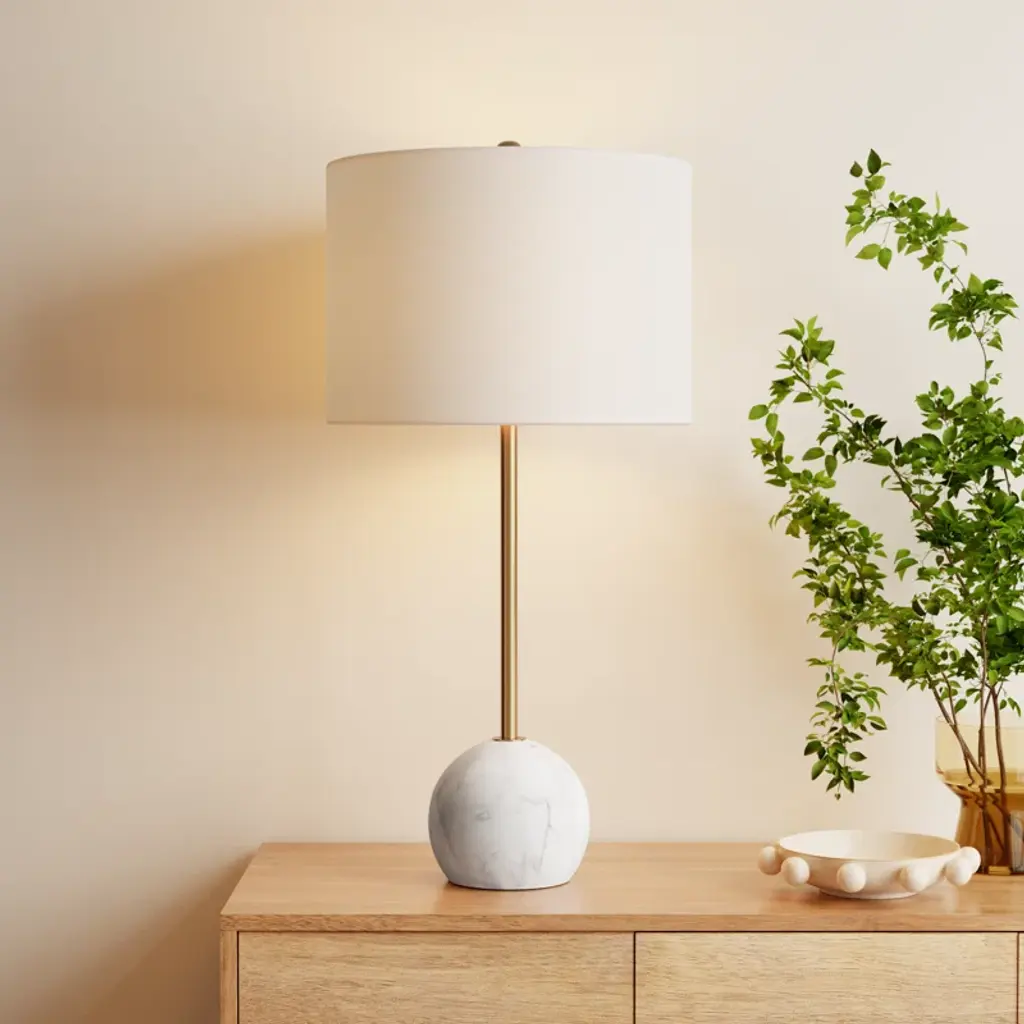Marble made modern. Our table lamp features a half-globe marble base that adds a touch of sophistication to any space. The white linen drum shade contrasts beautifully with the steel accents, creating a chic and contemporary look. The lamp is powered by a single compact fluorescent bulb, providing 805 lumens of ambient light. An on/off switch on the socket makes it easy to control, and the clear cord keeps things tidy. Illuminate your home with this stunning piece.