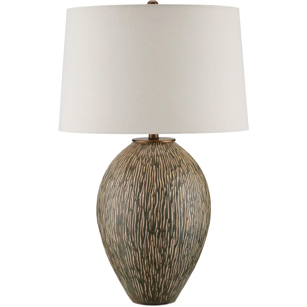 The Hildreth Table Lamp is awash in a textural pattern in an olive green and beige color combination. Made of porcelain, the dark green lamp gains a sense of movement from the flowing lines that ornament its surface. The fact it culminates without a base, and has an antique brass finish on the hardware and finial brings this composition great warmth.