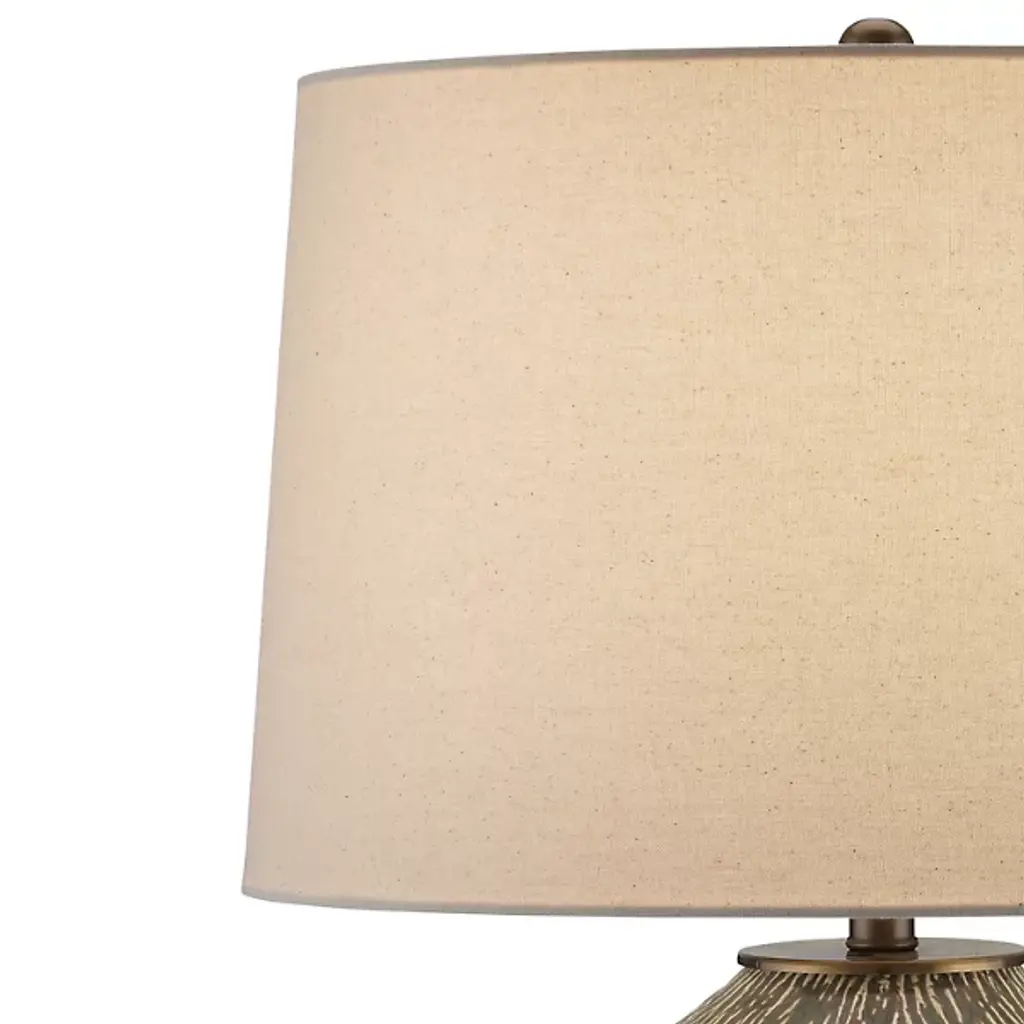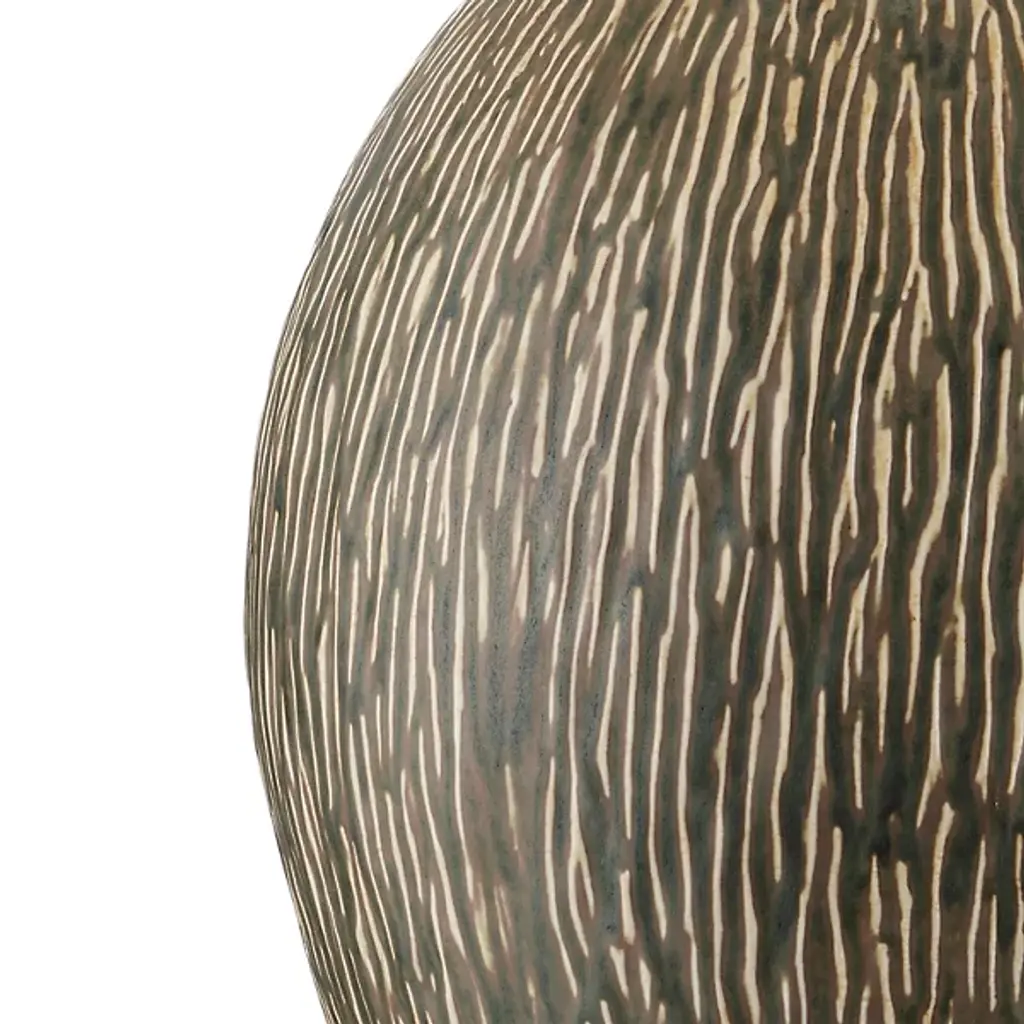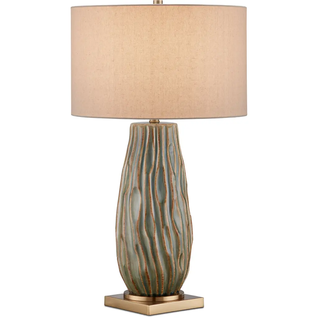 The Hildreth Table Lamp from Currey & Company features a captivating textural pattern crafted from porcelain. Flowing lines ornament its surface, imbuing the lamp with a sense of dynamic movement. The absence of a base enhances its sleek profile, while antique brass hardware and finial add warmth and character to the composition. This lamp is a perfect blend of artistic flair and functional elegance, ideal for enriching any space with its unique design.