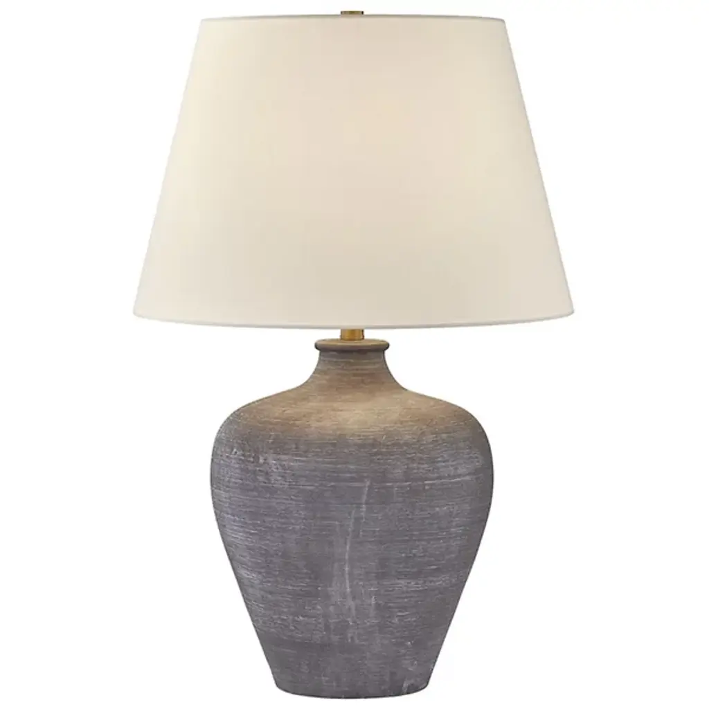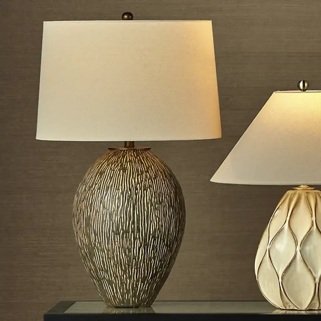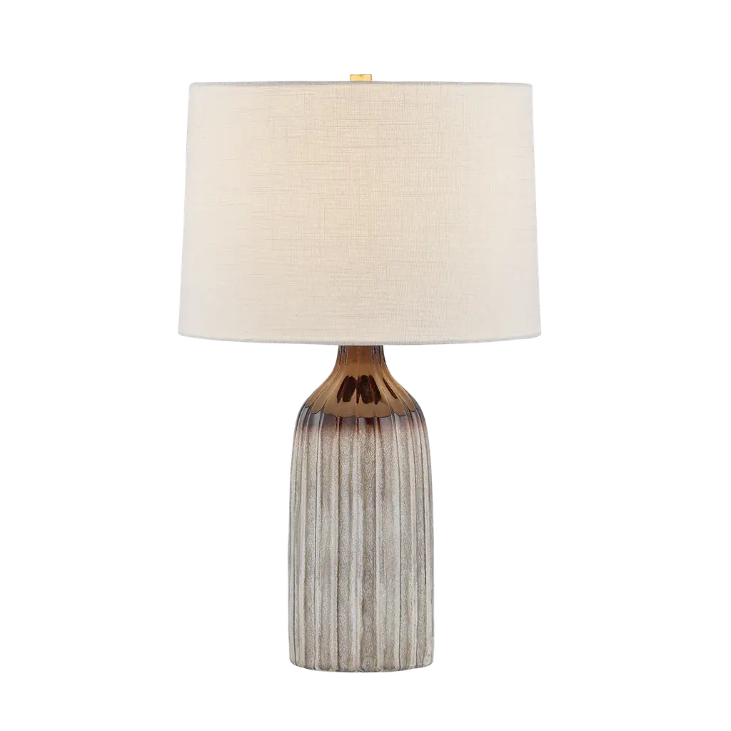 The Hildreth Table Lamp from Currey & Company features a captivating textural pattern crafted from porcelain. Flowing lines ornament its surface, imbuing the lamp with a sense of dynamic movement. The absence of a base enhances its sleek profile, while antique brass hardware and finial add warmth and character to the composition. This lamp is a perfect blend of artistic flair and functional elegance, ideal for enriching any space with its unique design.