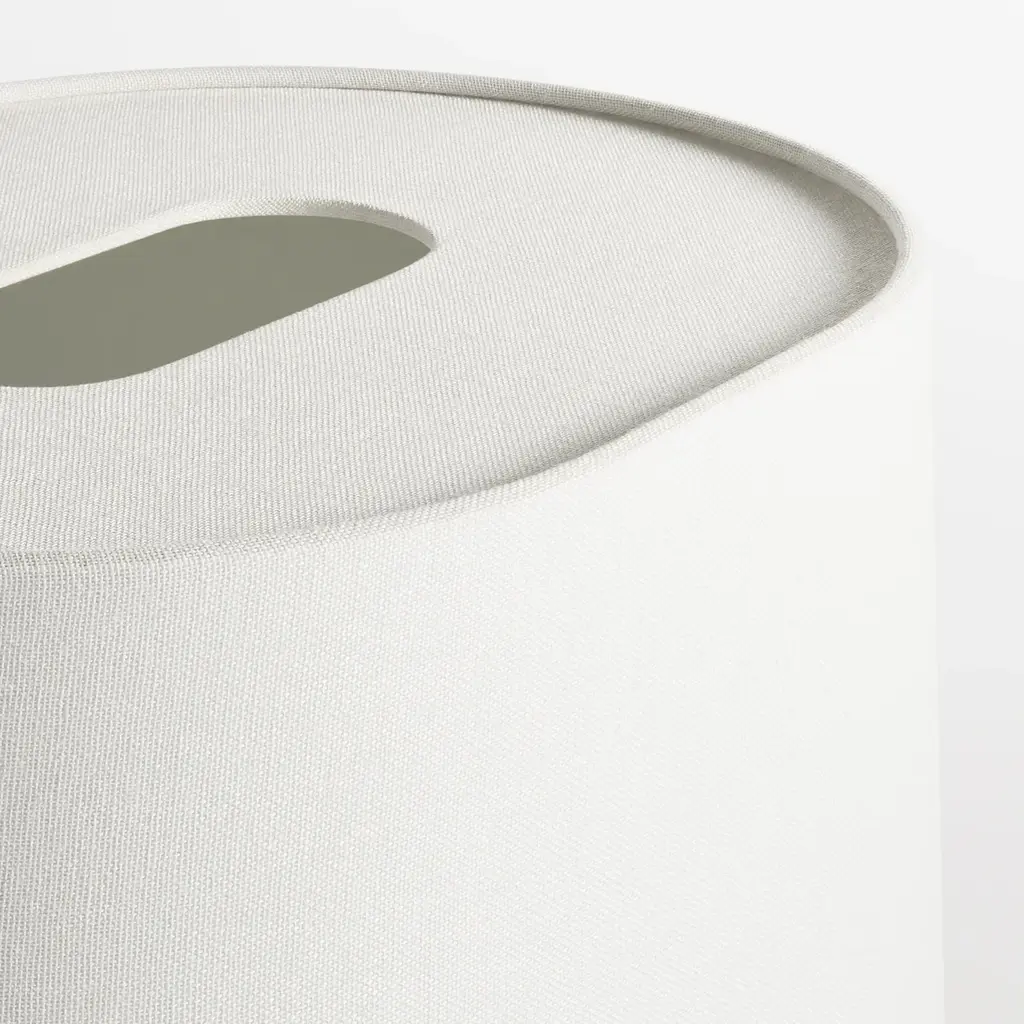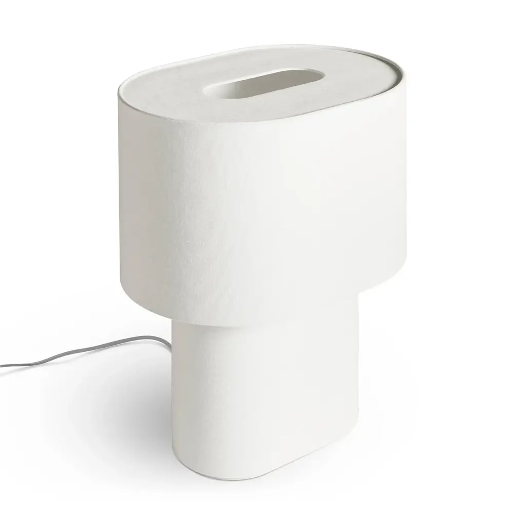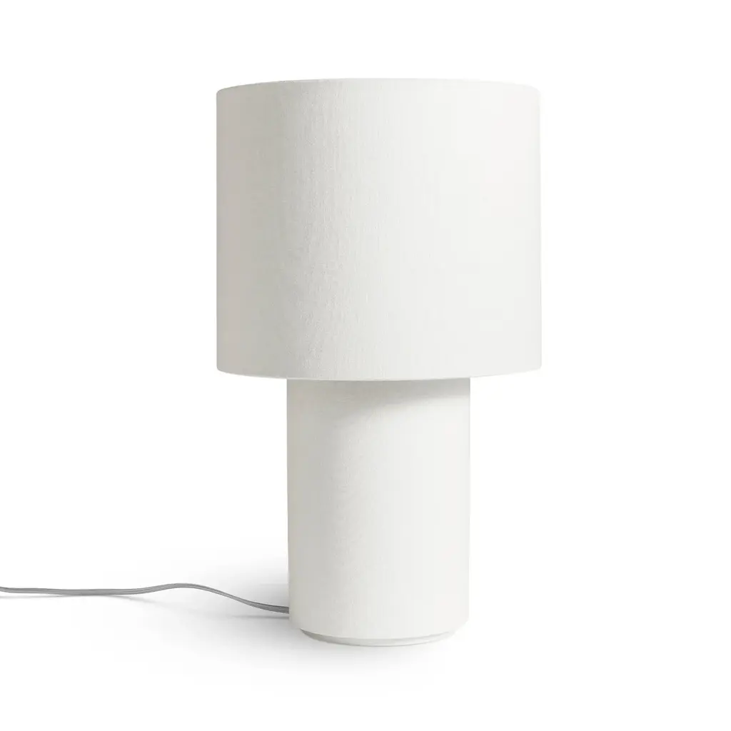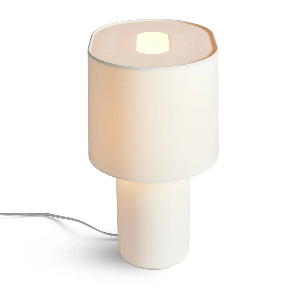 Soft linen shrouds a stout and sculptural form to create a glowing tabletop light source. Dimmable and delightful.