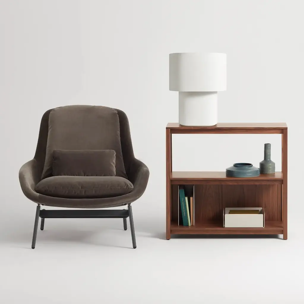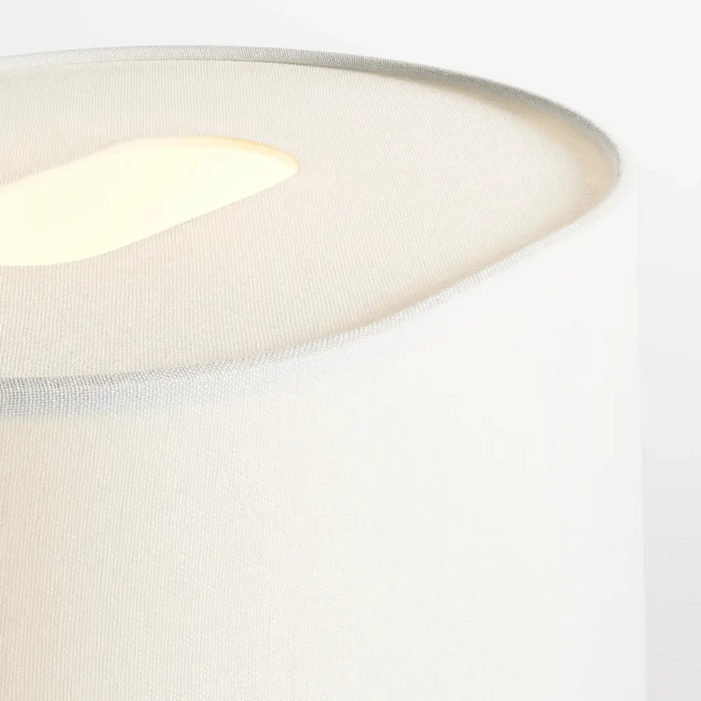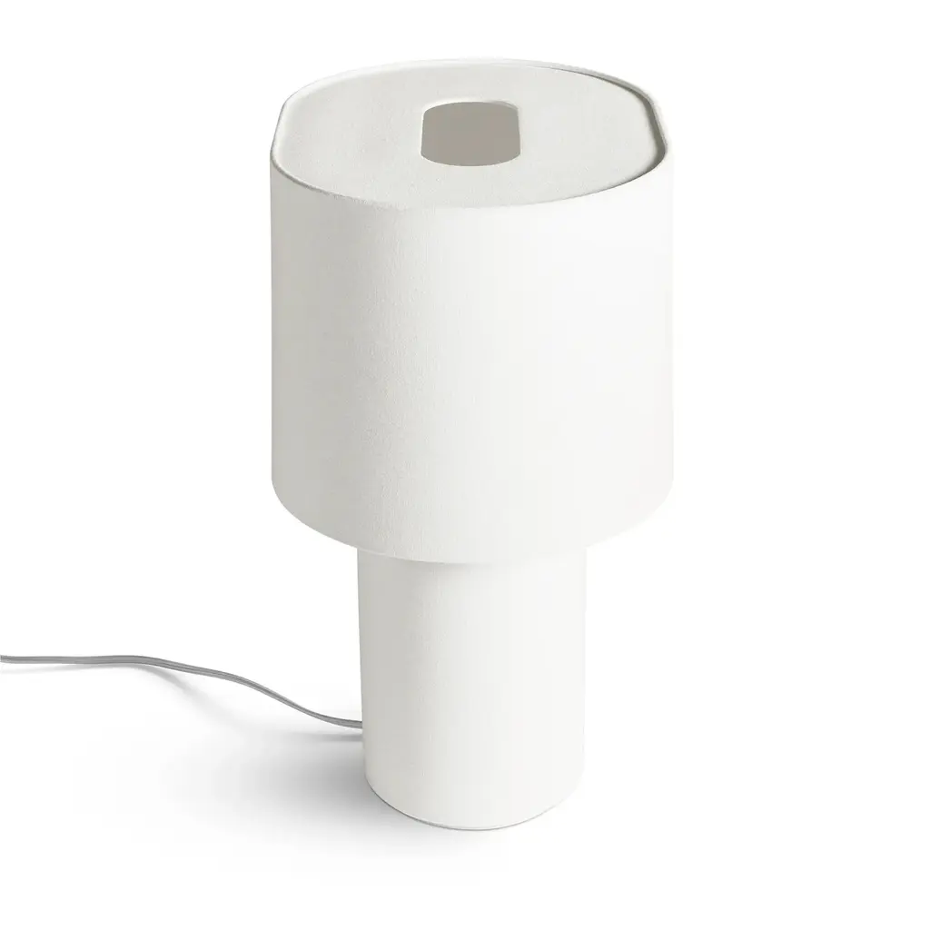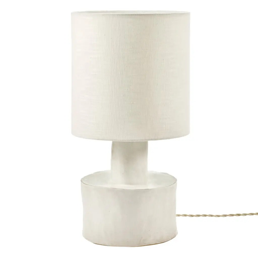 Soft linen shrouds a stout and sculptural form to create a glowing tabletop light source. Dimmable and delightful.