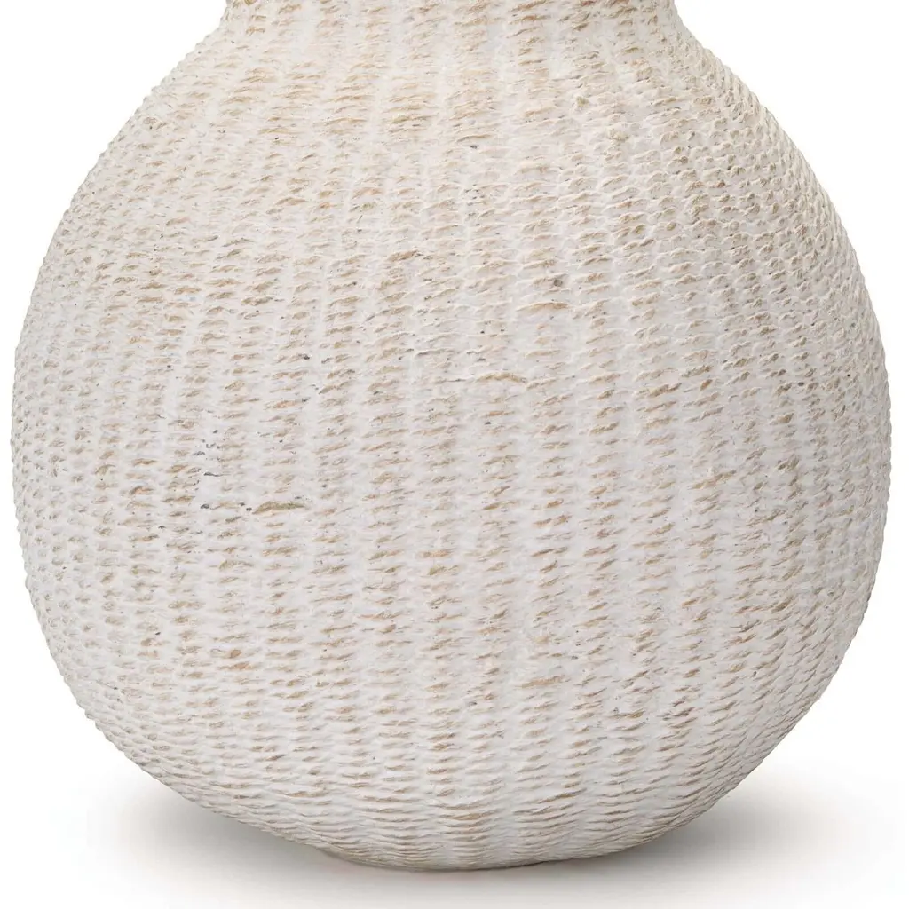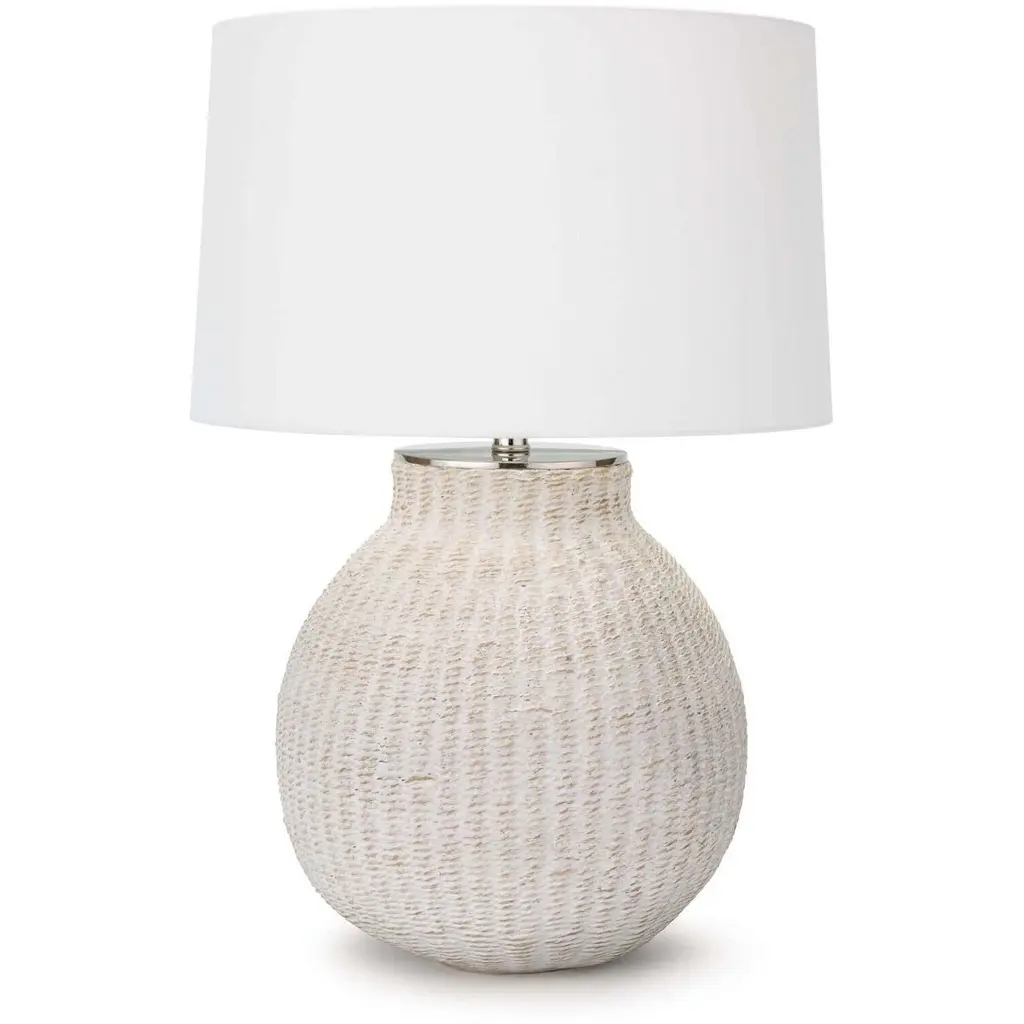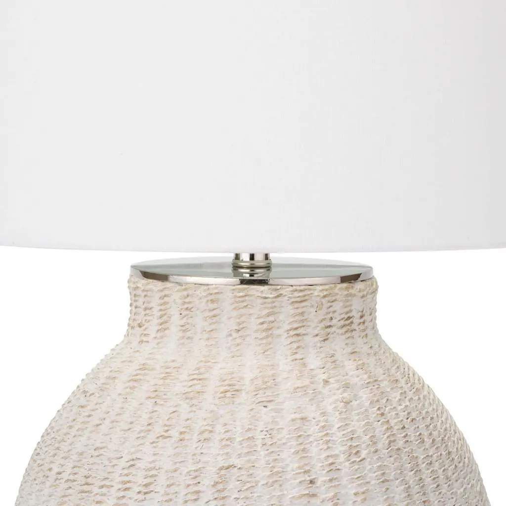 A white-washed natural woven pattern highlights this lamp's unique body shape. The Hobi's perfect mix of organic charm and polished nickel detailing creates a casual elegance perfect for a coastal retreat.