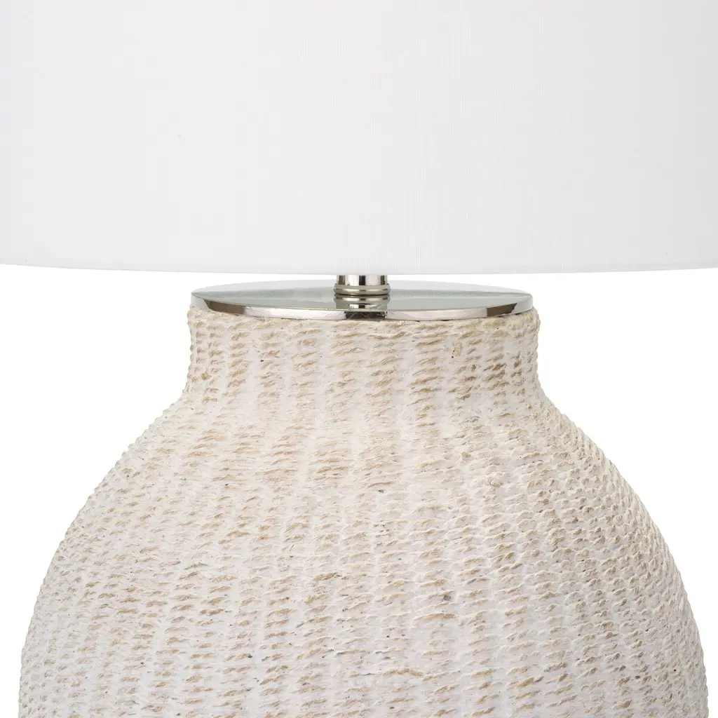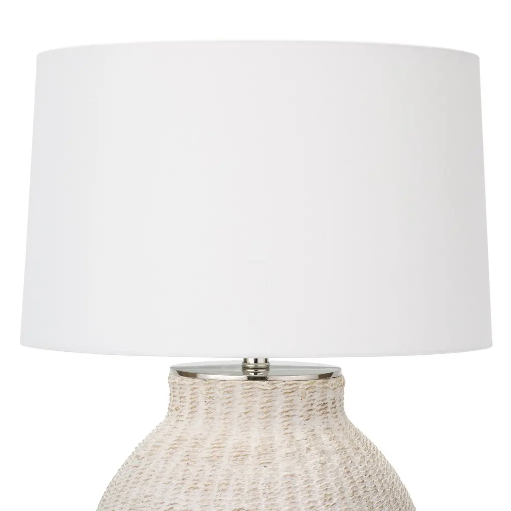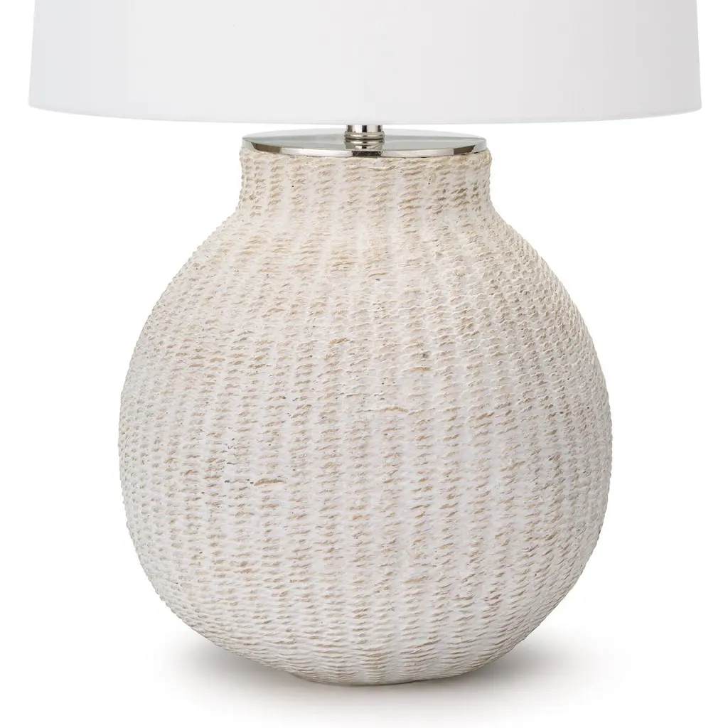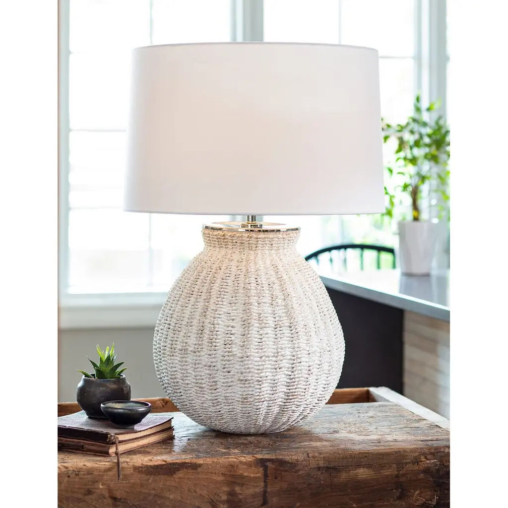 A White-washed natural woven pattern highlights this lamp’s unique body shape. The Hobi’s perfect mix of organic charm and polished nickel detailing create a casual elegance perfect for a coastal retreat.