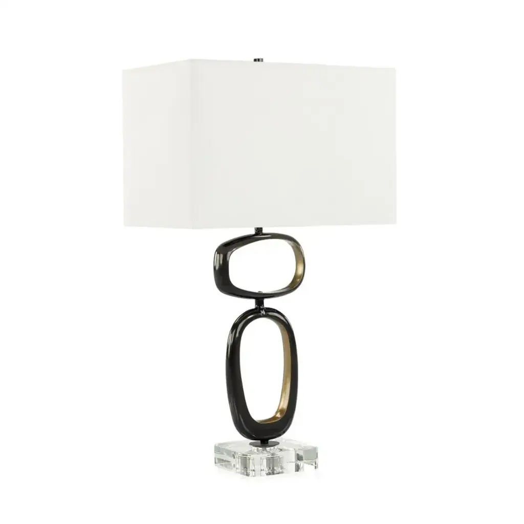 The Hollow Rings Table Lamp showcases a chic, contemporary color scheme accentuated by a masterful use of negative space. A stunning body with seductive curves is formed from two hollow rings, showcasing Black tones against Polished Brass. The piece rests gently atop a rounded base of clear crystal and features a cylindrical Bronze finial, emphasizing the sophisticated color palette.