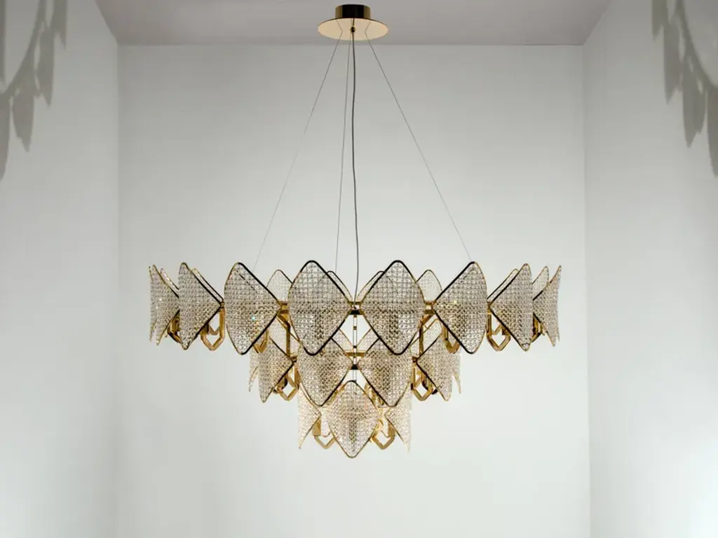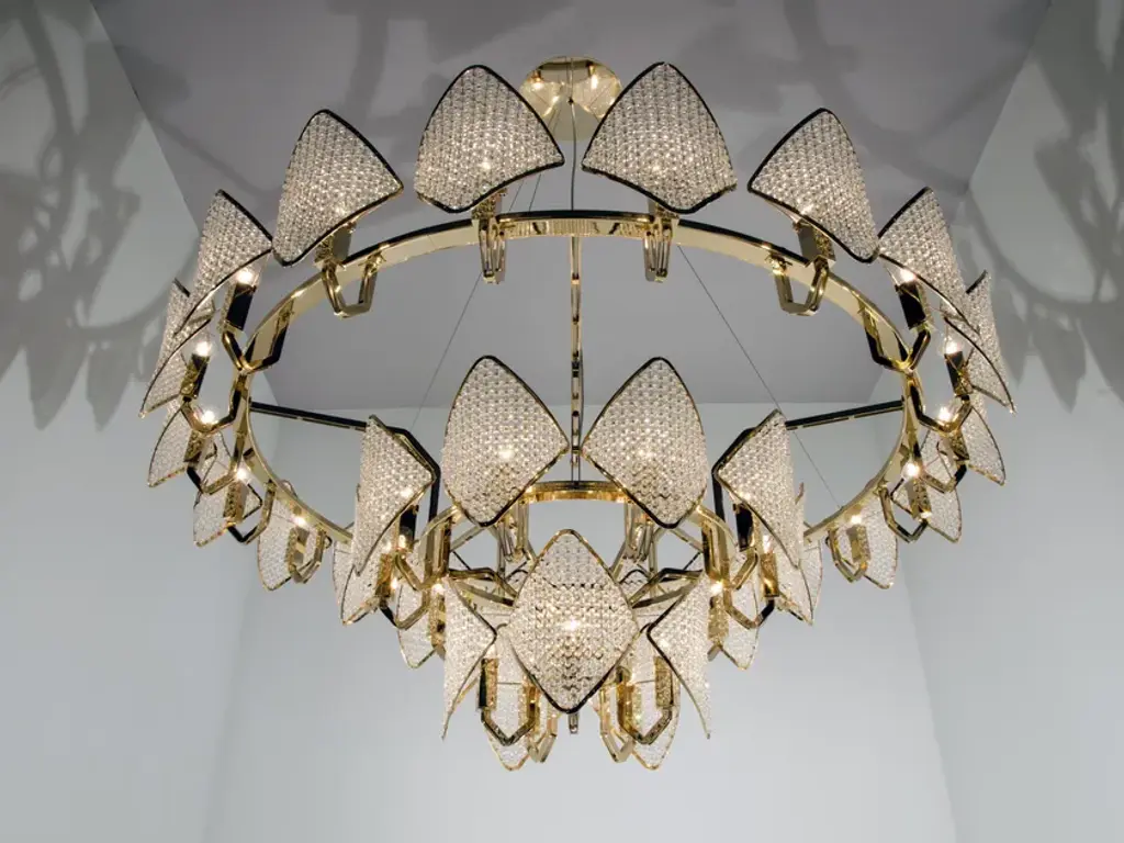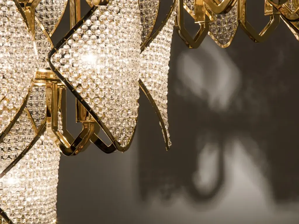 HOLLY H01G8 is a 35 lights chandelier, gold plated finish, cutted clear pearls lampshades.35x40W E14 not suppliedThe different models of the HOLLY collection are obtained by arranging the rhombuses over ring-like elements of different diameter and remind of top level goldworking. The modules, set ajar, look similar to precious gems variously mounted just like bracelets, rings or parures.The lampshades are available both in silk (in white or dove-grey) and in a much more precious variation made of texture of small crystals, transparent, white or black, entirely hand made. The choice of color nuances and metallic finish is thought to always obtain combinations that glorify the preciousness of the artifact.