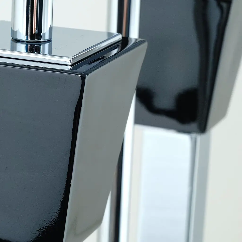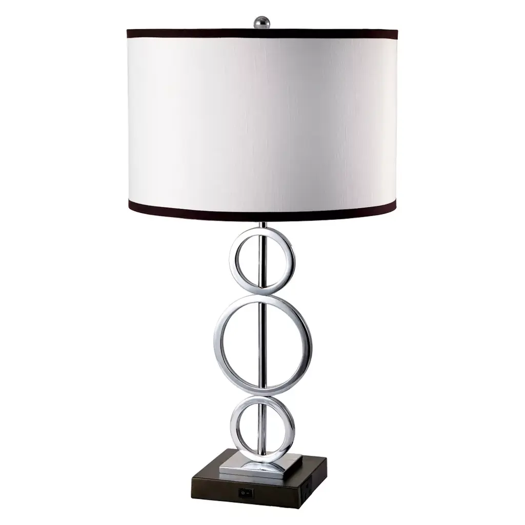 Fusing fashion with function, this modernist table lamp will bring sleek aesthetic into any interior, diffusing an inviting light into any minimalist or post-modern decor. Made of chrome-finished brass, the elegant structure stands on a rectangular tiered base with two squared stems embellished with black crystal decorative knobs and a slim cylindrical rod in the center. The light from two E27 lightbulbs is filtered through a stunning oval shade in black fabric. The combination of materials, colors, and textures results in a captivating composition that will never go out of style.