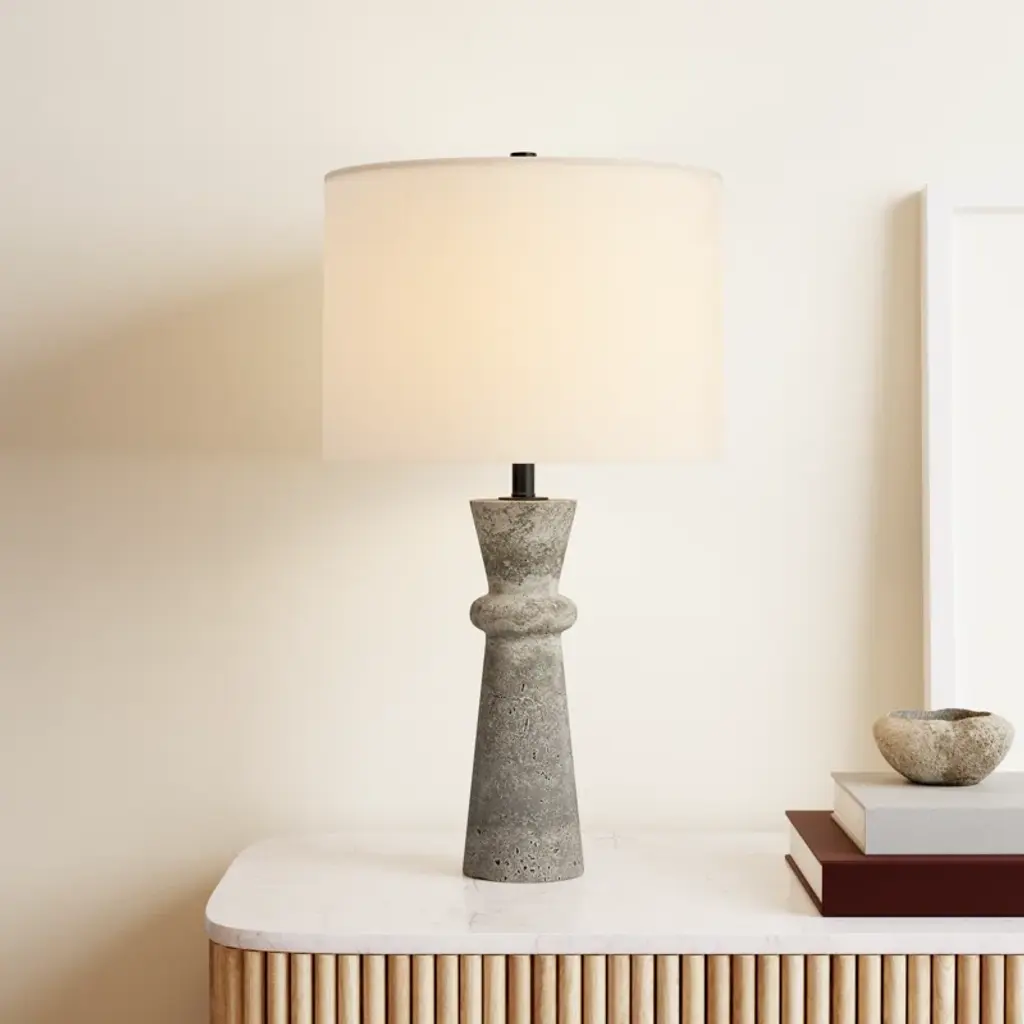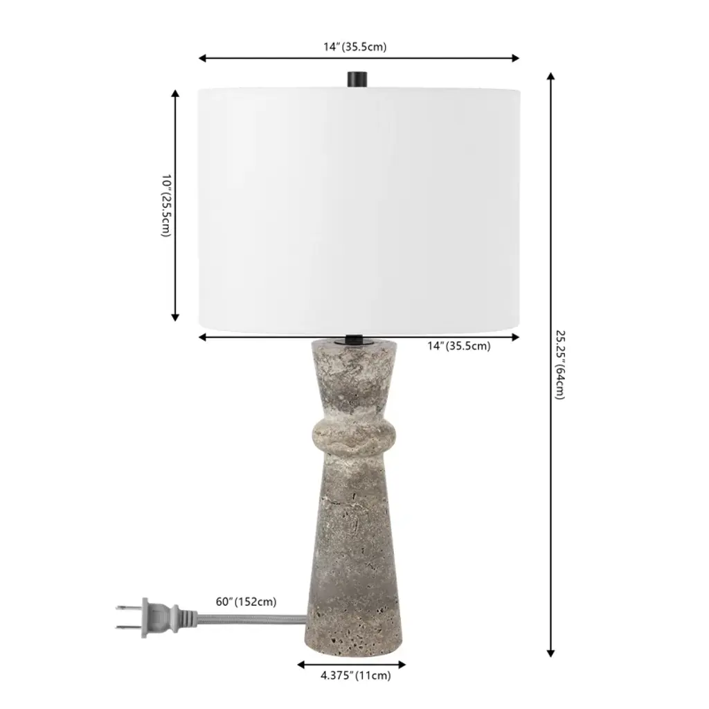 Stone-cold stunner. Our table lamp showcases a distinctive travertine base that complements its elegant cotton drum shade. It includes an energy-efficient LED bulb, perfect for creating a cozy ambiance in any room. An on/off switch on the inline cord allows for easy control, while the plug-in design means no hardwiring is required. Natural stone color variations make each lamp a one-of-a-kind addition to your space.