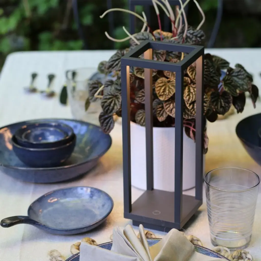 A contemporary update on the classic box lantern, the Home table lamp goes wherever its soft, ambient light is needed thanks to its wireless design. Made of grey-finished aluminum, the clean-lined table lamp fashions an open rectangle lit by an LED bulb integrated into the top's interior. The lamp turns on and dims with the touch of a finger and offers up to 13 hours of illumination. To recharge, return the battery-operated lamp to its contact induction charging base. Thanks to its durable powdercoat finish, the dark grey lamp can be used indoors or out and is bathroom safe.
