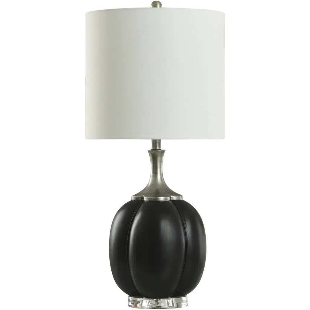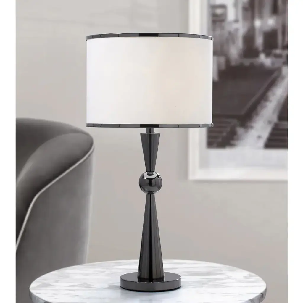 Modernize the decor in your home or office when you place this metal table lamp on an end table or desk space. This modern lamp with a drum-shaped shade features a black polished finish for added flair. Features:Made of metal and linenRequires one 3-way E26 standard base (100-watt max incandescent/equivalent LED bulb)Your choice of a black chrome or brushed nickel finish on metal baseCrisp, off-white, cylindrical linen drum shade with coordinating metallic trimDiffuses light beautifully for soft, warm, homey glow3-way socket rotary switchUL listedDimensions: Overall: 14.5 inches in diameter x 28.5 inches tallShade: 14.5 inches in diameter x 10 inches tallAssembly Required