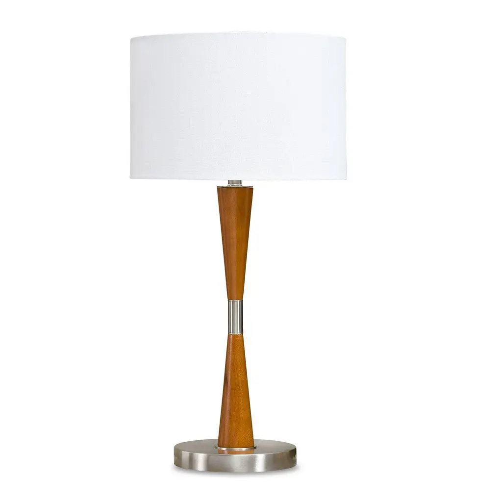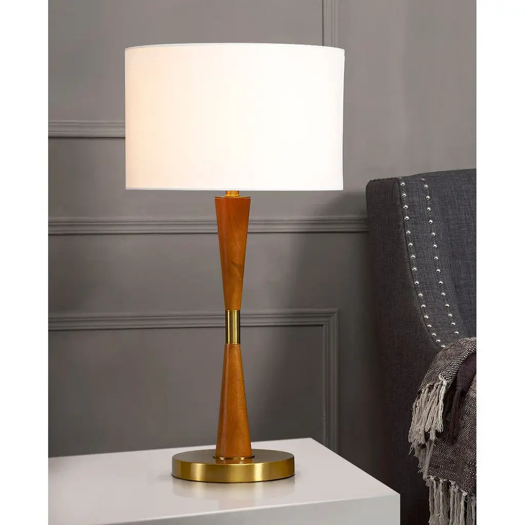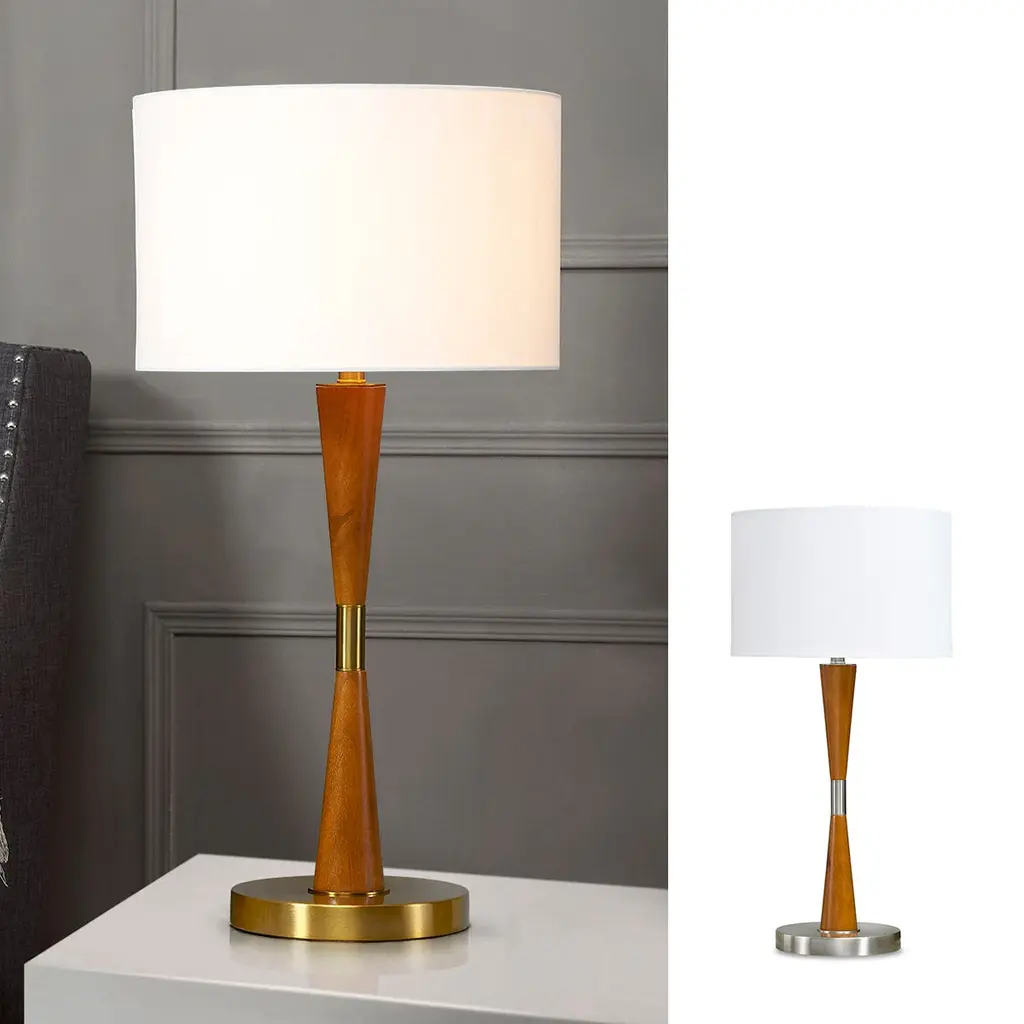 HOMEGLAM design, from Century design collection wood lamps, the 28"H table lamp build with solid wood in warm color wood stain finish, the lamp come with a 14"ø white linen lamp shade and on a steady 8" metal lamp base, the table lamp uses a socket rotary 3-way switch, It is a perfect lighting additions to decorate your space with style and value FEATURES: • 28"H Table Lamp with warm finish hardwood and brass finish hardware • 14" ø drum white lamp shade, 8"ø Lamp Base • Socket rotary 3-Way light switch • Uses one 3-Way A19 100W max. equivalent LED led bulb, *Bulb not included • UL Listed, Assembly required