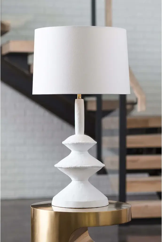 Inspired by a paper mach'' sculpture, this versatile lamp is at home in a variety of spaces. Complex curves, paired with a matte white finish gives this table lamp a unique appearance. Slight imperfections were left in, adding beauty and originality.Bulb Type: A Type Medium Base (E26)Wattage: 3-Way 150 Watt MaxNumber of Bulbs Needed: 1Bulb Included: No