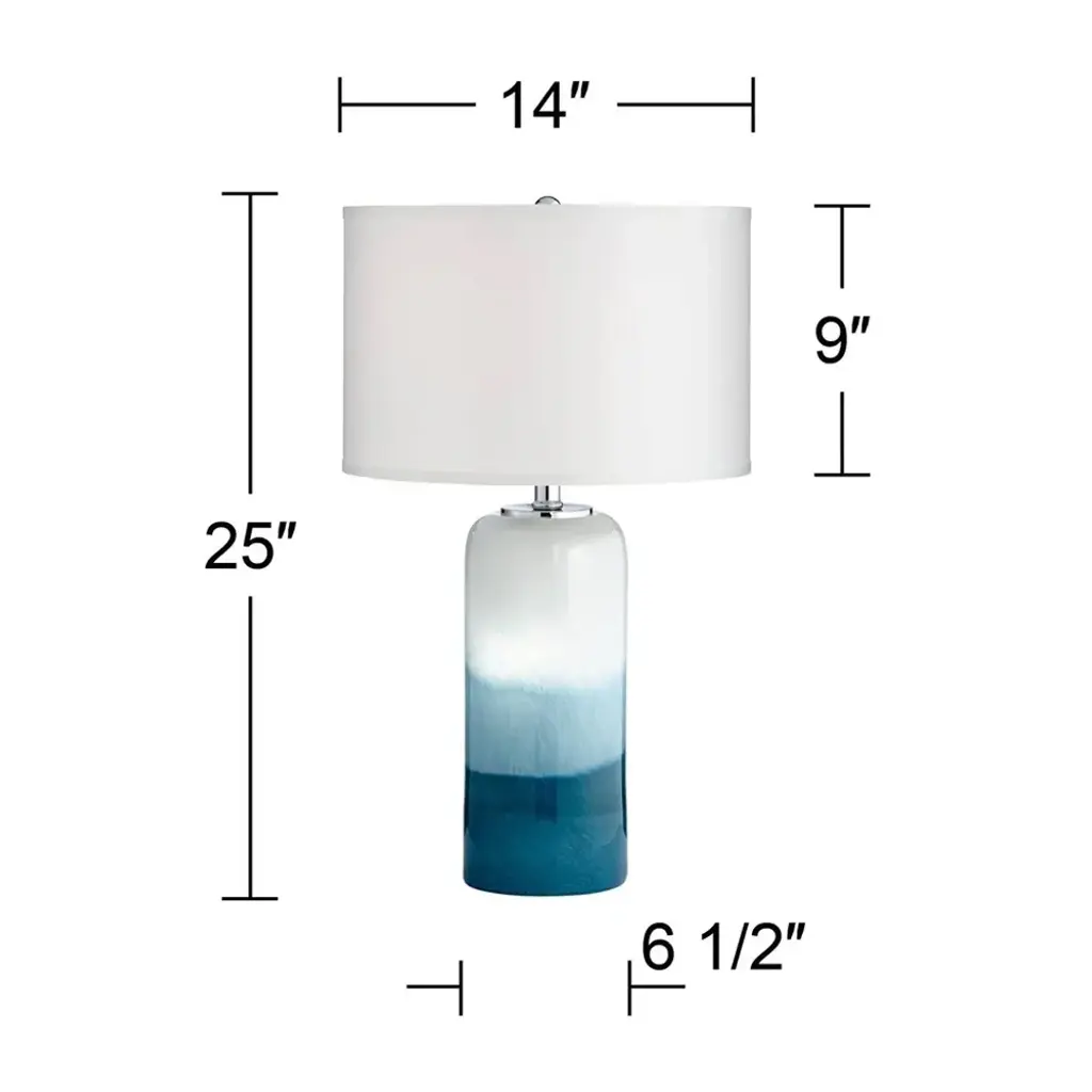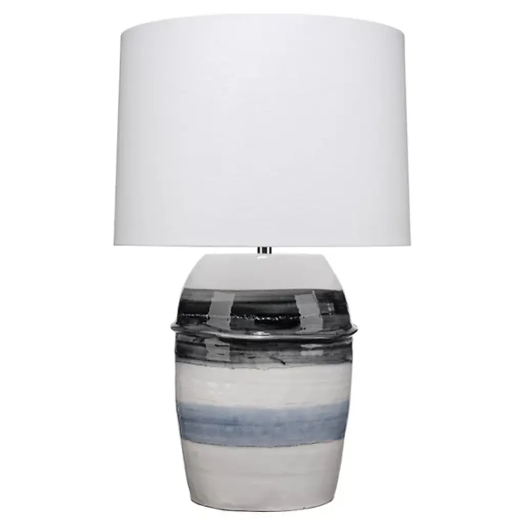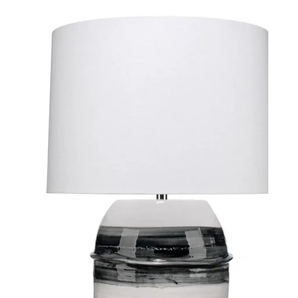 This evocative lamp is an ideal addition to a room designed to both sooth and comfort its occupants. Handcrafted and finished, with a ceramic and acrylic base, it was inspired by coastal horizons. Jamie tops it with rolled edge tapered drum shade, and a coordinating ceramic ball finial. No two will be identical.