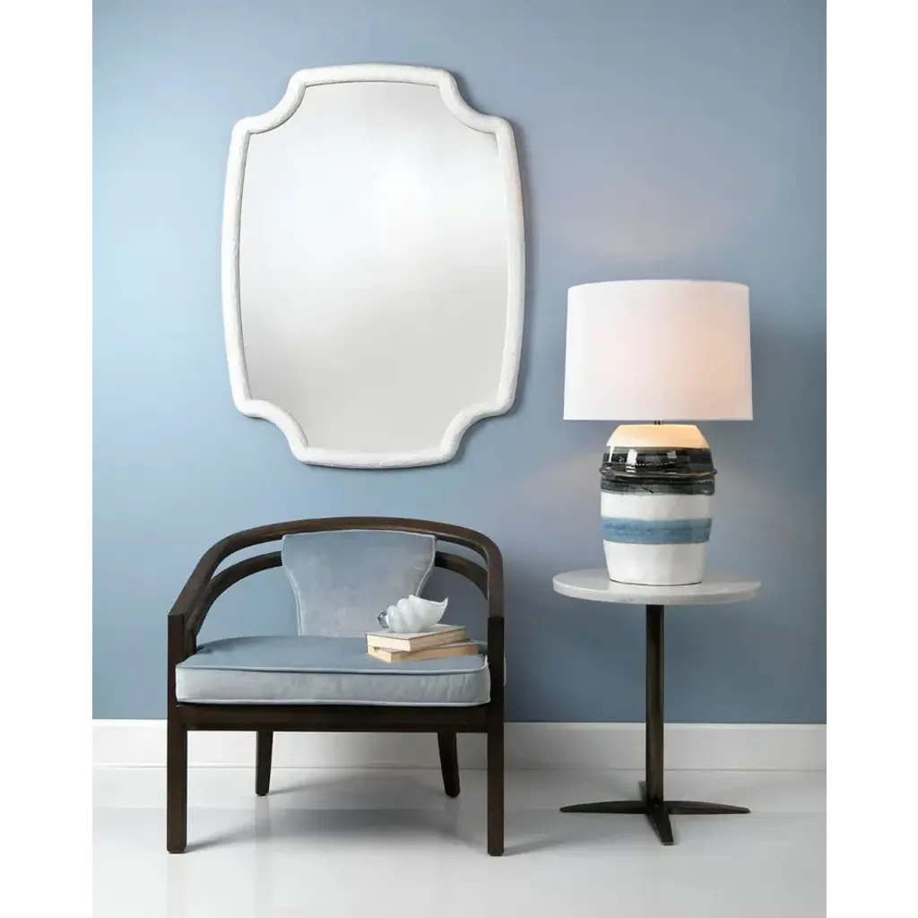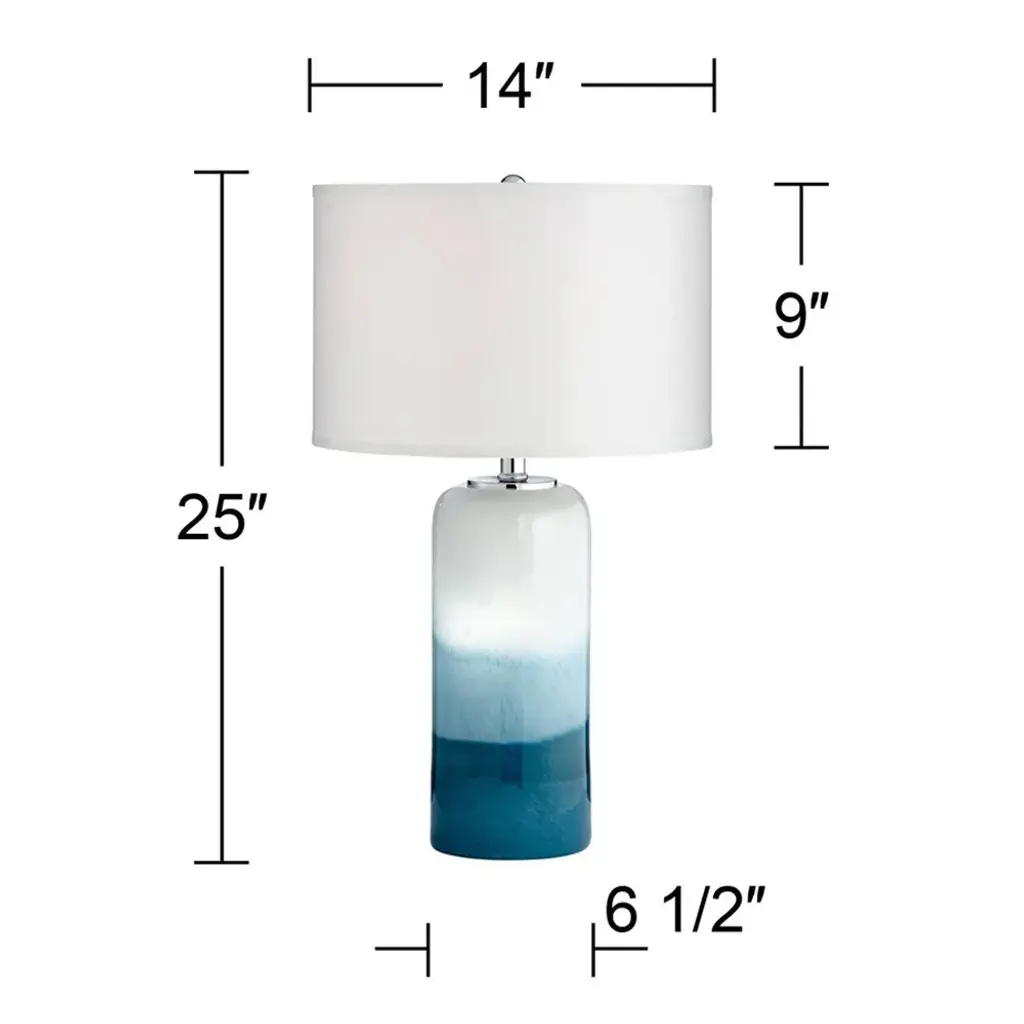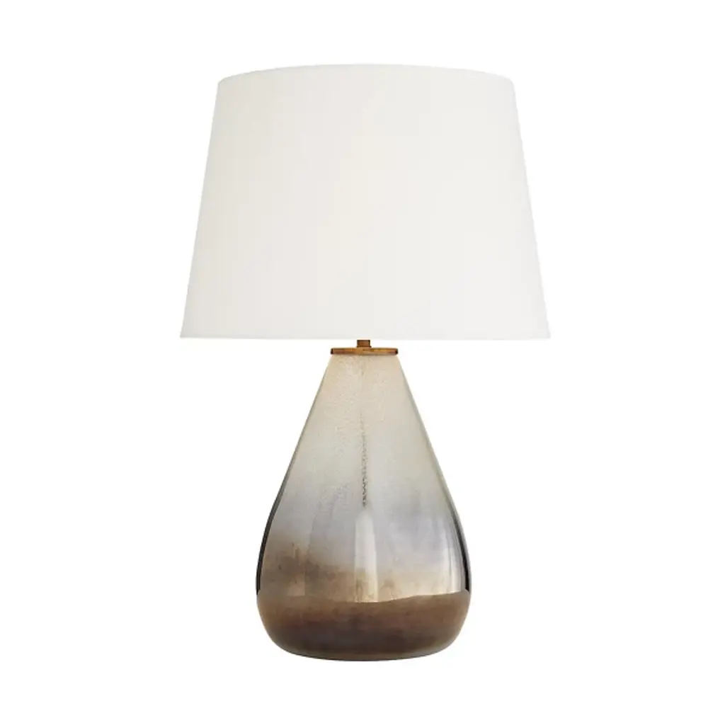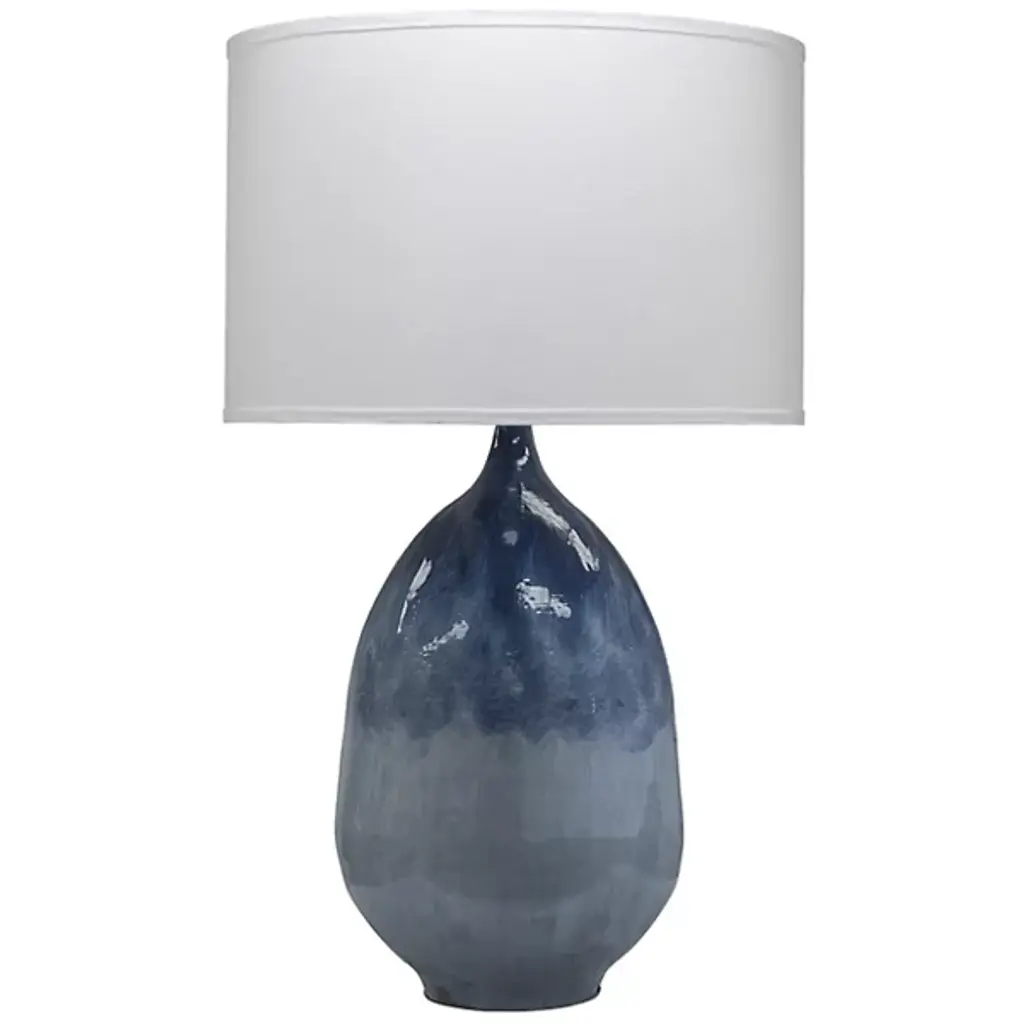 This evocative lamp is an ideal addition to a room designed to both sooth and comfort its occupants. Handcrafted and finished, with a ceramic and acrylic base, it was inspired by coastal horizons. Jamie tops it with rolled edge tapered drum shade, and a coordinating ceramic ball finial. No two will be identical.