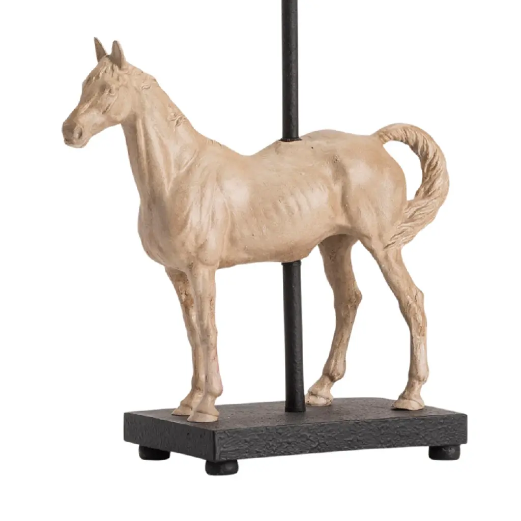 Accent your space with the equine beauty of the Resin Horse Table Lamp. A single white stallion sits atop a classic black wood base and is crowned with a sizable rectangular shade. This is truly an unusual and eye-catching verstile lamp. Uses one maximum 100 watt standard-medium base Type-A 3-way bulb (not included). 3-way socket switch. Rectangle oatmeal linen shade dimensions 16.5" W x 8.5" L x 10" H. 6 ft brown cord.