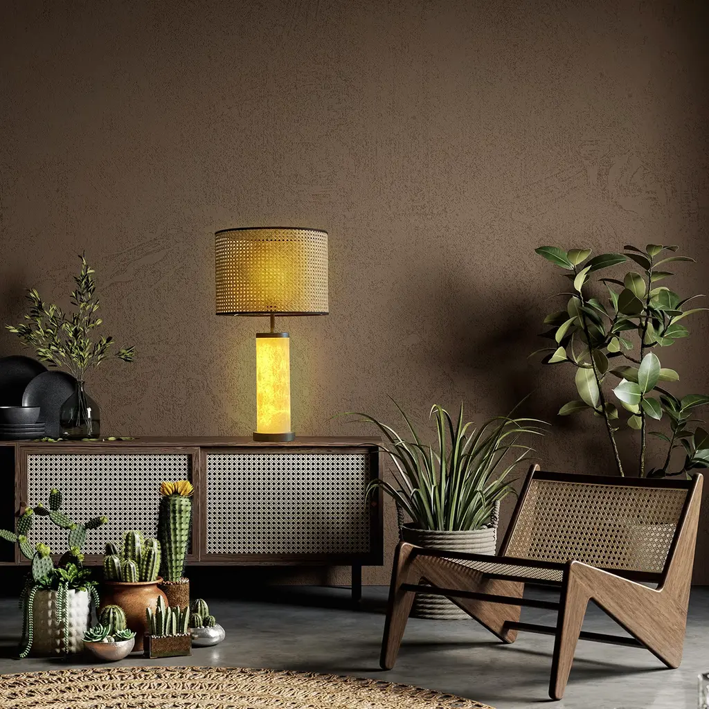 This particular model of table lamp combines the conventional lighting, protected by a double lampshade in fabric and Vienna straw, with the possibility of backlighting the cylindrical alabaster base, creating a soft ambient light and showing the intrinsic beauty of this natural material.
