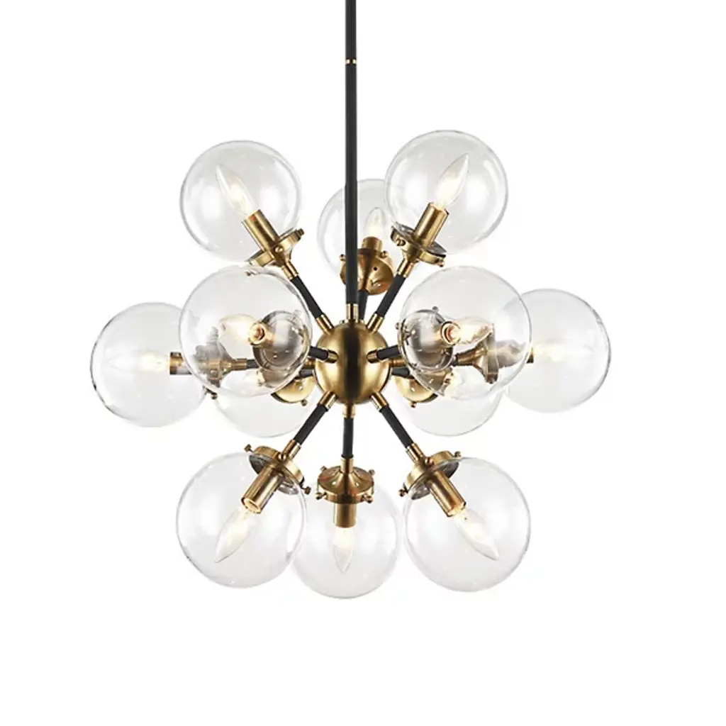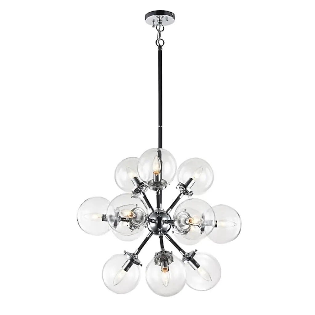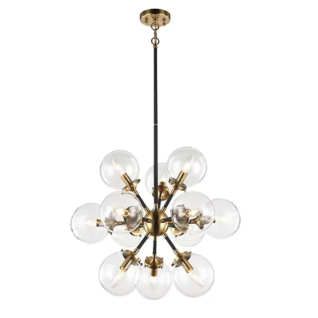 Launch your style to the stratosphere with the stylish sputnik shape of the Hoskins Chandelier by Alder & Ore. A slender stem drops down from a smooth circular ceiling mount, terminating in a round metal hub that holds out a series of small rods, each one blooming a single candelabra style socket. Best employed with retro-style bulbs, each lamp is set inside a spherical shade of clear glass, cutting the light’s direct glare while collaborating with its neighbors to create a warm sunburst arrangement.