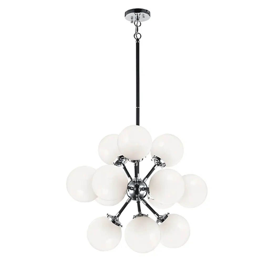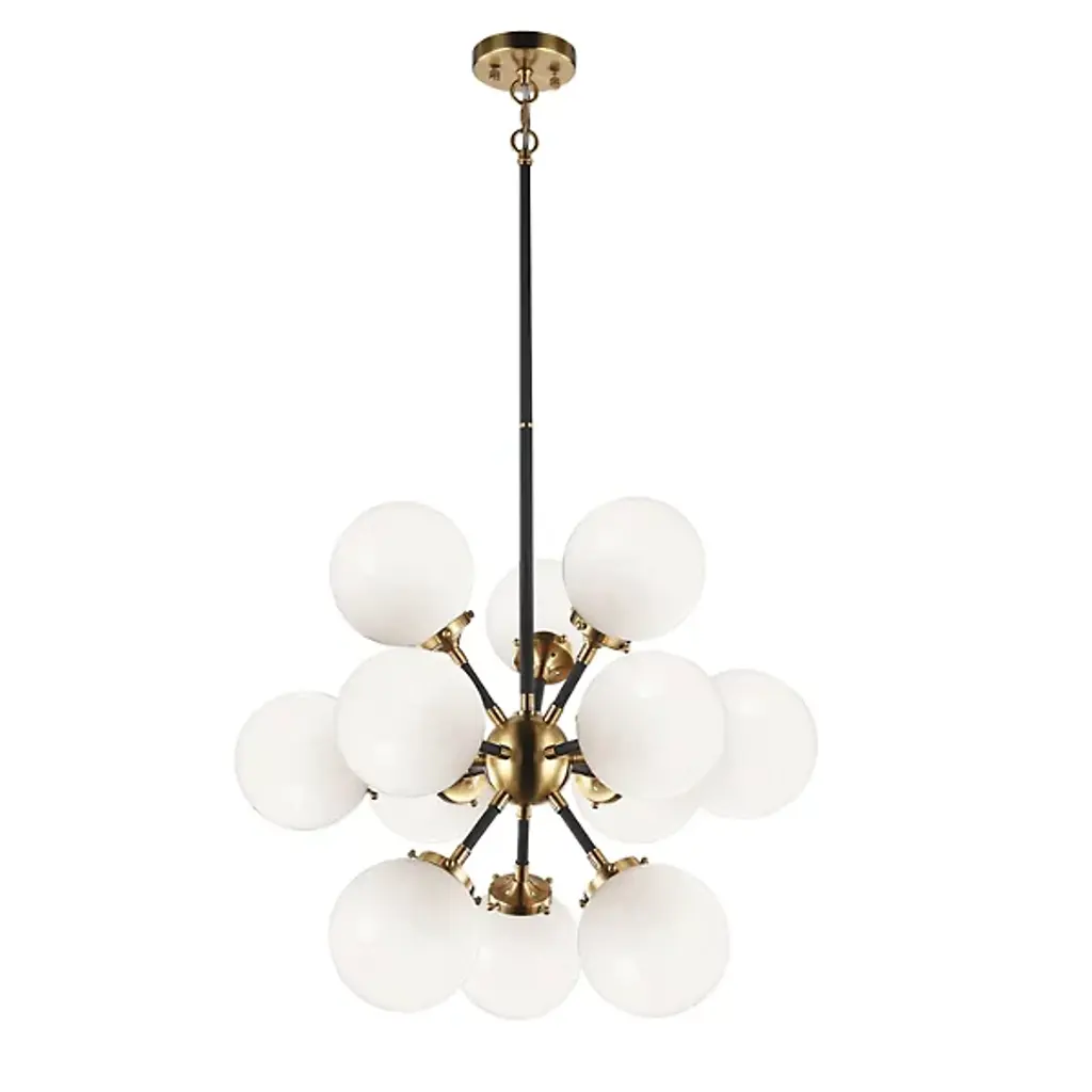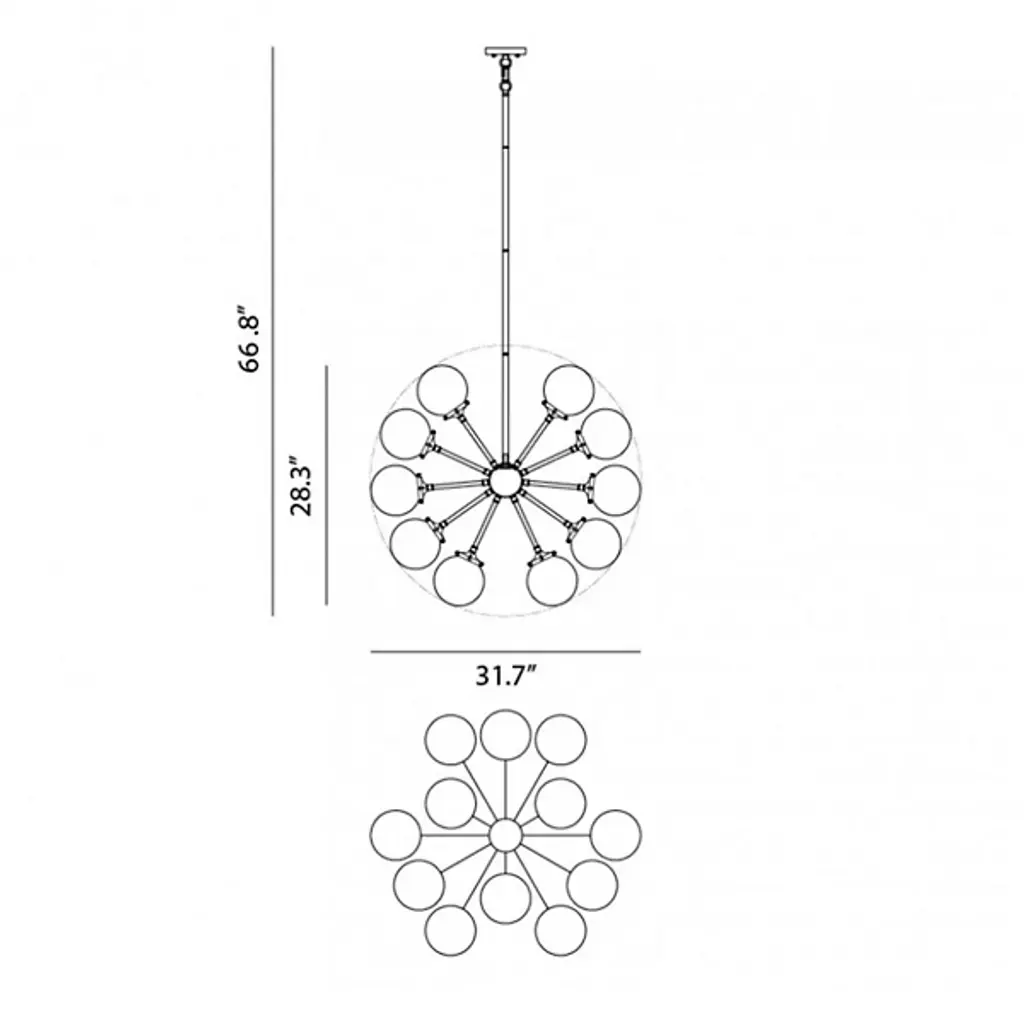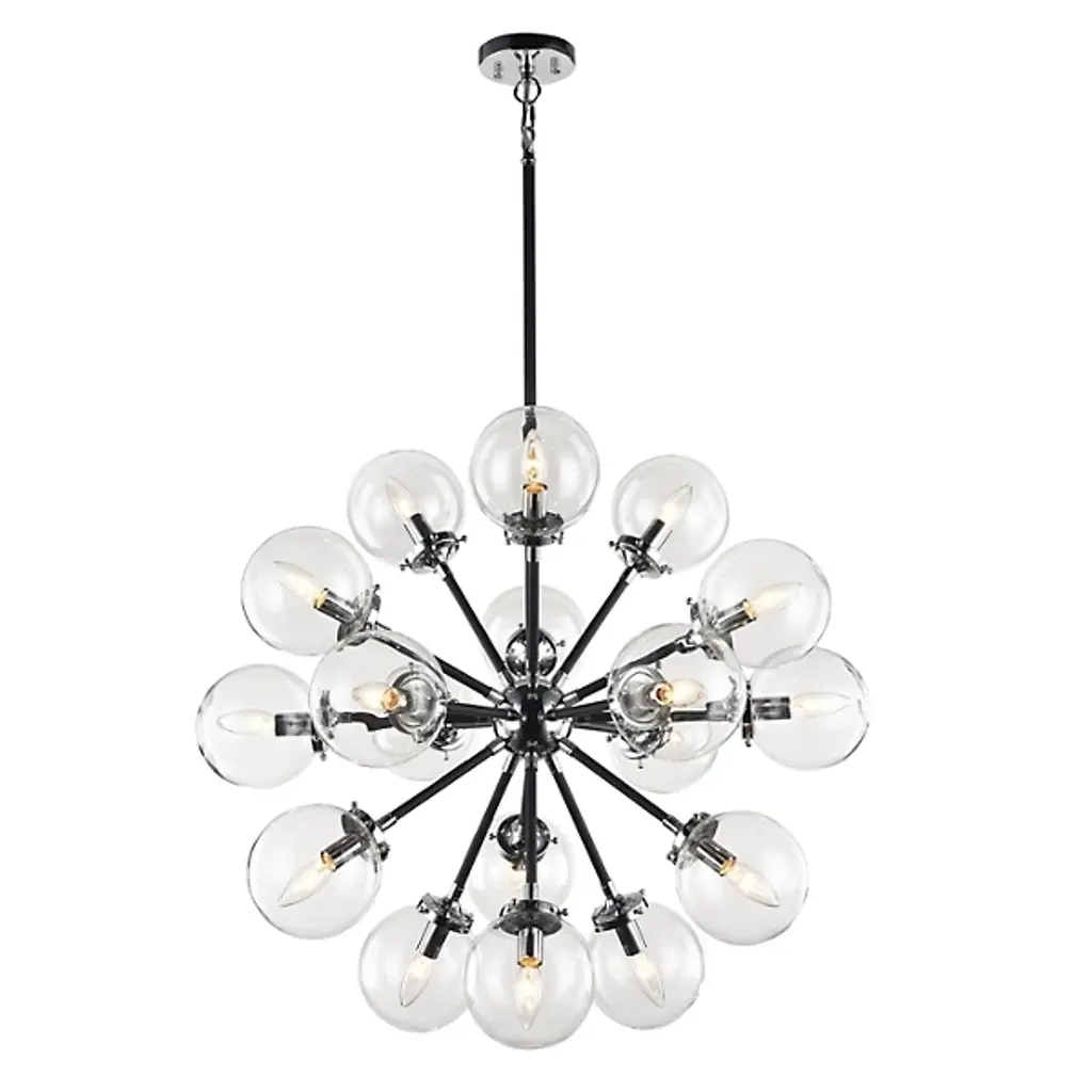 Launch your style to the stratosphere with the stylish sputnik shape of the Hoskins Chandelier by Alder & Ore. A slender stem drops down from a smooth circular ceiling mount, terminating in a round metal hub that holds out a series of small rods, each one blooming a single candelabra style socket. Best employed with retro-style bulbs, each lamp is set inside a spherical shade of clear glass, cutting the light’s direct glare while collaborating with its neighbors to create a warm sunburst arrangement.