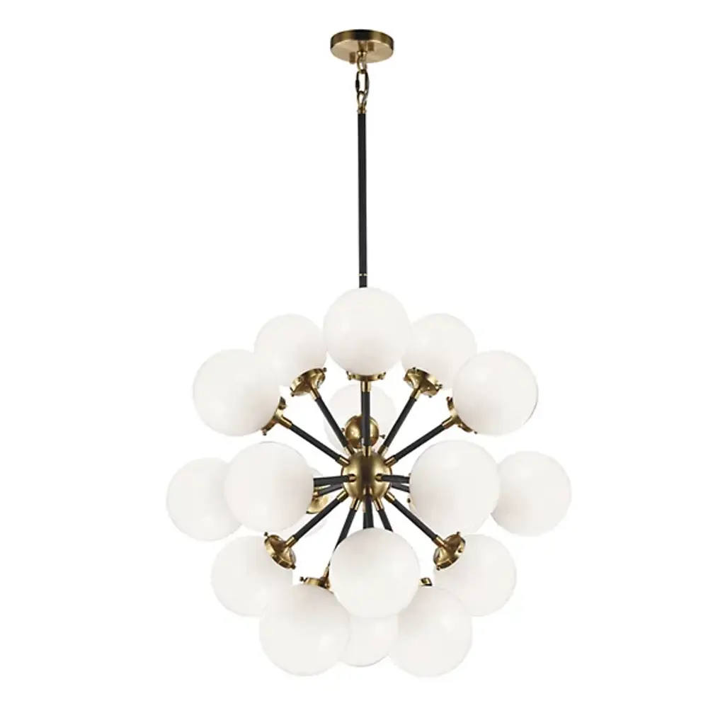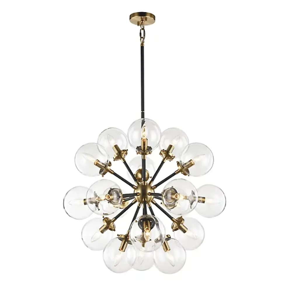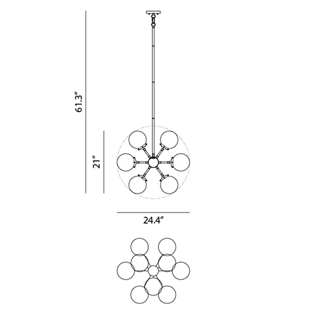 Launch your style to the stratosphere with the stylish sputnik shape of the Hoskins Chandelier by Alder & Ore. A slender stem drops down from a smooth circular ceiling mount, terminating in a round metal hub that holds out a series of small rods, each one blooming a single candelabra style socket. Best employed with retro-style bulbs, each lamp is set inside a spherical shade of clear glass, cutting the light’s direct glare while collaborating with its neighbors to create a warm sunburst arrangement.
