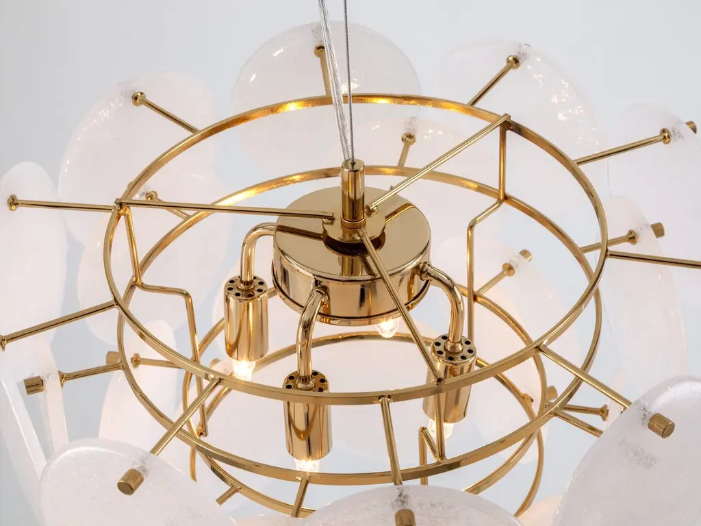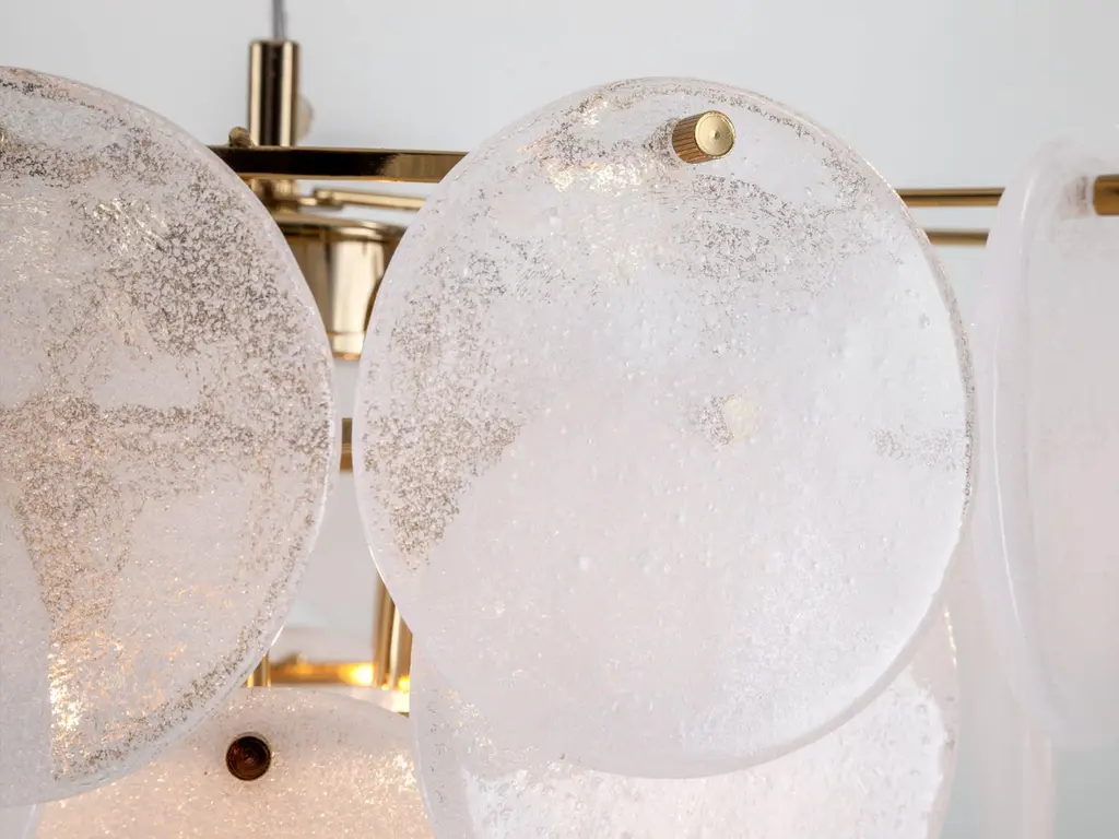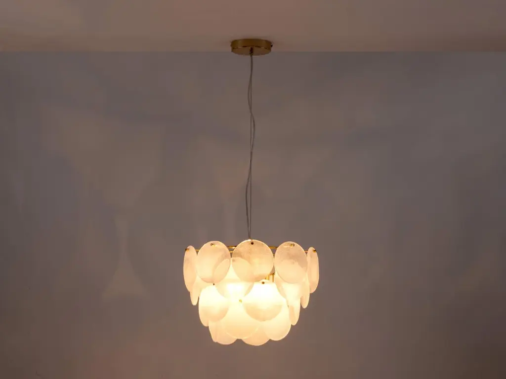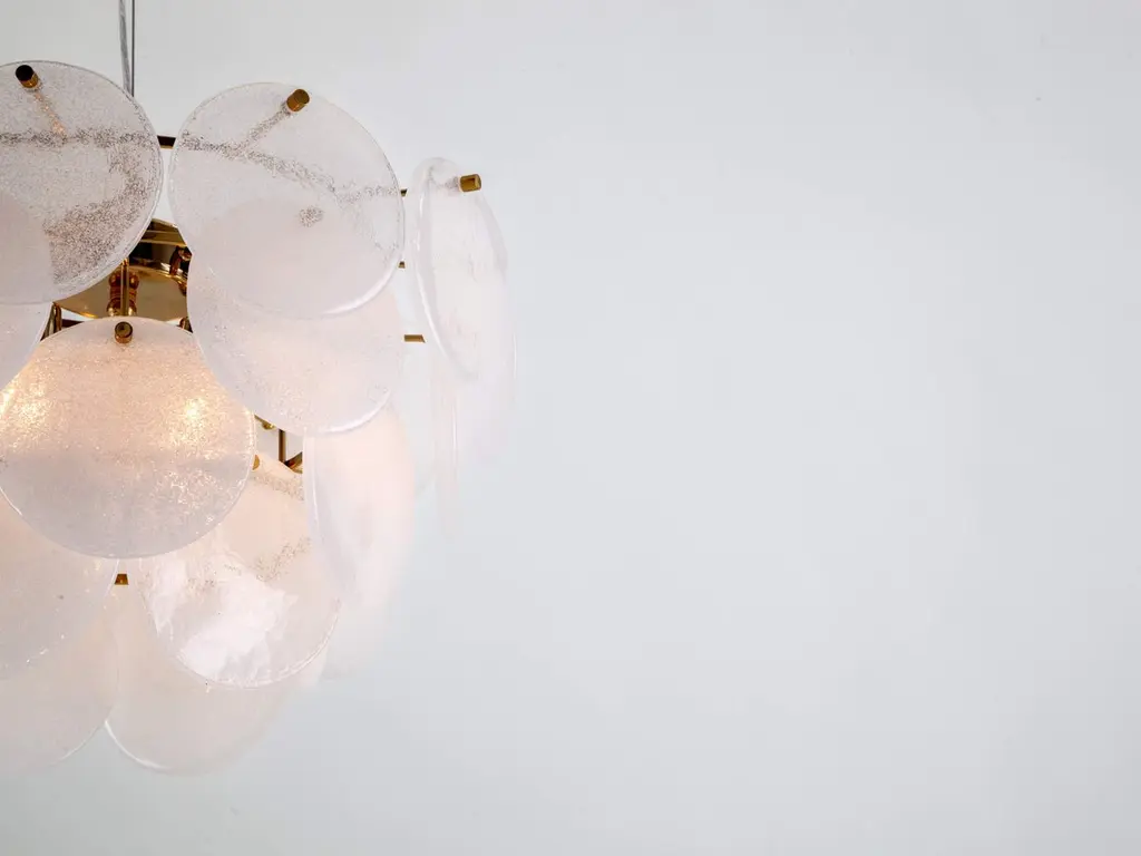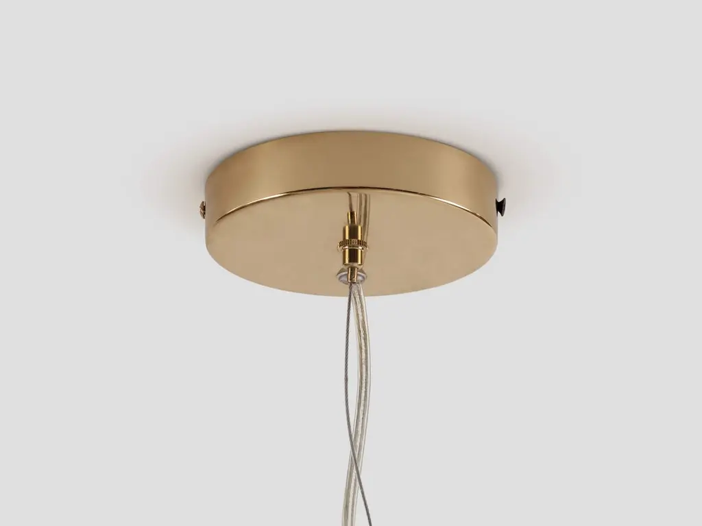 An elegant chandelier, perfect even for smaller rooms, this piece has become an icon in the houseof collection. Suspended on a brass frame, the glass disks delicately refract light across the room, creating a warm ambient glow. Ideal for styling in living rooms, bedrooms or dining rooms.Great lighting is about so much more than just illuminating a room. it should elevate a space, even during daylight hours. Our colourful designer lighting range has been designed "function first", offering covetable, unique lights and lamps in exclusive houseof designs and (of course) in statement houseof colours.Additional Information:Material: Metal with glass disk shadeColour: Brass and white glassProduction emissions: 6.887kg (carbon)Usage emissions: 176.133kg (carbon)Height: 159cmWidth: 46cmDepth: 46cmShade: 10cm x 10cmRose: 12cm x 12cmCable colour: ClearCable length: 100cmWeight: 7kgAdjustable: YesMinimum drop (with shade): 35cmMaximum drop (with shade): 133cmSpread of light: AmbientDimmable: YesFixture type: 240v (hardwired)Assembly required: YesSpare shade: YesIP rating: IP20Dimmable: YesEnergy rating: A++Care: Remove light from fitting and wipe carefully with a clean, soft, dry cloth.Lead time for UK orders 2 - 5 working days Lead time for US orders 5 - 10 working days.