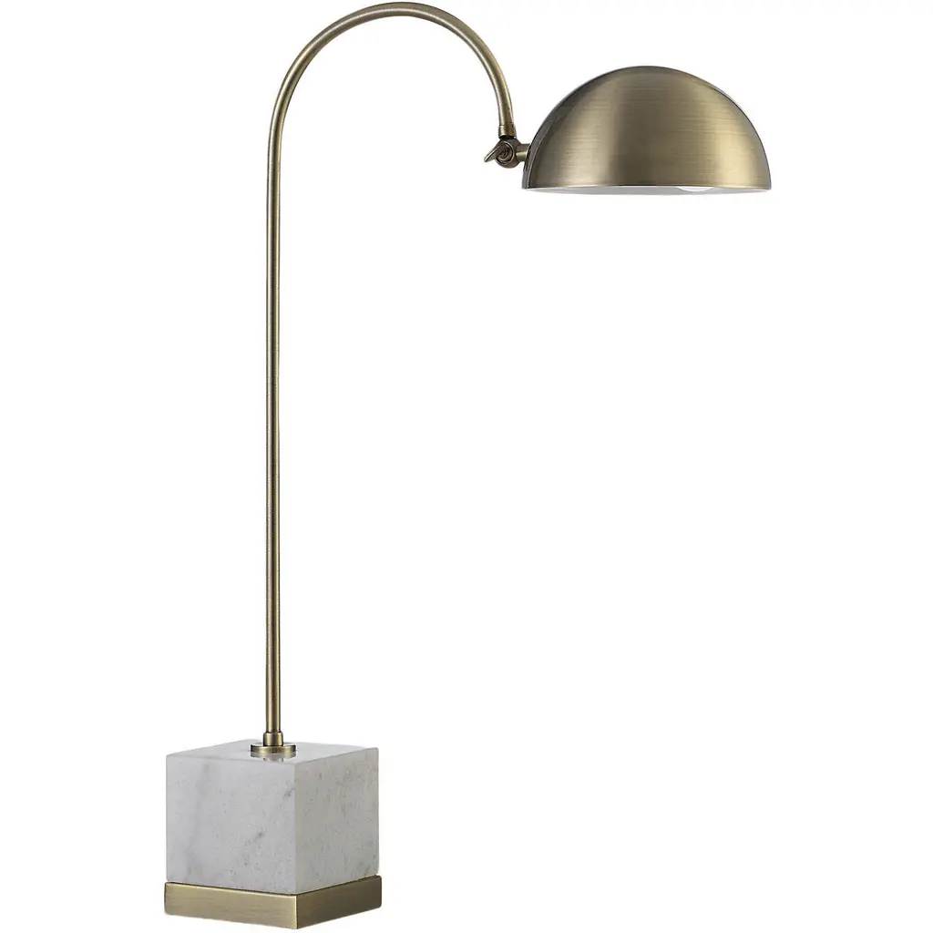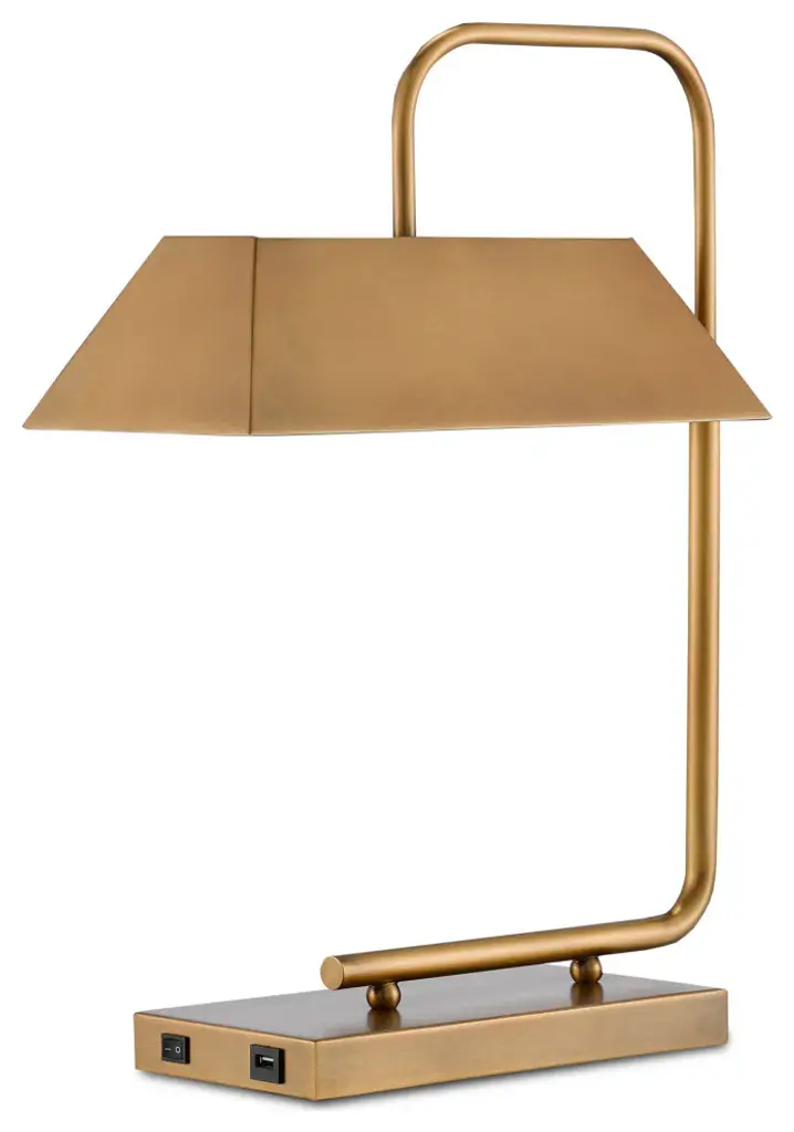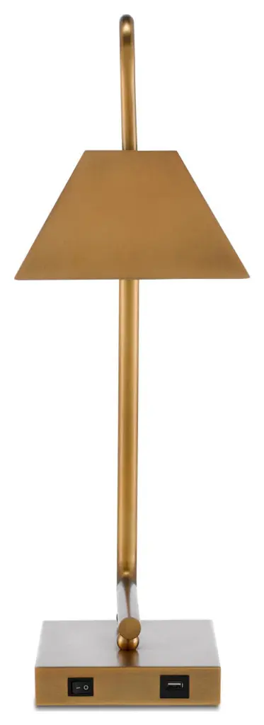 A perfect little desk lamp, our Hoxton Gold Table Lamp has a USB port in its base. Made of metal in a light antique brass finish, the gold lamp is an intermingling of geometric shapes that bring exhibit style. The rectangular shade completes the brass composition. We also offer the Hoxton in a nickel finish.Number of Lights: 2Type of Bulb: G GlobeBulb Wattage: 25Bulbs Included: No