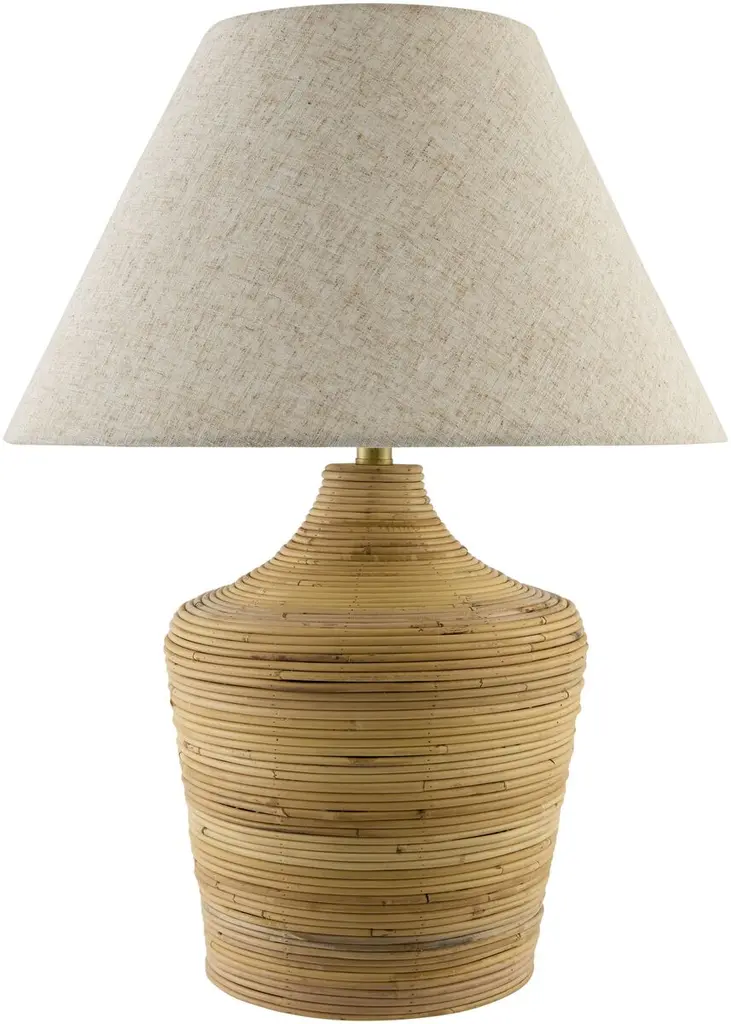 Merging the organic materiality of rattan wicker with a fashion-forward frame, Fair Haven masters the grand millennial aesthetic. Resembling the elegant flow of a skirt, the wicker base tapers in at the top, allowing light to shine over the intricate weave. The Aged Brass hardware complements the approachable warmth of the rattan. A light and voluminous addition to bedside tables and living room consoles, Fair Haven is a joy to behold.• Due to the one-of-a-kind nature of the medium, exact colors and patterns may vary slightly from the image shown.