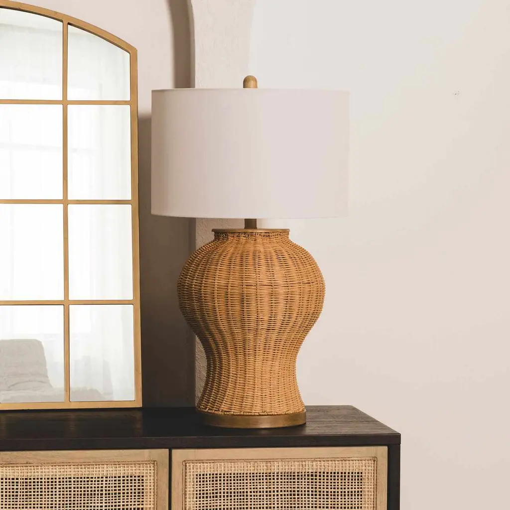 One Light Table Lamp from Newark collection in Vintage Gold Leaf finish. Number of Bulbs 1. Max Wattage 60.00 . No bulbs included. Goshen is familiar in shape, large in scale and effortlessly usable. The natural rattan base pairs with a white Belgian linen shade to bring an overall softness and organic feel to the piece. This table lamp adds a touch of coastal to any interior. No UL Availability at this time.