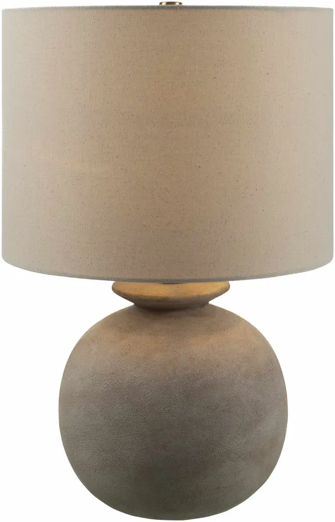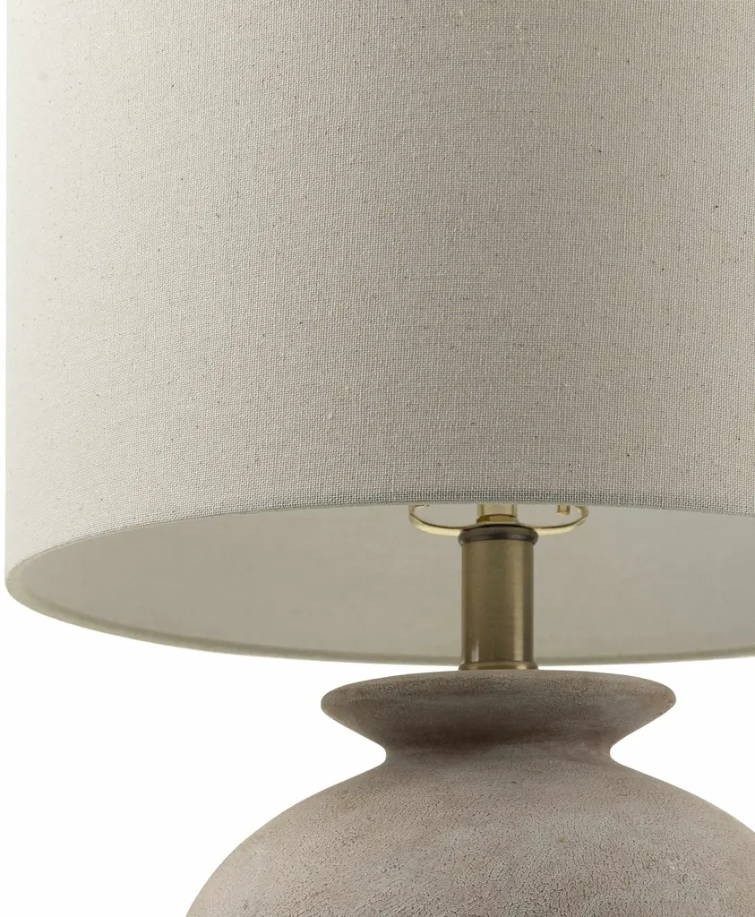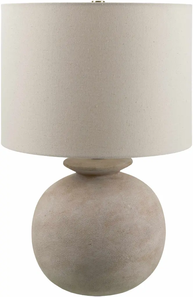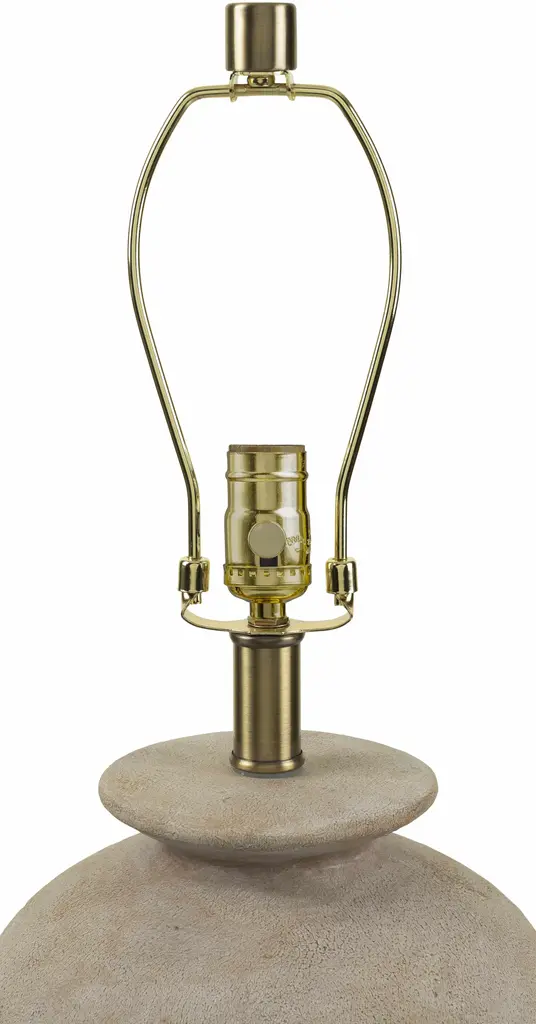 Collection: Huitzmaloc Colors: Cream, Beige, Metallic - Brass, Translucent Material: Body: Resin / Shade (Outside): Linen / Shade (Inside): Polyester / Finial: Iron Styles: Traditional Made In: China Lighting Type: Accent Table Lighting Shade Material: Linen, Polyester Shade Color: Beige, Beige Cord Length: 6' Switch Type: 3-Way Number of Bulbs: 1 Socket Type: E-26 Bulb Wattage: 100W