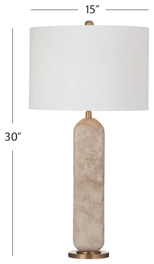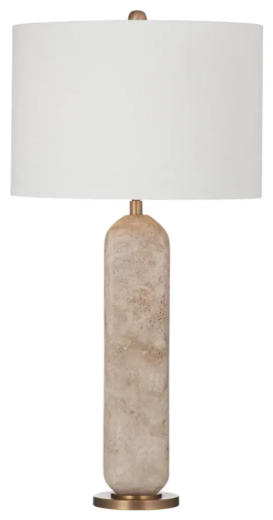 The Humboldt Table Lamp is skillfully crafted from travertine, accompanied by a white linen drum shade and adorned with brass elements. This lamp exemplifies a sophisticated design, seamlessly blending classic aesthetics with modern allure. Meticulously crafted with attention to detail, the Humboldt Table Lamp stands as a refined addition to interior spaces. The travertine and brass elements complement the lamp''s body, creating a visually appealing contrast. With its stylish design and meticulous craftsmanship, the Humboldt Table Lamp not only adds a modern edge to any room but also provides a soft and inviting illumination, making it a versatile and impactful contribution to interior decor.Features:The beige table lamp features a modern styleThe hard back linen lamp shade is a drum styleFeatures a 3 way switchThe 60" lamp cord allows for easy placementBulb type a required, not includedEasy assembly - just attach harp, finial and shadeFor over a century, Bassett Mirror has been synonymous with style and quality, transforming homes with its sophisticated and timeless designs. With a wide-ranging collection of furniture, lighting, mirrors, and art, Bassett Mirror seamlessly blends modern style with classic appeal. From rustic modern to luxe glam, each piece is thoughtfully crafted to inspire and elevate any space. Committed to exceptional value and customer care, Bassett Mirror makes it easy for homeowners to create beautiful, personalized interiors with confidence.