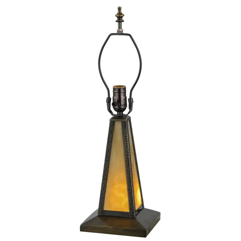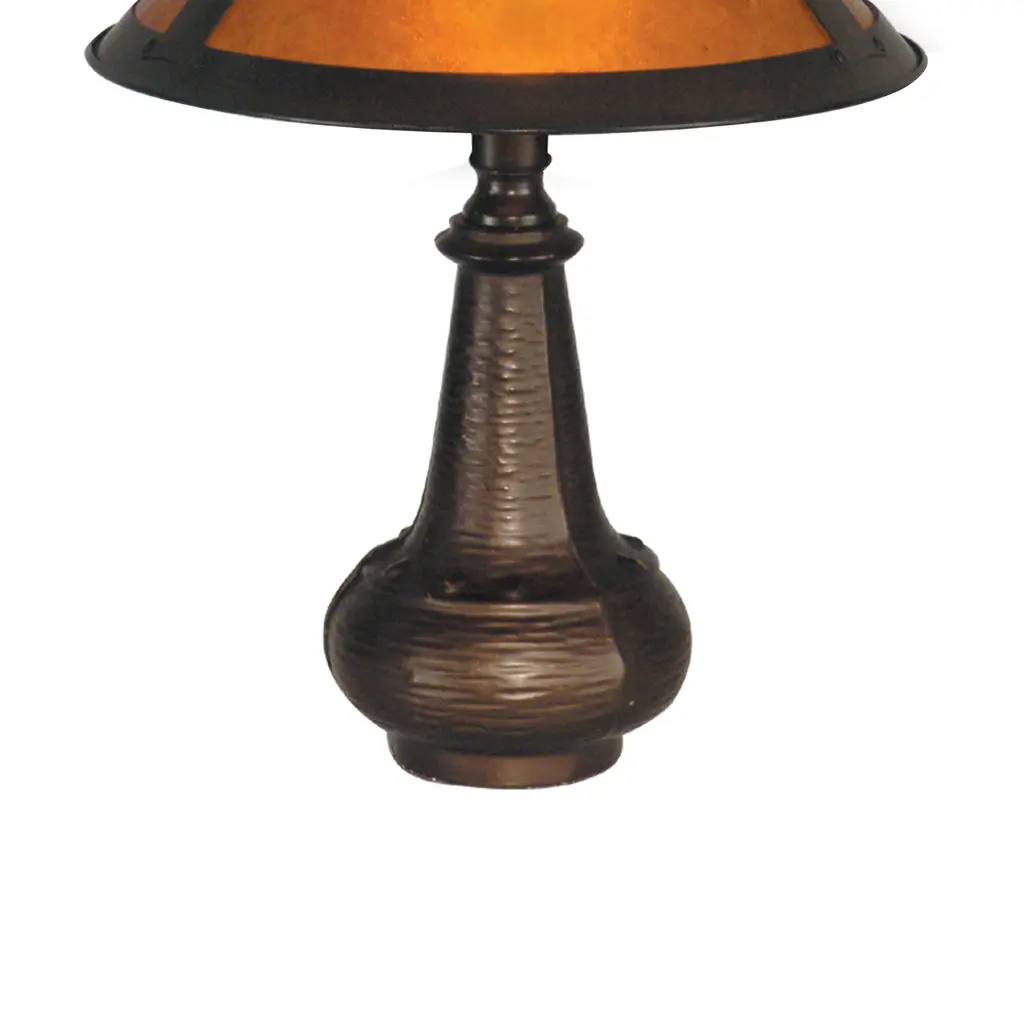The Hunter accent lamp, from our Classic Mica Collection is a good choice for those out of the way areas that need an extra splash of light from a lamp that genuinely stands out and becomes the focal point of the room. Deep, dark amber tones in the mica shade cast a rich glow when the lamp is illuminated. The cone shade features a bold frame. The beautifully simple jar base is textured and finished in antique bronze, which perfectly accents the mica shade. 10" W x 16" H. Shade 10" diameter. 1 x 25W candelabra.
