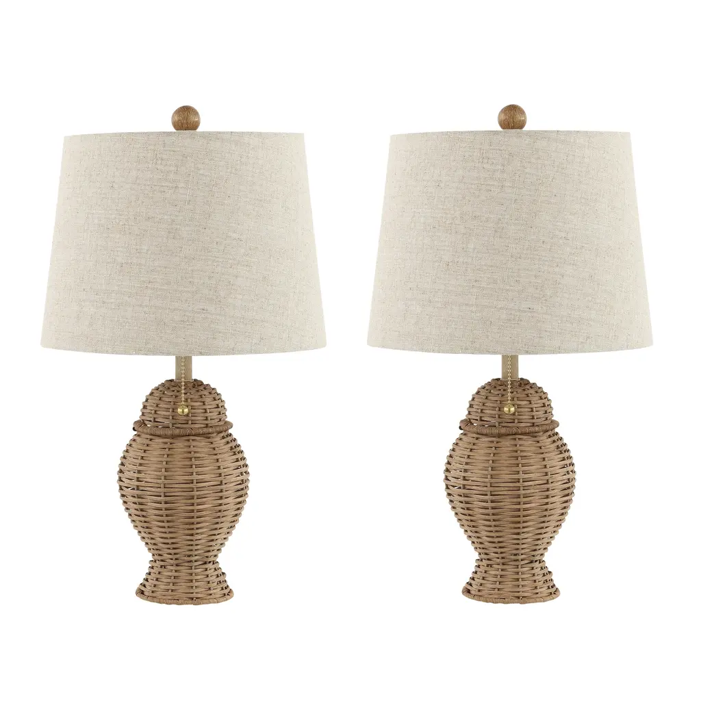 Our pair of classic midcentury wicker lamps features a woven ginger-jar base with a linen shade. These 20.5" tall lamps make a perfect pair for the bedroom, living room, or entry console. The timeless silhouette is ideal for a mid-century home, rustic cottage or beach house.Features:Dimensions:About us:You see a lamp.We see a decorative work of art.A perfectly curved shade casts a dramatic shadow on a floor. A silk cord you never want to hide. Compatible with LED lightbulbs: as easy on the environment as they are on the eyes. The JONATHAN Y Lighting collection considers every detail from impeccably sourced materials to designer styling. And our prices are so attractive, we've transformed a functional necessity into a fashion accessory.JONATHAN Y Lighting - a fashion revolution in home decor.