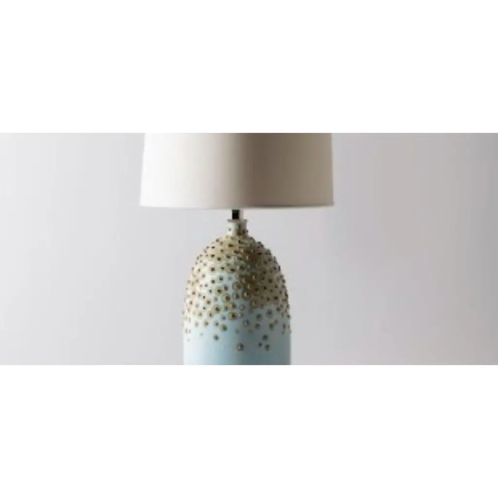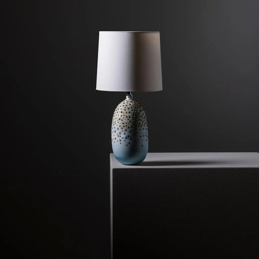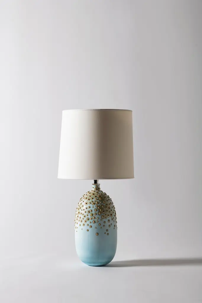 Huxley lamp in Glacier by Elyse GrahamDimensions: D26 x H51 cmMaterials: Plaster, Resin, Cotton rag Paper, brass, Nickel.Hardware: polished nickel-plated brass UNO threaded socketwith turn key switch, in-line dimmer.Molded, dyed, and finished by hand in LA. CustomizationAvailable.All pieces are made to order. All our lamps can be wired according to each country. If sold to the USA it will be wired for the USA for instance.This collection is inspired by the unique galaxy of microorganisms living within each of us. We created a technique for dying and stippling each base that evokes the nature of microbes as they grow and colonize. The base of each lamp is hand-cast with hydrocal plaster inside of a unique balloon shape. The interior of each piece is poured with layers of resin, impregnating the plaster with added strength and hardness. Finally, each base is hand-dyed with custom mixed pigments and finished with a unique pattern of dyed plaster protuberances. The exterior is sealed with a UV resistant acrylic coating. Our shades are made by hand using a heavyweight cotton rag paper and attached to a nickel-plated swivel fixture with a turn switch. An in-line dimmer switch on the cord provides adjustable light settings. Due to the nature of the UV sensitive materials in our lamp bases we recommend using LED lightbulbs exclusively.Meet our teamElyse Graham is the founder and creative director of the studio. Driven by Elyse’s unique vision of building a studio that fosters and emphasizes connection, play, and experimentation (of people, processes, and in turn the objects created and shared) our small team works closely and collaboratively on each project. Elyse received a BA in sculpture and semiotics at Brown University. After years of making sculpture and running a business in jewelry design, Elyse decided to merge her separate practices and redirect her attention toward collectible design in 2013. The creative trajectory of the studio is heavily influenced by Graham’s background in fine art, specifically her interest in process-driven and material-based artwork. The studio’s vocabulary of shapes, patterns, and forms comes from a lineage of unconventional processes Graham has developed and built for working with plaster and resin. Graham shares her studio as well as her home with her husband, Lewis Mauk and their daughter, Eero. Miller Robinson is head of our production department. From pigmenting and casting materials for all of our products in plaster and resin to graphic and production design, they wear many hats in our studio. Miller joined our team in 2014 and has been an integral part of designing many of our experimental processes that have lead to the creation of our unique MetaMATERIAL. Like Elyse, Miller has a background in material and process-oriented making, which led to an instant connection and collaborative understanding between the two. Miller received their BFA from Otis College of Art and Design with a focus on painting, installation, performance, and writing. Their individual art practice focuses on the preservation and potentialities of underrepresented histories and encompasses objects, garments, actions, tattooing, and books. Their personal work has been exhibited in Los Angeles at the Southwest Museum, Los Angeles Municipal Art Gallery, Heritage Square Museum, and with Los Angeles Contemporary Exhibitions (LACE), as well as HORESEANDPONY Fine Arts in Berlin.Lewis Mauk is our studio and operations engineer. Working on facilities and production design as well as engineering and leading all of our large-scale constructions and installations, Lewis’ unique set of technical skills gives form and structure to our studio’s unconventional ideas and processes. Lewis has been working behind-the-scenes since the creation of the studio but joined our team full-time in 2020. Consistent with the rest of our team, Lewis has a background in process-driven fine art and has extensive training in woodworking, printmaking, and photography. He received a MFA from CalArts and has worked across the fields of education and fabrication. Lewis’ combined interest in the creation of personal archives mixed with his commitment to sustainable life practices, has brought a focus and important emphasis on designing studio projects and processes that imagine ways to reduce and reuse studio material fragments.