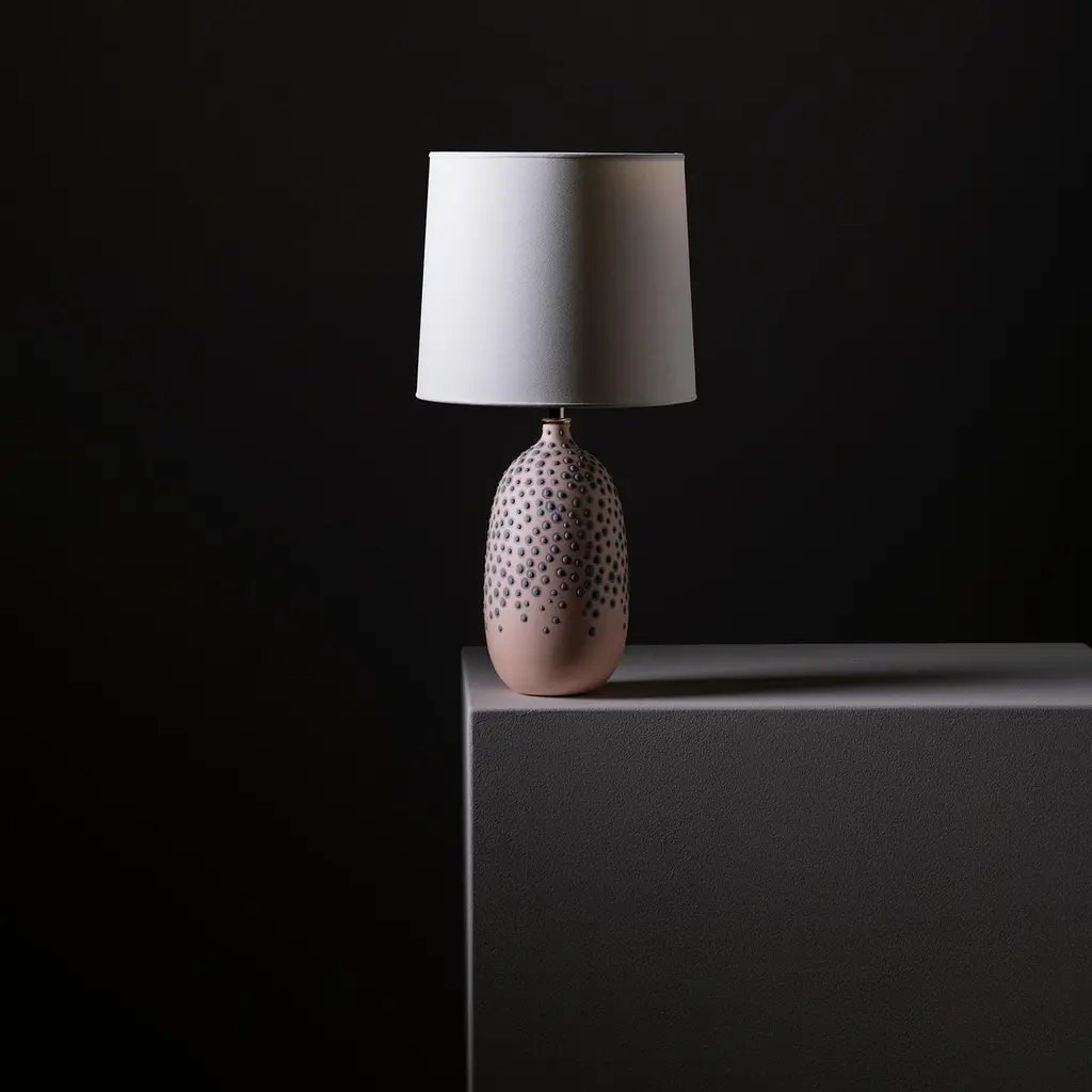 Huxley lamp in Peach by Elyse GrahamDimensions: D26 x H51 cmMaterials: Plaster, Resin, Cotton rag Paper, brass, Nickel. HARDWARE: POLISHED NICKEL-PLATED BRASS UNO THREADED SOCKETwith TURN KEY SWITCH, IN-LINE DIMMER.MOLDED, DYED, AND FINISHED BY HAND IN LA. CUSTOMIZATIONAVAILABLE.ALL PIECES ARE MADE TO ORDER. All our lamps can be wired according to each country. If sold to the USA it will be wired for the USA for instance.This collection is inspired by the unique galaxy of microorganisms living within each of us. We created a technique for dying and stippling each base that evokes the nature of microbes as they grow and colonize. The base of each lamp is hand-cast with hydrocal plaster inside of a unique balloon shape. The interior of each piece is poured with layers of resin, impregnating the plaster with added strength and hardness. Finally, each base is hand-dyed with custom mixed pigments and finished with a unique pattern of dyed plaster protuberances. The exterior is sealed with a UV resistant acrylic coating. Our shades are made by hand using a heavyweight cotton rag paper and attached to a nickel-plated swivel fixture with a turn switch. An in-line dimmer switch on the cord provides adjustable light settings. Due to the nature of the UV sensitive materials in our lamp bases we recommend using LED lightbulbs exclusively.MEET OUR TEAMElyse Graham is the founder and creative director of the studio. Driven by Elyse’s unique vision of building a studio that fosters and emphasizes connection, play, and experimentation (of people, processes, and in turn the objects created and shared) our small team works closely and collaboratively on each project. Elyse received a BA in sculpture and semiotics at Brown University. After years of making sculpture and running a business in jewelry design, Elyse decided to merge her separate practices and redirect her attention toward collectible design in 2013. The creative trajectory of the studio is heavily influenced by Graham’s background in fine art, specifically her interest in process-driven and material-based artwork. The studio’s vocabulary of shapes, patterns, and forms comes from a lineage of unconventional processes Graham has developed and built for working with plaster and resin. Graham shares her studio as well as her home with her husband, Lewis Mauk and their daughter, Eero. Miller Robinson is head of our production department. From pigmenting and casting materials for all of our products in plaster and resin to graphic and production design, they wear many hats in our studio. Miller joined our team in 2014 and has been an integral part of designing many of our experimental processes that have lead to the creation of our unique MetaMATERIAL. Like Elyse, Miller has a background in material and process-oriented making, which led to an instant connection and collaborative understanding between the two. Miller received their BFA from Otis College of Art and Design with a focus on painting, installation, performance, and writing. Their individual art practice focuses on the preservation and potentialities of underrepresented histories and encompasses objects, garments, actions, tattooing, and books. Their personal work has been exhibited in Los Angeles at the Southwest Museum, Los Angeles Municipal Art Gallery, Heritage Square Museum, and with Los Angeles Contemporary Exhibitions (LACE), as well as HORESEANDPONY Fine Arts in Berlin.Lewis Mauk is our studio and operations engineer. Working on facilities and production design as well as engineering and leading all of our large-scale constructions and installations, Lewis’ unique set of technical skills gives form and structure to our studio’s unconventional ideas and processes. Lewis has been working behind-the-scenes since the creation of the studio but joined our team full-time in 2020. Consistent with the rest of our team, Lewis has a background in process-driven fine art and has extensive training in woodworking, printmaking, and photography. He received a MFA from CalArts and has worked across the fields of education and fabrication. Lewis’ combined interest in the creation of personal archives mixed with his commitment to sustainable life practices, has brought a focus and important emphasis on designing studio projects and processes that imagine ways to reduce and reuse studio material fragments.