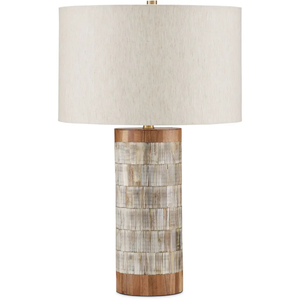 A composition of natural horn and wood, the Hyson Table Lamp is at once modern and primitive. The clean-lined columnar shape of the body puts the brown table lamp in the contemporary category while the graining in the natural wood, the texture of the chiseled bone, and the highly textured natural linen drum shade concocts the ruse that it is a vintage piece. The hardware and finial in a brass finish add to the warmth of the Hyson.