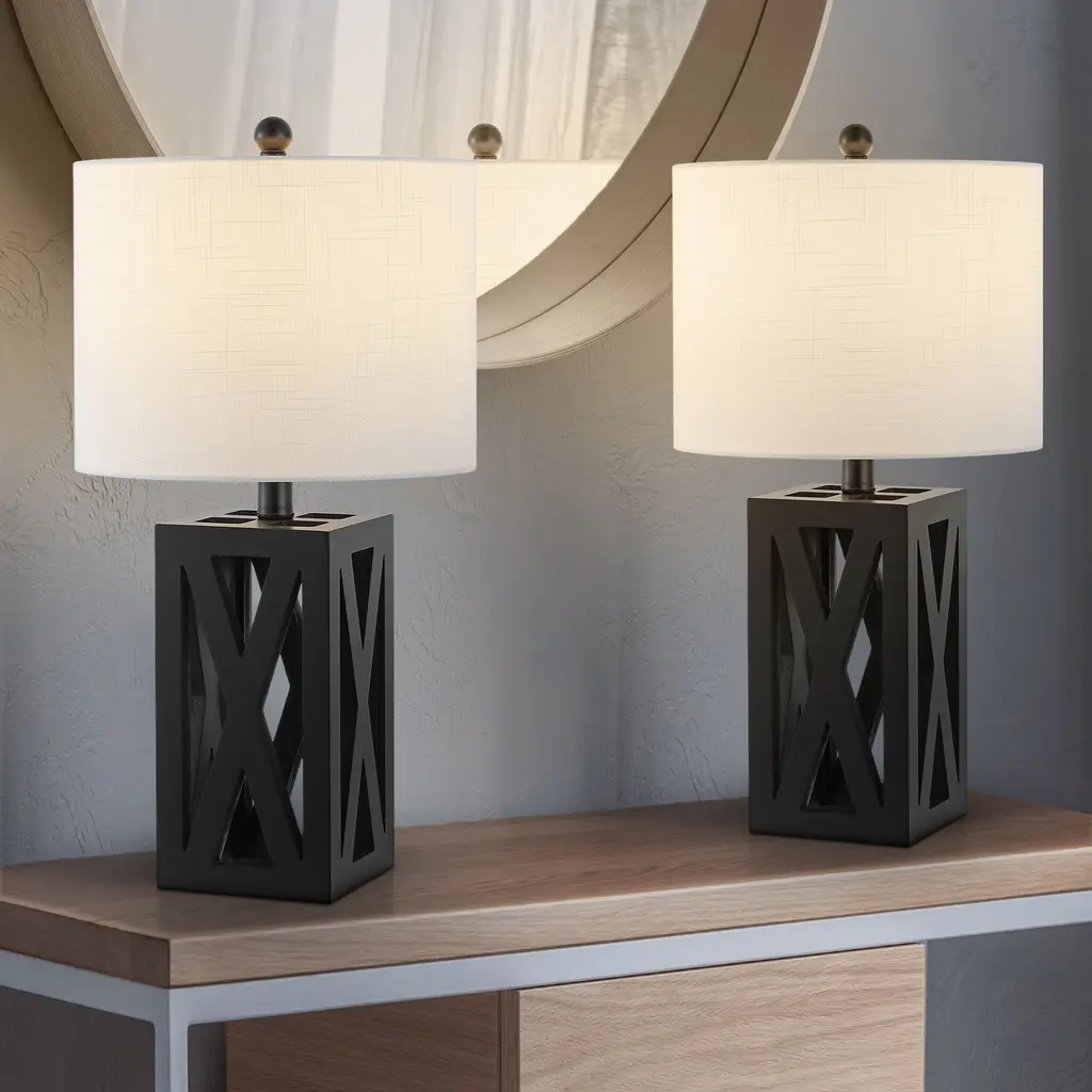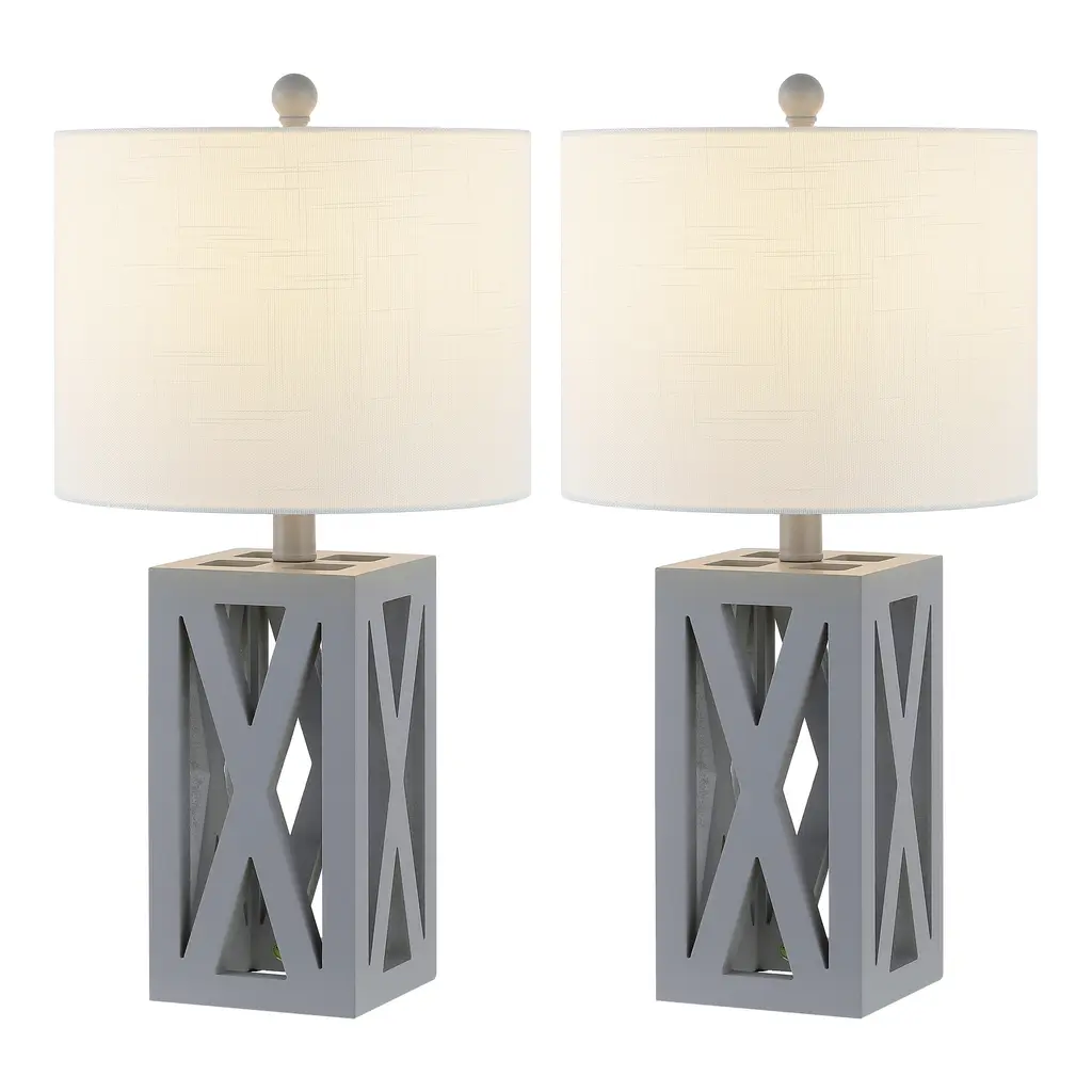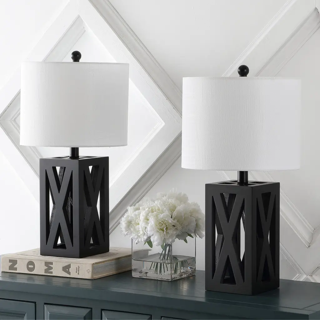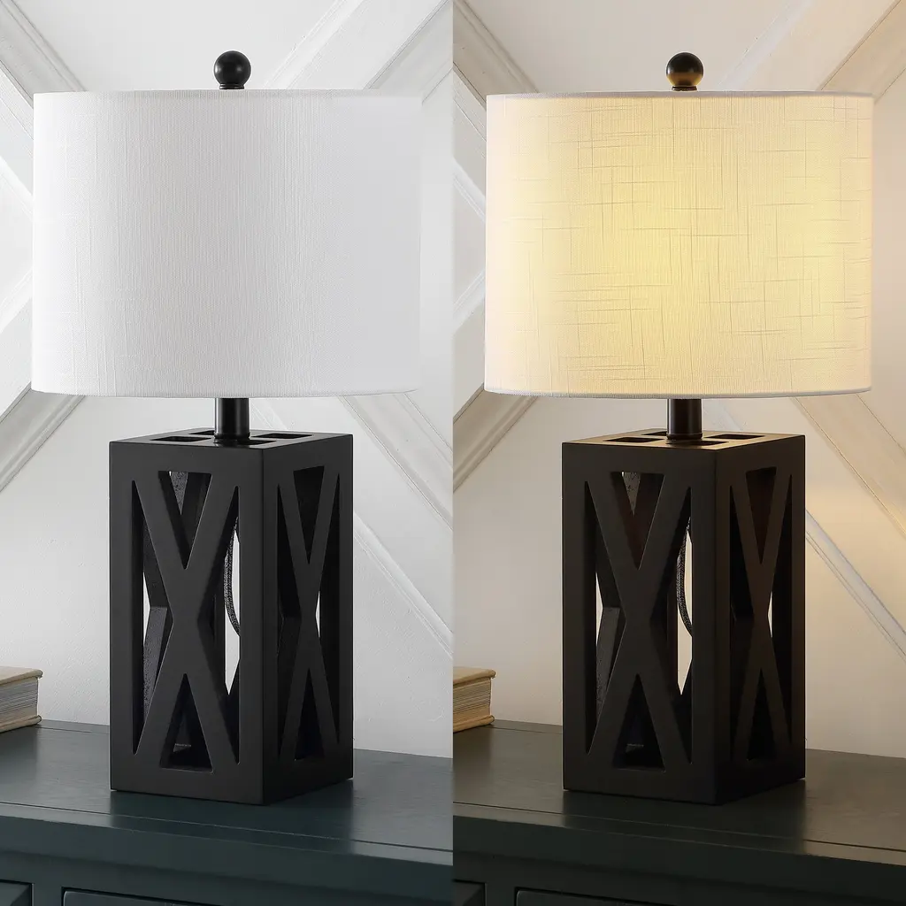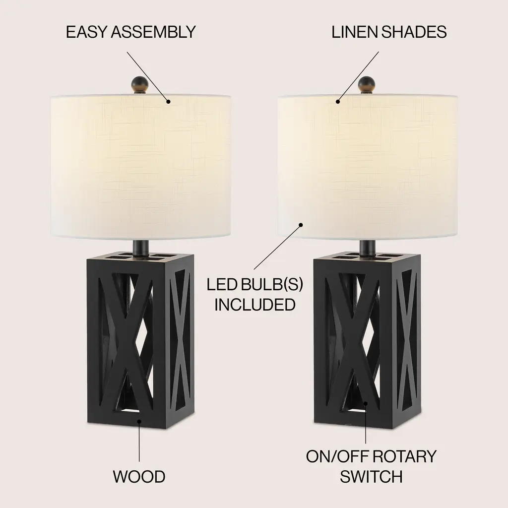 This gorgeous wooden lamp has an earthy texture and a geometric open structure that would easily blend with traditional, rustic, or contemporary décor. Designers love the silk-wrapped cord, linen drum shade, and wooden finial. At 21.5" high, it would sit perfectly atop a desk, armoire, or side table.Features:Dimensions:About us:You see a lamp.We see a decorative work of art.A perfectly curved shade casts a dramatic shadow on a floor. A silk cord you never want to hide. Compatible with LED lightbulbs: as easy on the environment as they are on the eyes. The JONATHAN Y Lighting collection considers every detail from impeccably sourced materials to designer styling. And our prices are so attractive, we've transformed a functional necessity into a fashion accessory.JONATHAN Y Lighting - a fashion revolution in home decor.