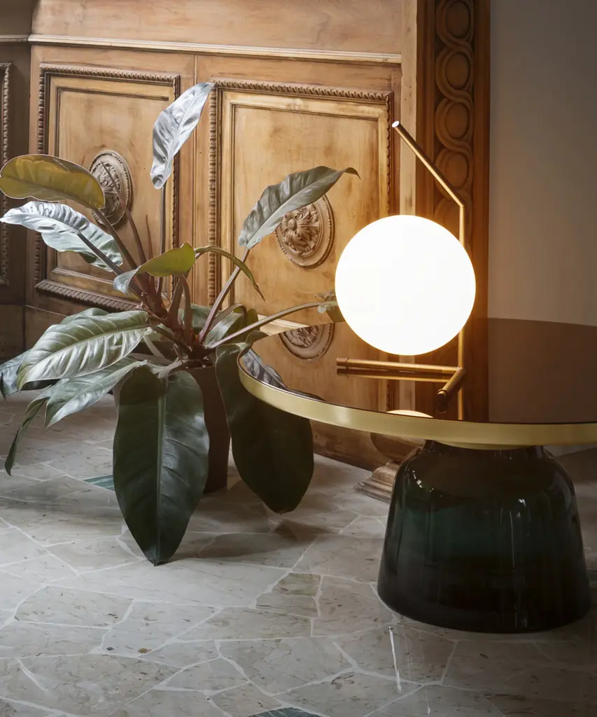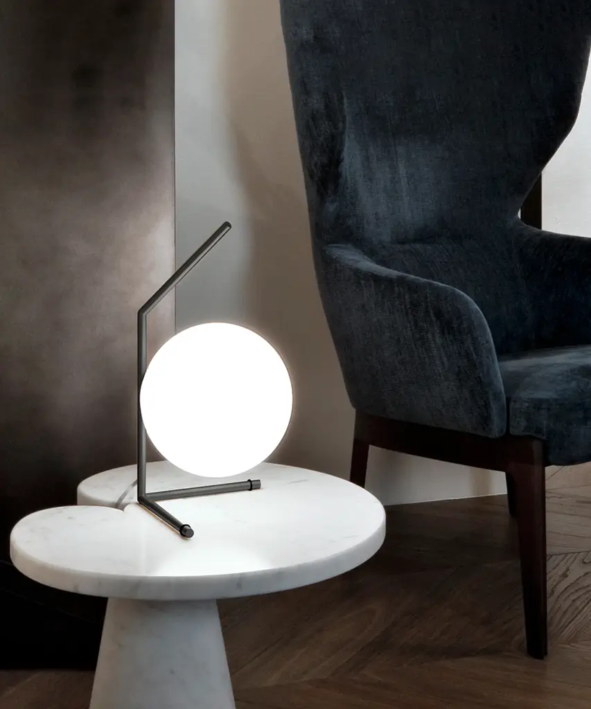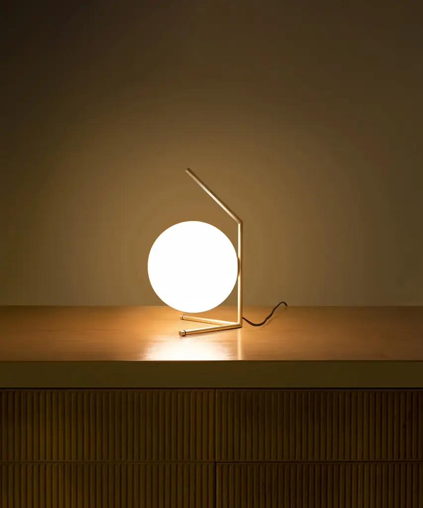 Like the other pieces in his IC Light Series, the IC Lights table balances designer Michael Anastassiades' love of industrial simplicity with intricate symbolism. It provides diffused light through a mouth-blown opaline sphere, which is held up by a brass-plated steel frame. There is a dimmer on the power cord. IC Lights table lamp comes in three models in black, brass or chrome finish:- IC Lights T1 High: height 20.8"; base width 12.6"- IC Lights T1 Low: height 15"; base width 6.9"- IC Lights T2: height 13.7"; base width 11" Discover the complete IC Lights collection here. The inspiration behind the design: Poise is powerful: That's the message Michael Anastassiades offers with his IC Light Series. From the skillful balance of the sphere and baton that invokes thoughts of a dexterous juggler's act to the lamp's name-IC, a reference to the identity code used to evaluate immigrants entering the UK-the designer makes a commanding statement. This authentic design is produced in Italy exclusively by Flos.