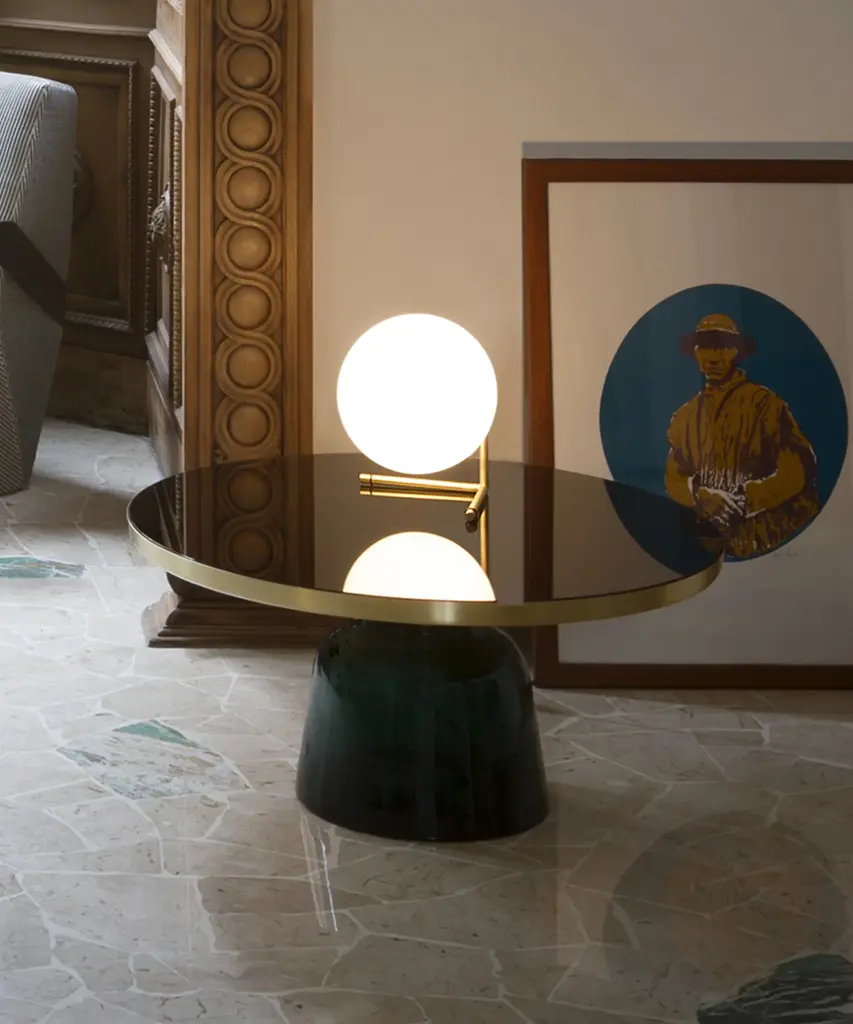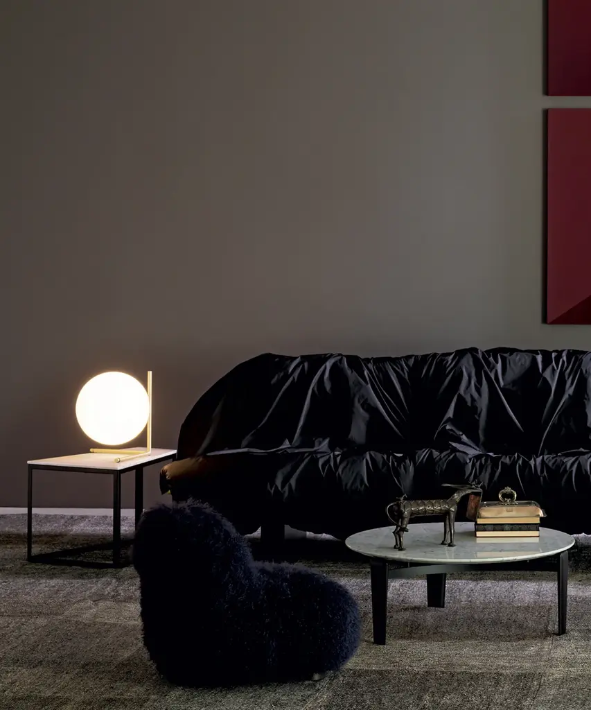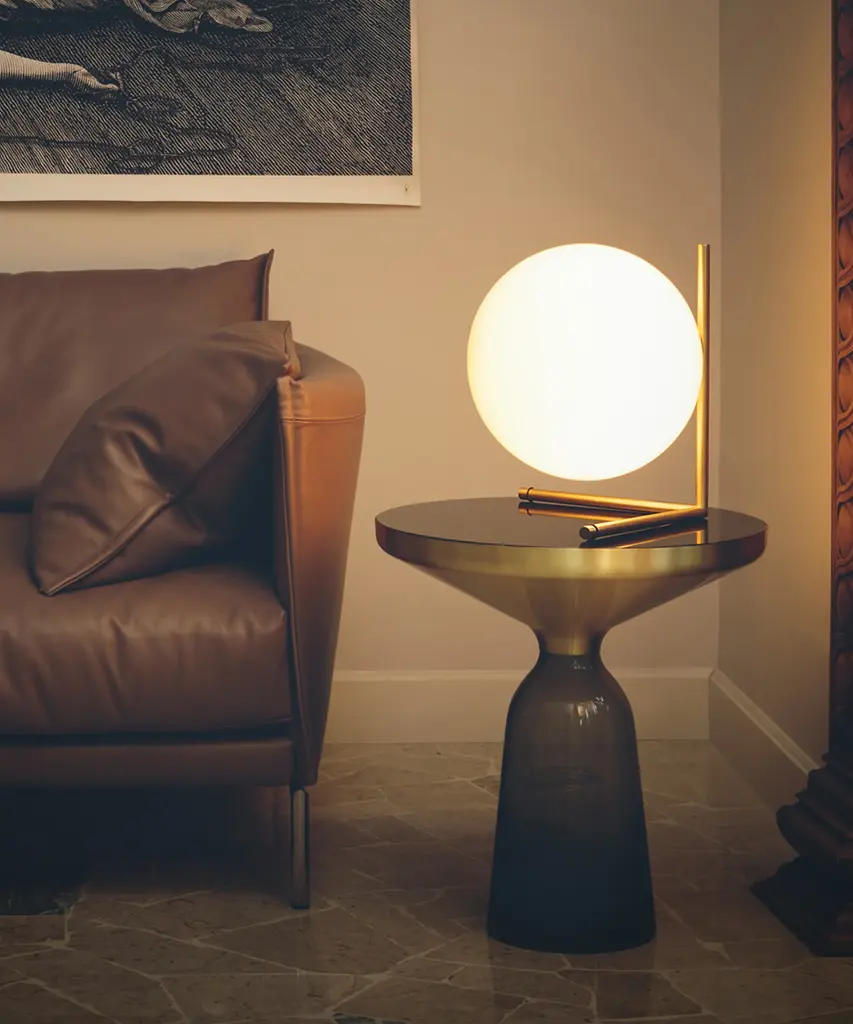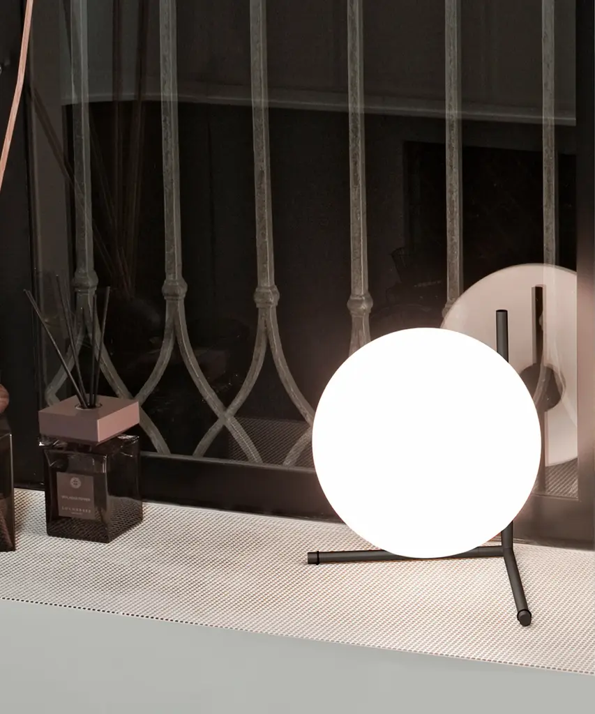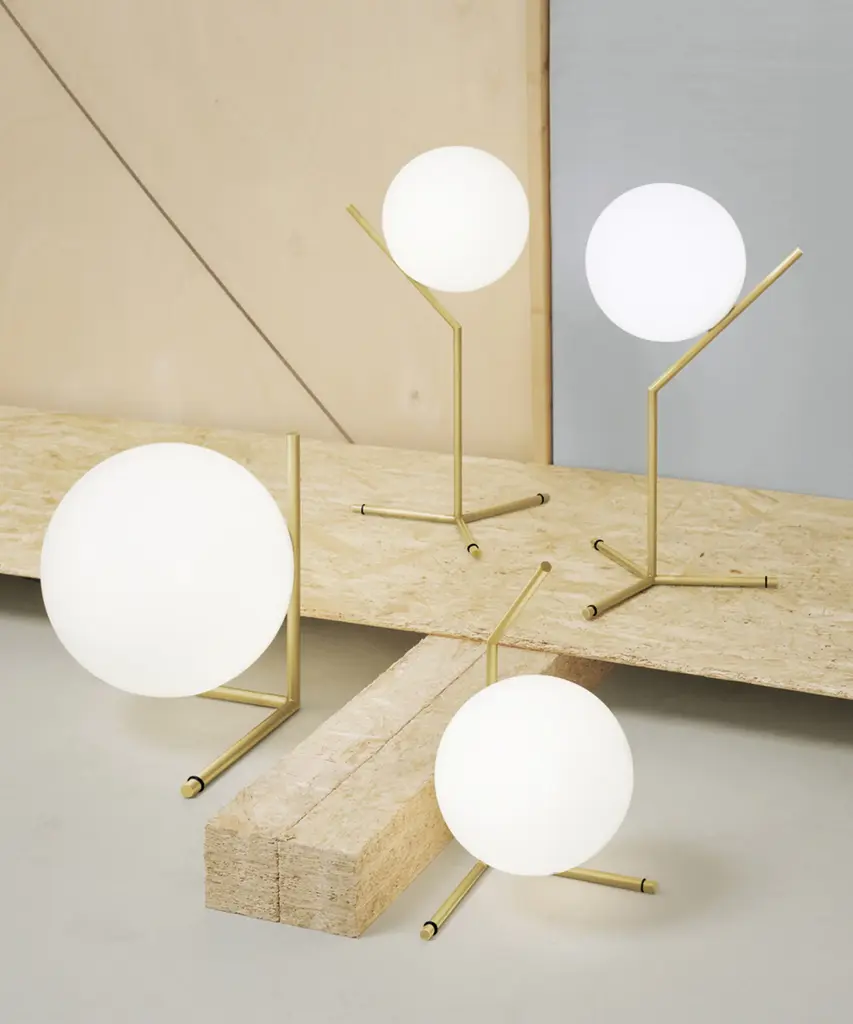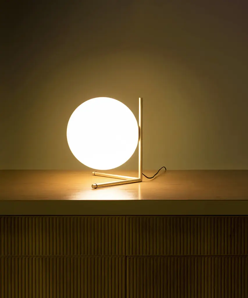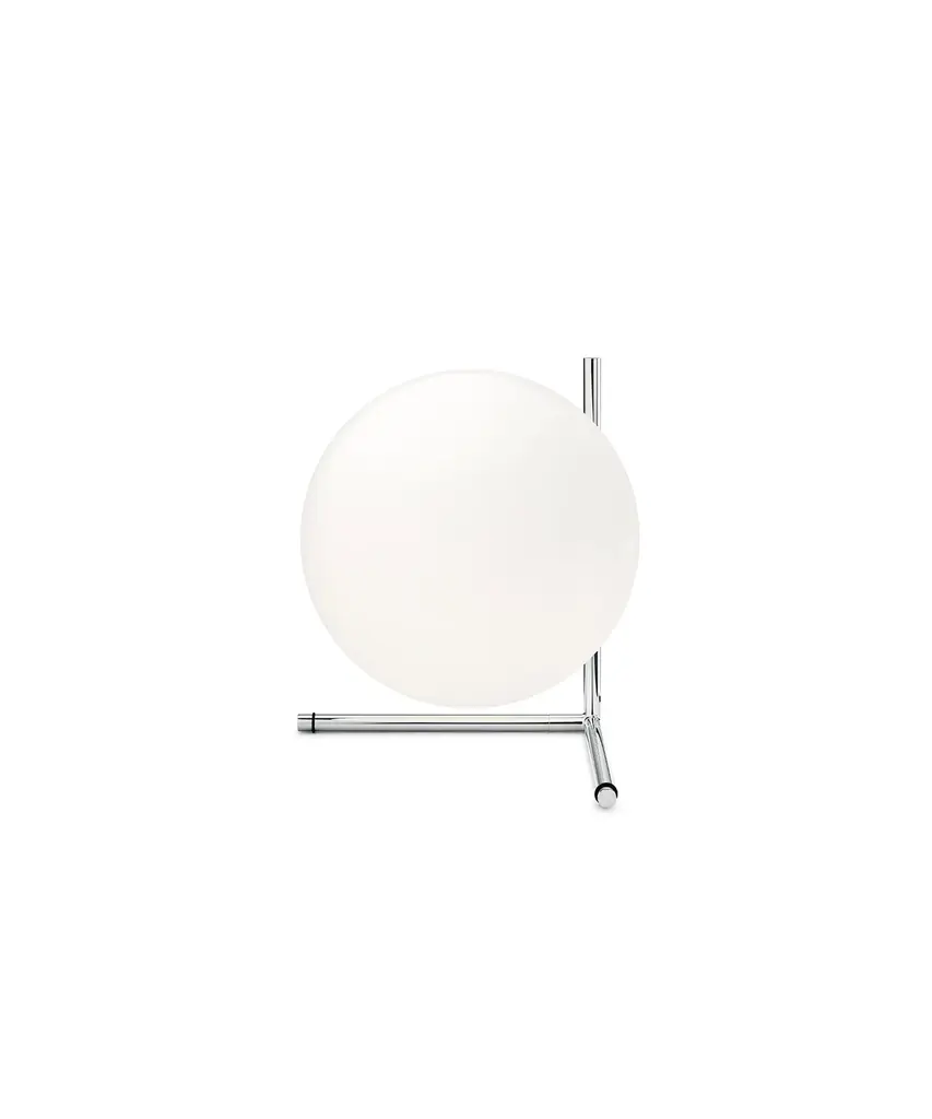 Like the other pieces in his IC Light Series, the IC Lights table balances designer Michael Anastassiades' love of industrial simplicity with intricate symbolism. It provides diffused light through a mouth-blown opaline sphere, which is held up by a brass-plated steel frame. There is a dimmer on the power cord. IC Lights table lamp comes in three models in black, brass, or chrome finish:- IC Lights T1 High: height 20.8"; base width 12.6"- IC Lights T1 Low: height 15"; base width 6.9"- IC Lights T2: height 13.7"; base width 11" Discover the complete IC Lights collection here. The inspiration behind the design: Poise is powerful: That's the message Michael Anastassiades offers with his IC Light Series. From the skillful balance of the sphere and baton that invokes thoughts of a dexterous juggler's act to the lamp's name-IC, a reference to the identity code used to evaluate immigrants entering the UK-the designer makes a commanding statement. This authentic design is produced in Italy exclusively by Flos.