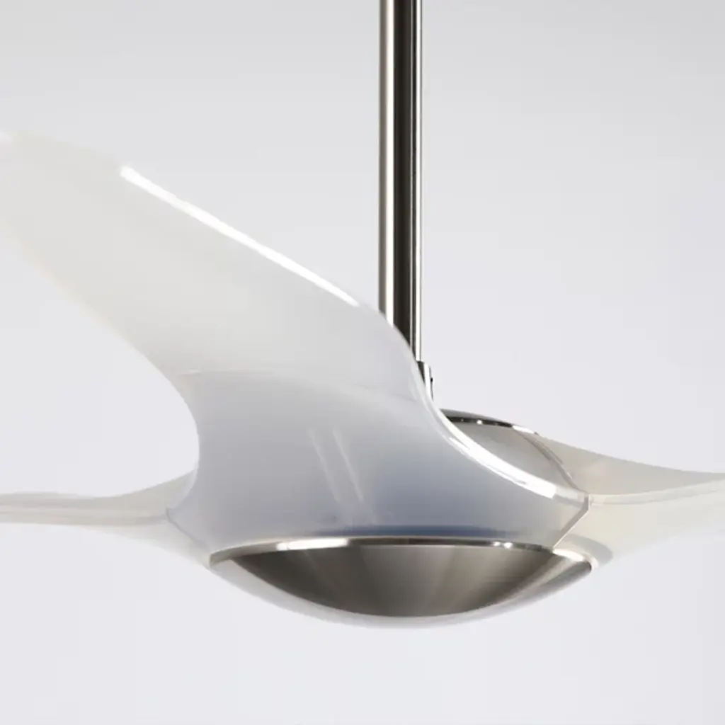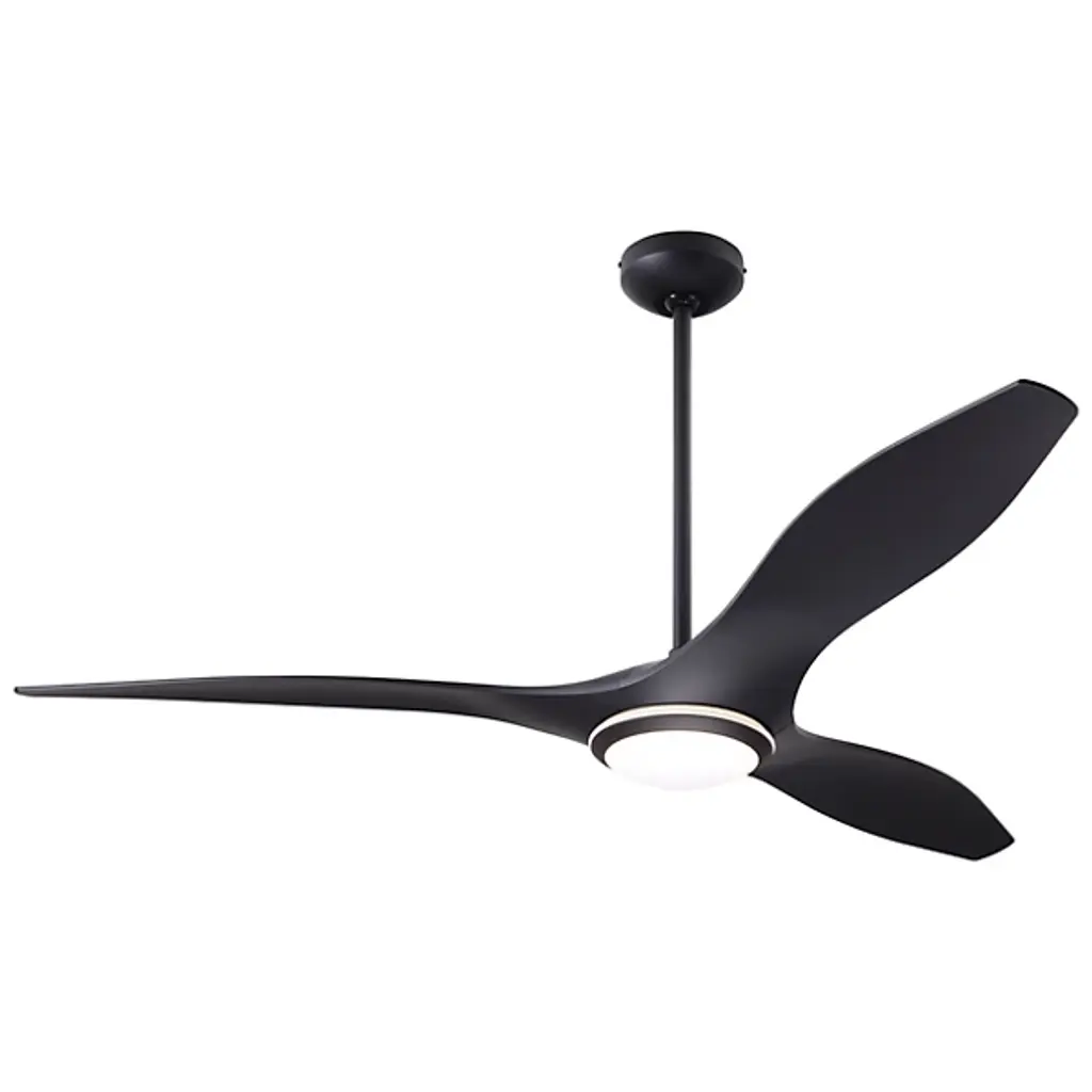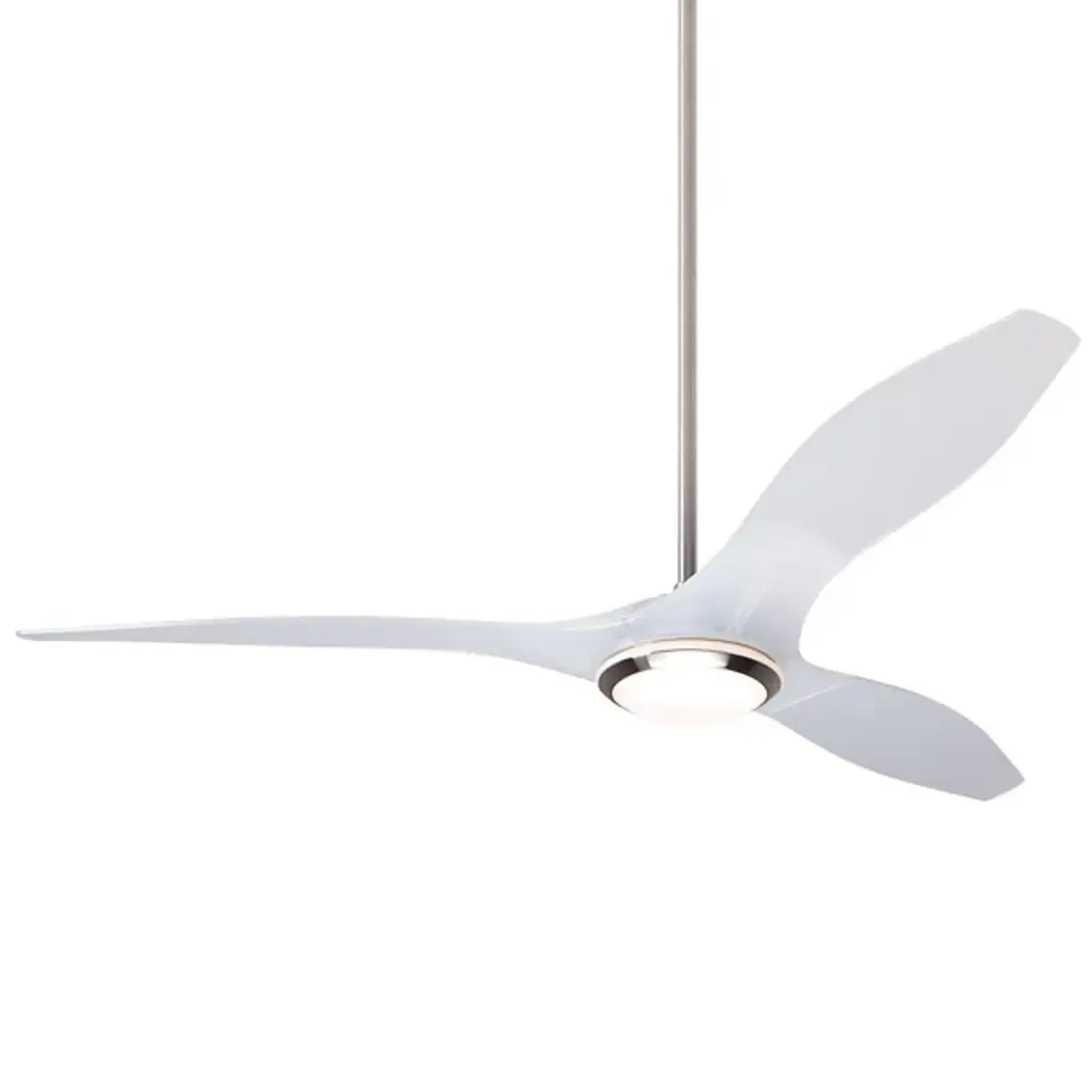 The IC/Brisa DC Ceiling Fan from Modern Fan Company adds a pleasing sculptural presence to inside spaces. An articulate modern design descending from a long downrod places a small, though strong DC motor in a central disc hub, accompanied by a damp-rated LED lamp set into the housing’s base. Three injection-molded ABS blades extend outward from the central hub, accompanied by the gentle glow of the lamping and embellishing the fan’s otherwise simple design with their inspired curvature.