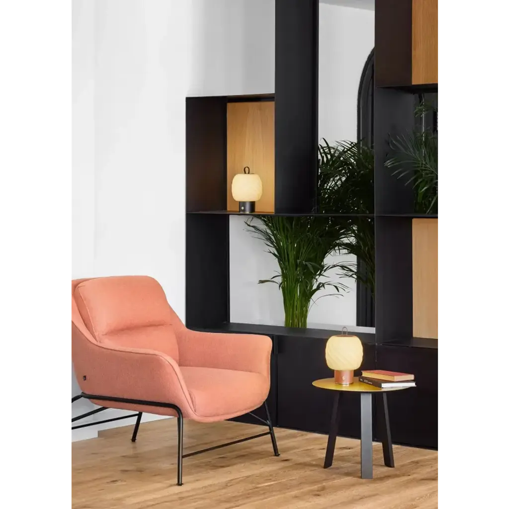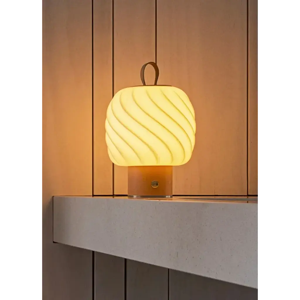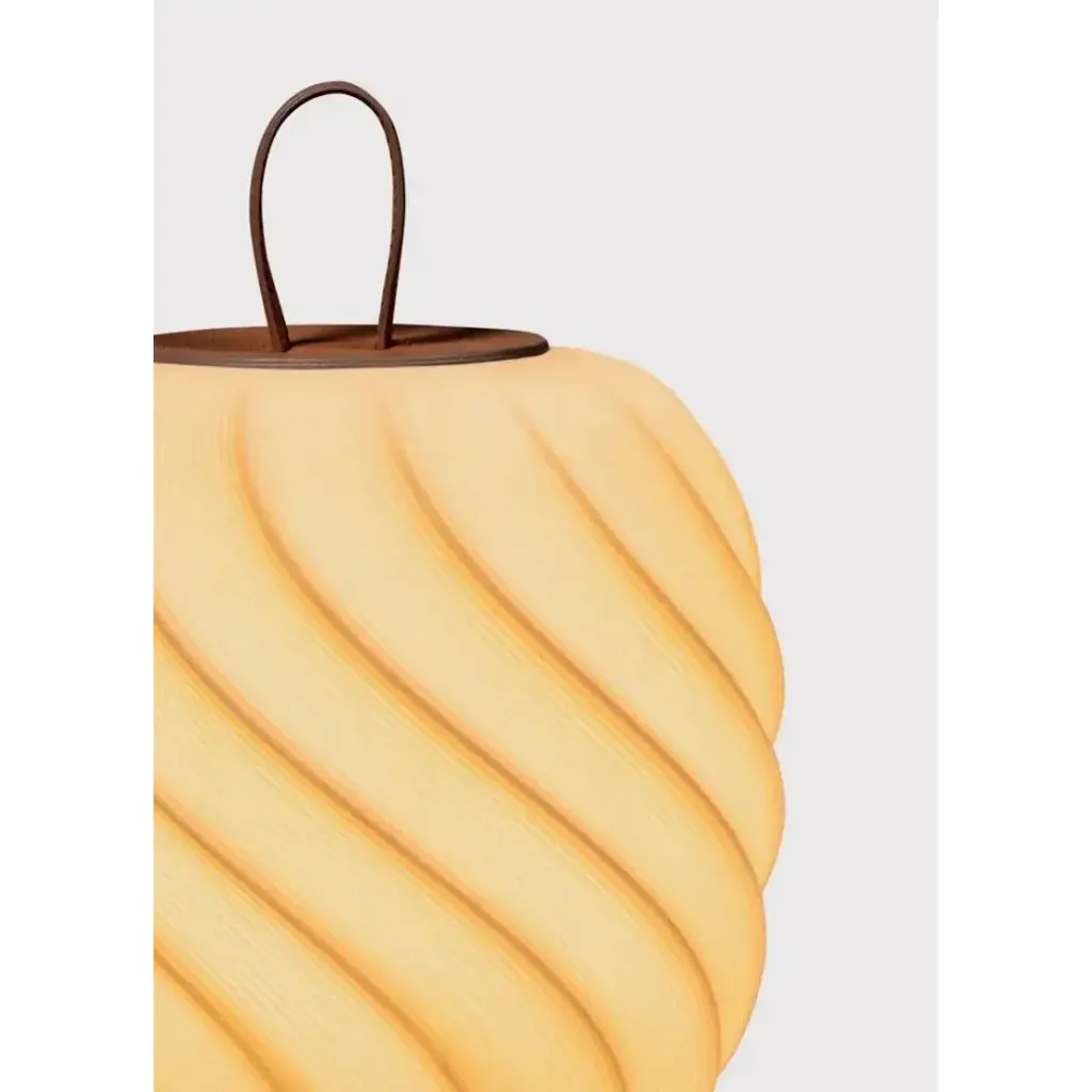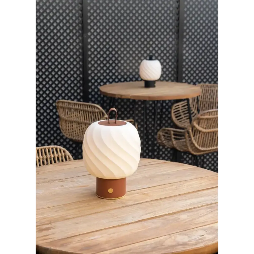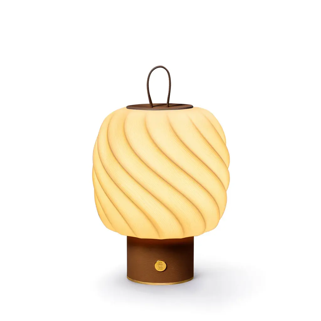 This cordless lamp is made in matte white porcelain and has a LED light inside. Thanks to the translucent quality of porcelain, when the light is switched on, the subtle smooth lines etched by hand on the surface are brought out. The base is lined with brown leather and comes with a cover and a handle in the same material and color, which allows the lamp to be hung like traditional Japanese paper lanterns. The front of the base has a gilded plate with the Lladró flower logo which acts as the touch switch for the lamp and a dimmer to regulate the intensity of the light. An iconic Spanish brand, Lladro is a world leader in the creation of porcelain art. Started by brothers Juan, Jose and Vicente Lladro in 1953, the ceramic figurines were initially inspired by the works of great European manufacturers like Meissen and Sevres. Over time, a unique style was forged, consisting of elongated lines, a revolutionary single-firing method, and soft pastel tones.