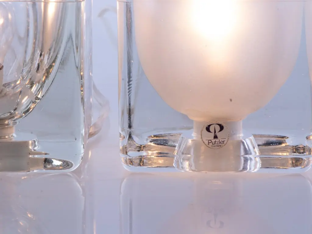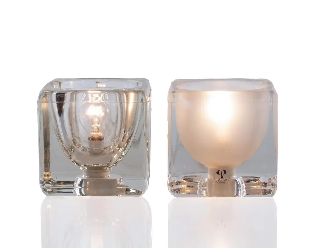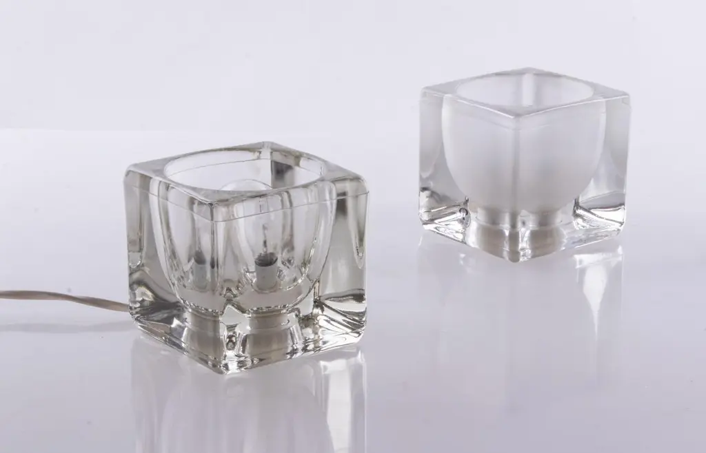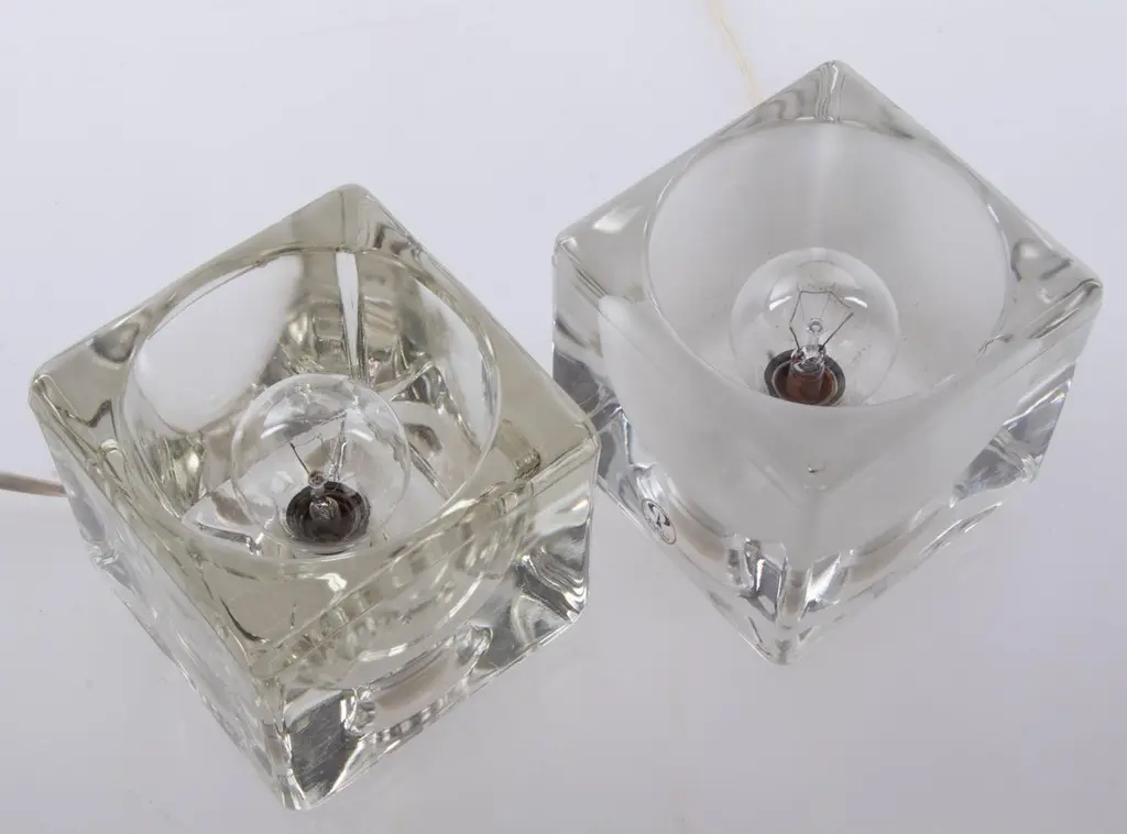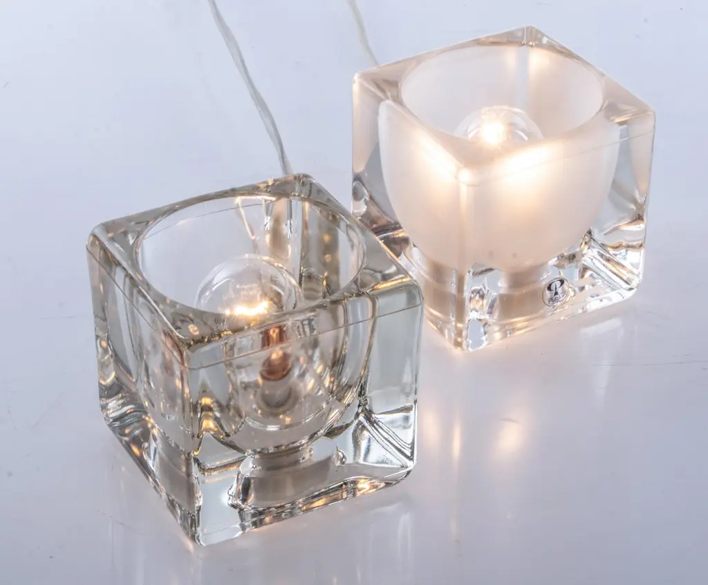 Elegant set of two individual iced glass cubist table lamps manufactured and marked by Peill & Putzler, Germany in the 1970s. Awarded design: iF-Design Award in 1975. Measures: 3.9" x 3.9" x 3.9" in. (10 x 10 x 10 cm). Lighting: takes one large Edison E27 base screw bulb per lamp. Wattage: we recommend up to 40w per bulb. Works on 220v as well as 110v. Condition: excellent vintage condition. Price is per set. Two sets available.Wiring: the lamp has been tested with US American light bulbs under 120v and works flawlessly, no tools or rewiring required. All our goods are originally wired for 220v. Delivery without bulbs. Shipping: in order to ensure safe transport, the lamp will be dismantled and carefully packed. Assembly required. We recommend expedited shipping, only.