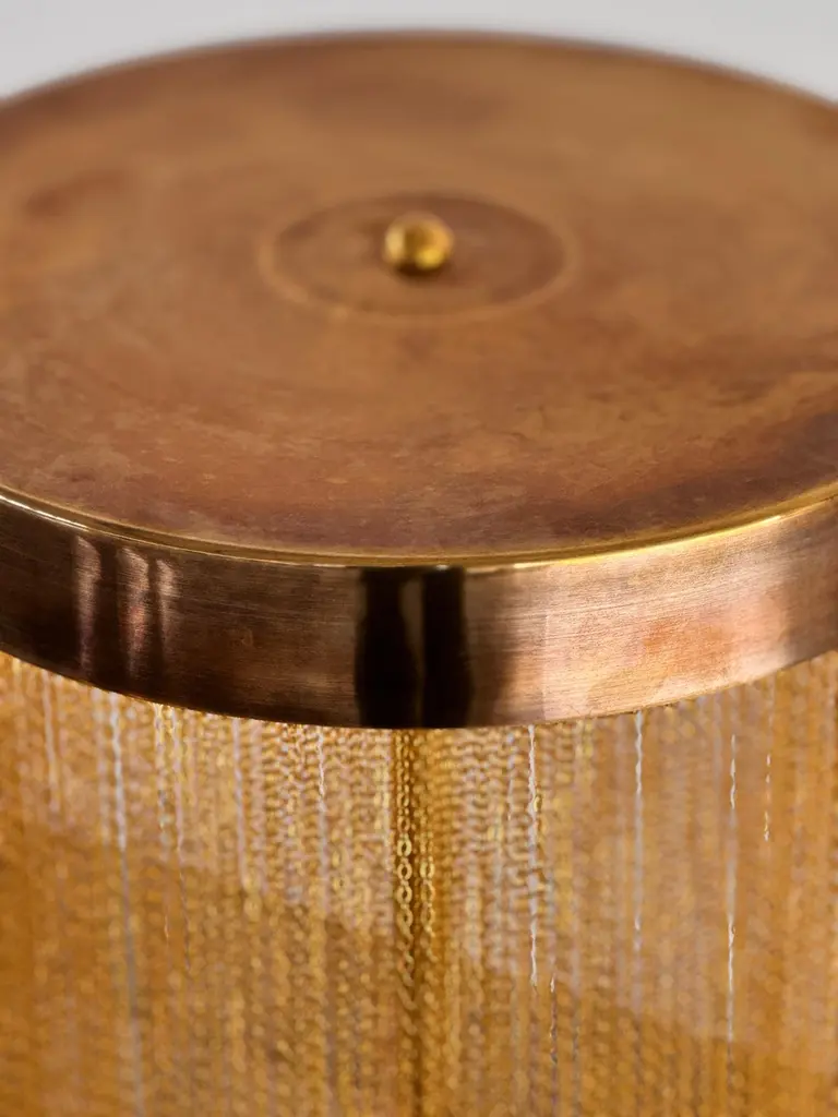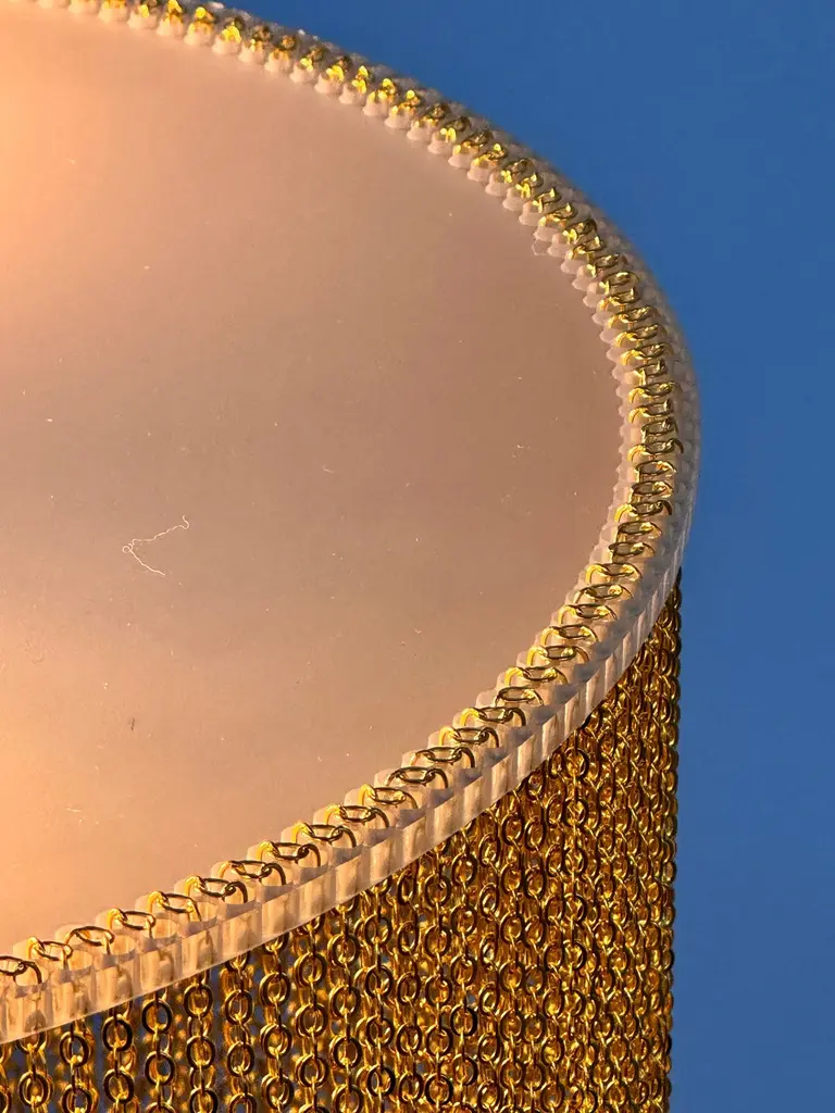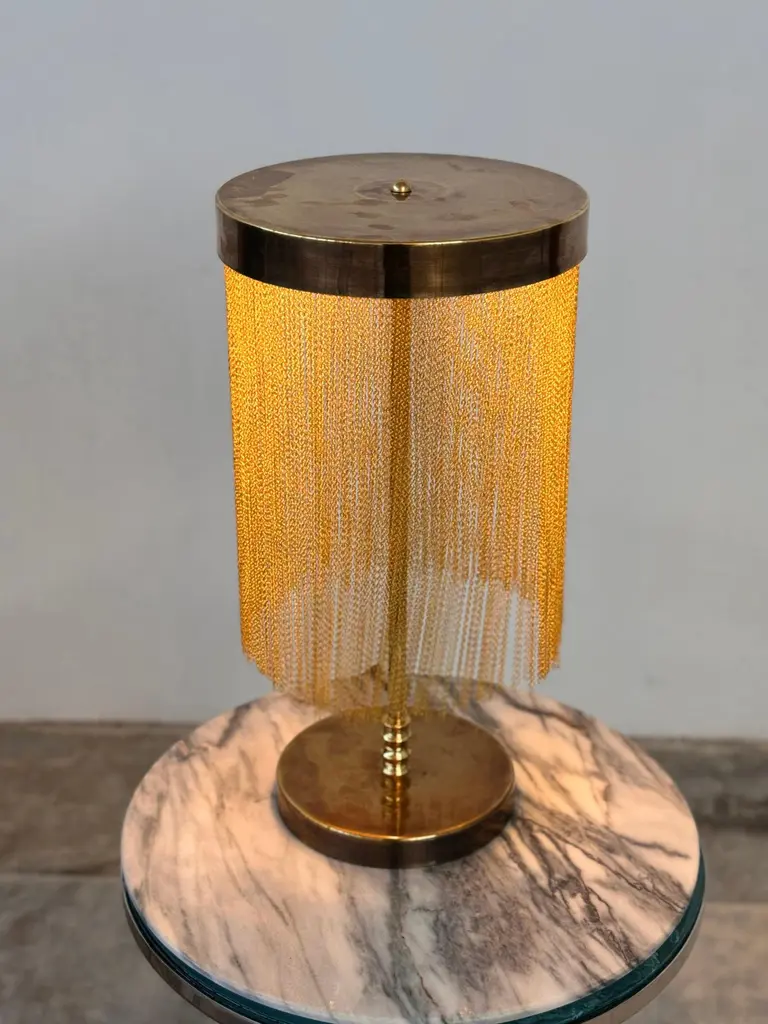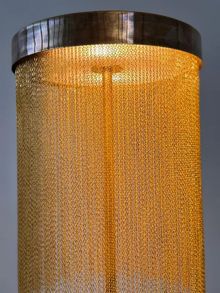 Handcrafted in portugal, the IDRIA-T3 features a cylindrical curtain of solid brass chains that delicately diffuses light into shimmering, golden stripes. The lamp’s meticulously handcrafted construction highlights the fine chainwork, paired with a minimalist, stepped brass base. A design that plays with texture, shadow and light.Materials:Solid brass structure, solid brass chain curtain (available in polished or varnished aged finish)Socket: 2 × G9Light source: LED only, max. 60W Voltage: 110–240VDimmable: Upon requestBulb included: NoOrigin: Portugal------------------------We’re an exhibition space and an online destination established by the passionate art director behind Jonathan Amar design studio.His gallery presents a harmonious mix of iconic and engaging 20th-century pieces and bespoke contemporary designs. With a strong focus on Italian mid-century modern, his success strives from sourcing objects with striking shapes, intricate techniques, and quality materials that cross the concept of time in the same way a Spirit does. Jonathan Amar being of French and Moroccan origin, the gallery is split between a small space in Paris and its headquarters in Rabat where the magical restoration work takes place.All our pieces are expertly restored at our atelier and we only offer items that will last another lifetime. Our workspace includes a luminous gallery, a restoration atelier where our team of experts in metalwork, woodwork, upholstery, and electrics; restore each piece with the mission to honor a balance between restoration and preservation. There may be natural light age-related wear but never any hard damages or structural issues. Since the launch of our gallery in late 2017, we have exported over 1100 items to buyers in 21 countries located in all four corners of the world from Europe and North America to Asia and Australia. In the United States alone, we have ensured the delivery of over 650 pieces of all sizes (from big dining tables to small decorative objects) in 23 states.We take the utmost attention to our packaging by building robust made-to-measure boxes in our atelier with the aim of providing safe and cost-effective delivery prices for every client. Most deliveries arrive smoothly in less than 8 days. FYI the Morocco Free Trade Agreement (MAFTA) went into effect on January 1, 2006. Under the agreement, most Moroccan goods enter the United States duty-free. Please don’t hesitate to contact us if you have any question!