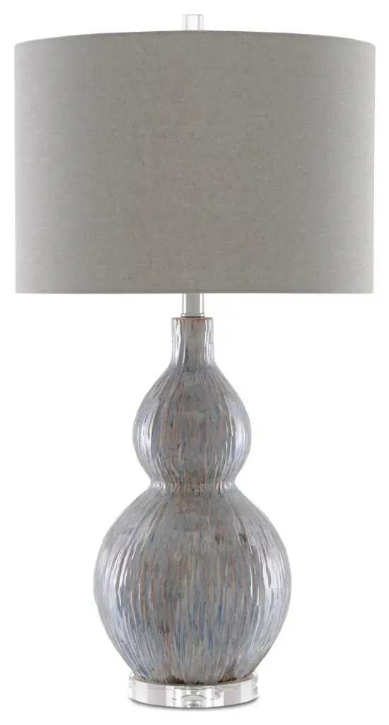 The gourd shape of our Idyll Table Lamp has been realized in porcelain. The striated surface in gray, blue, and taupe tones is texturally rich. The gray lamp sits atop a clear optic crystal base and is fitted with a gray shade.Number of Lights: 1Type of Bulb: A StandardBulb Wattage: 150Bulbs Included: No