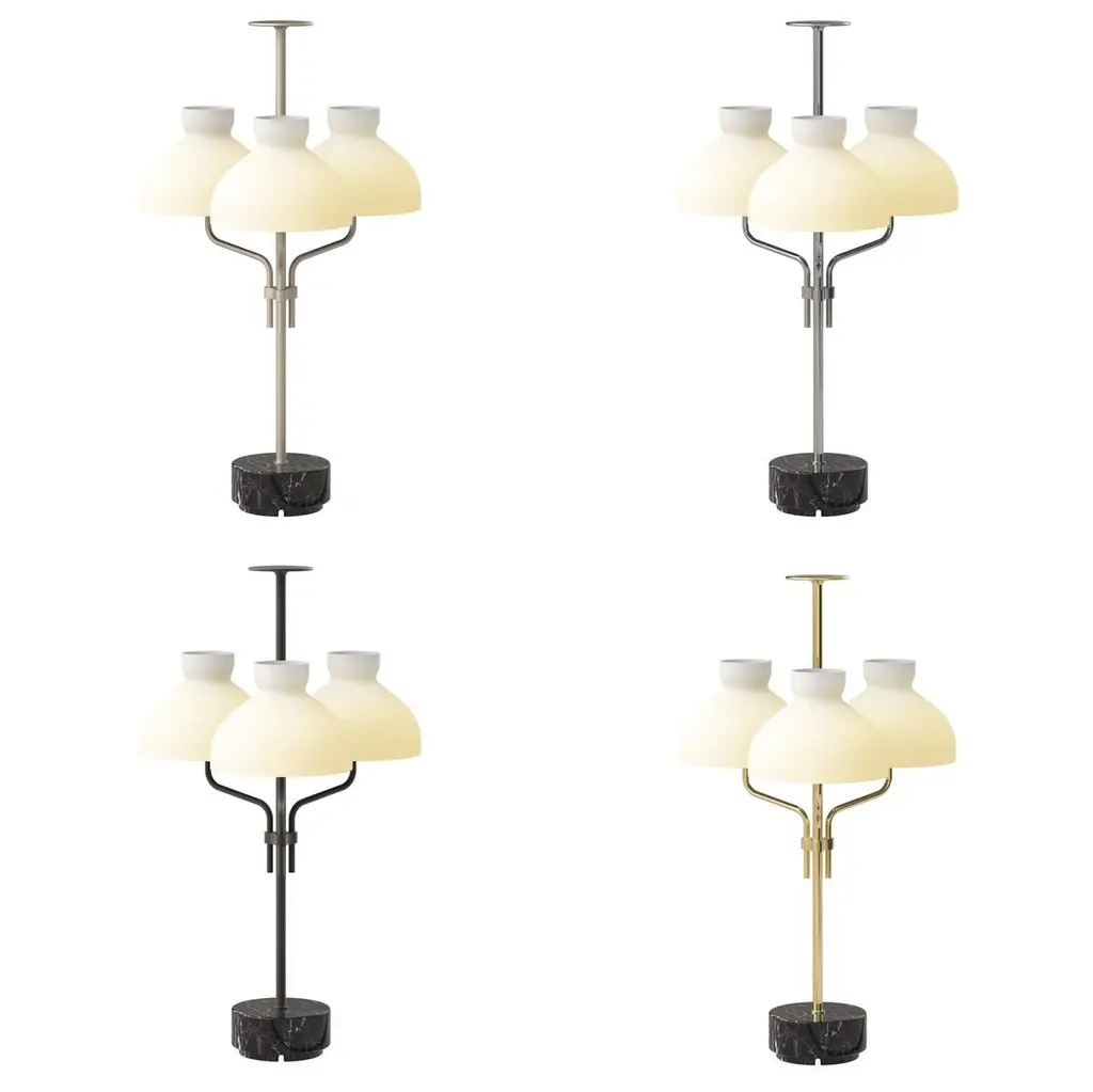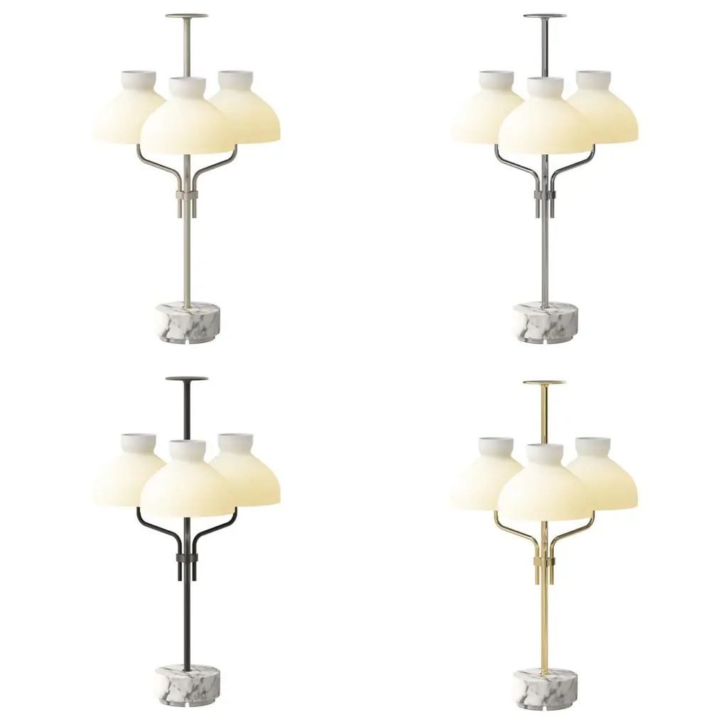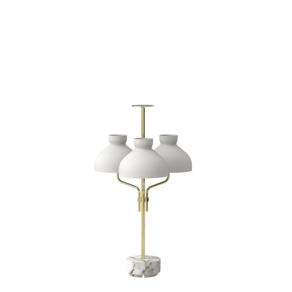 Ignazio Gardella 'Arenzano Tre Fiamme' Table Lamp in White Marble and Brass.Ignazio Gardella was one of the leading figures in Italian twentieth-century architecture. A graduate of the Politecnico di Milano, he founded Azucena with Luigi Caccia Dominioni and Corrado Corradi Dell’Acqua in 1947. A renowned architect, he continued producing iconic furniture and lighting designs until the 1990s.Originally designed by Gardella in 1963 for Azucena, this authorized Tato Italia re-edition is executed in polished brass with three Venetian blown opaline glass diffusers.Price is per item. Available in unlimited quantities in choice of brass, chrome, satin bronze, or satin nickel stem with black Marquinia or white Carrara marble base. Prices vary; kindly inquire for more information. This listing is for the brass variant with white marble base.In stock lead time 12-14 weeks. Out of stock lead time can add an additional 10 weeks or longer. Please note that inventory availability subject to change without notice. For time-sensitive orders, kindly inquire prior to purchasing.Each shade accommodates 3x US E12 candelabra base bulbs max 5W LED, (nine total bulbs, not included). Not UL listed, but recommended UL listing possible from an authorized 3rd party vendor for an additional cost. Contact us for more information.Made to order. All sales final.